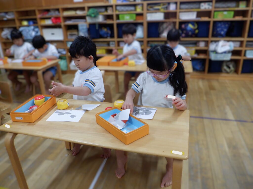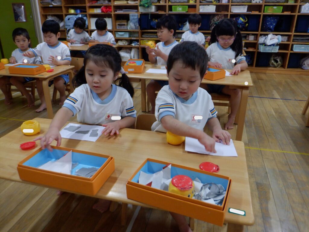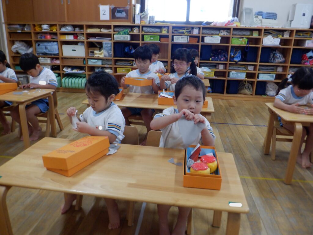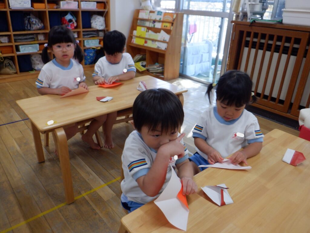 折り紙は、どんぐり作りに挑戦!!先生のお手本をよく見て折ることが出来ました!