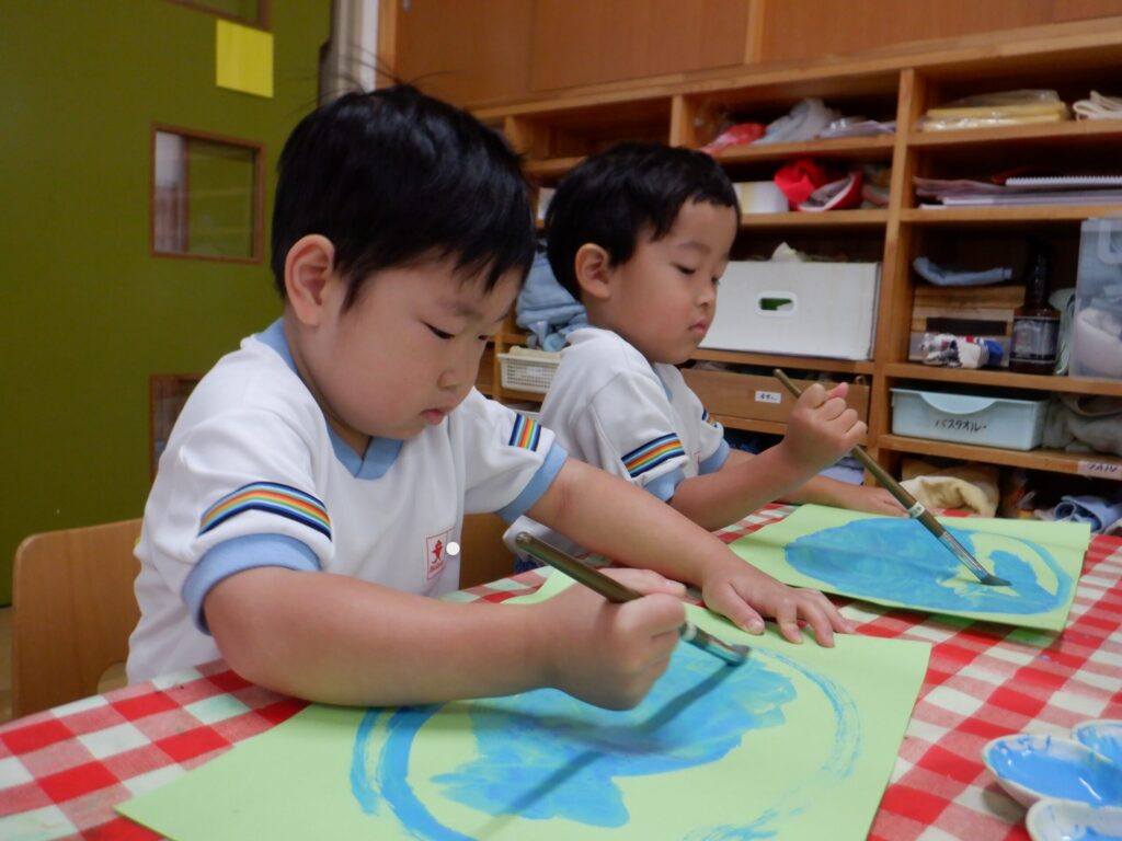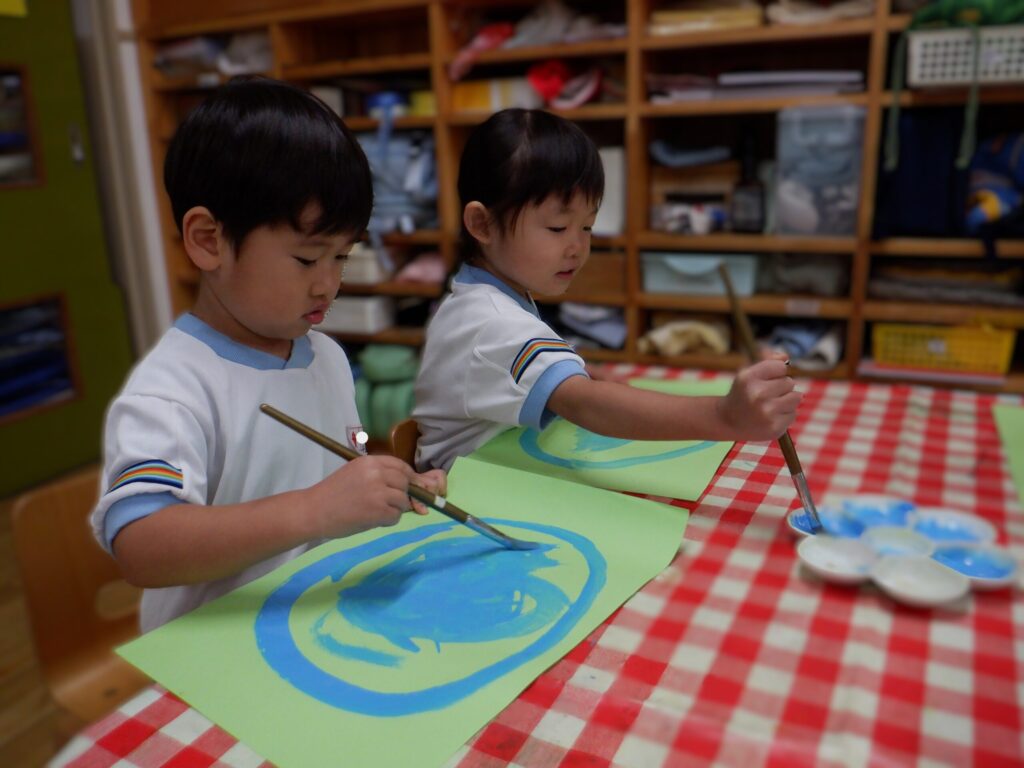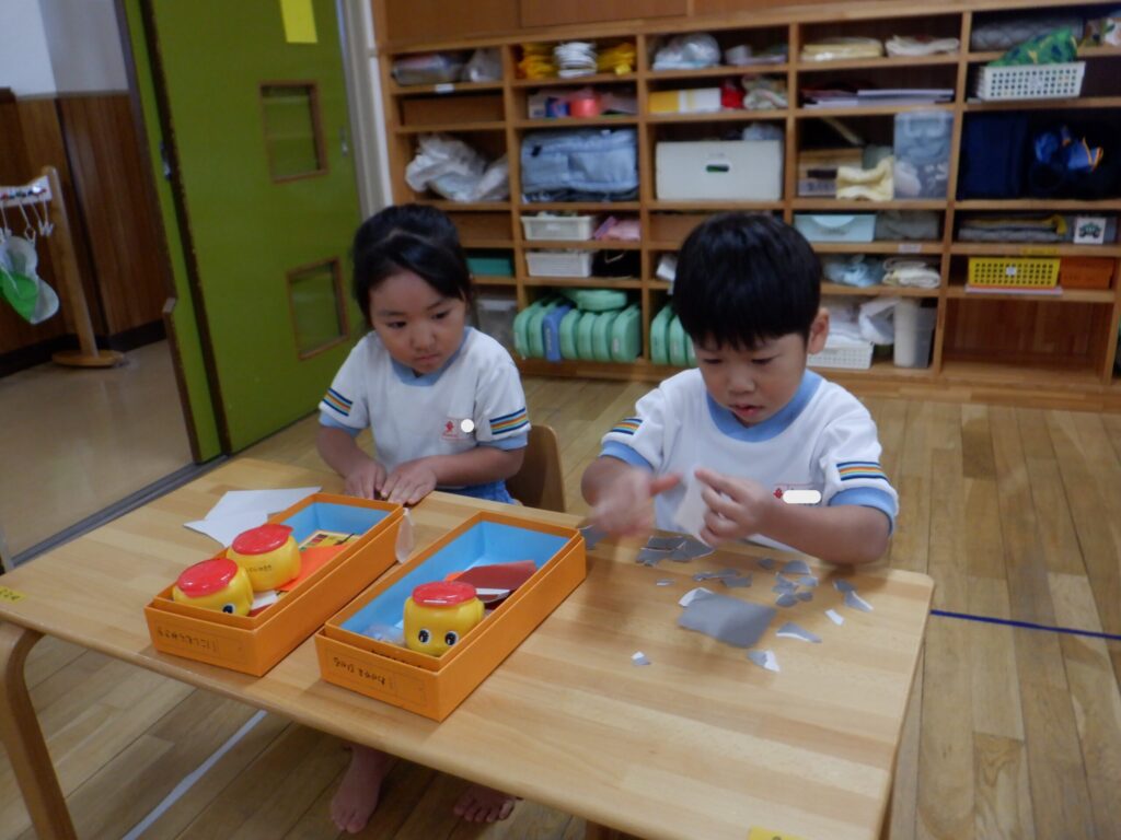 どじょうの顔は折り紙をちぎり、糊で貼りました。ちぎるのが細かく指先を使って破っていました。