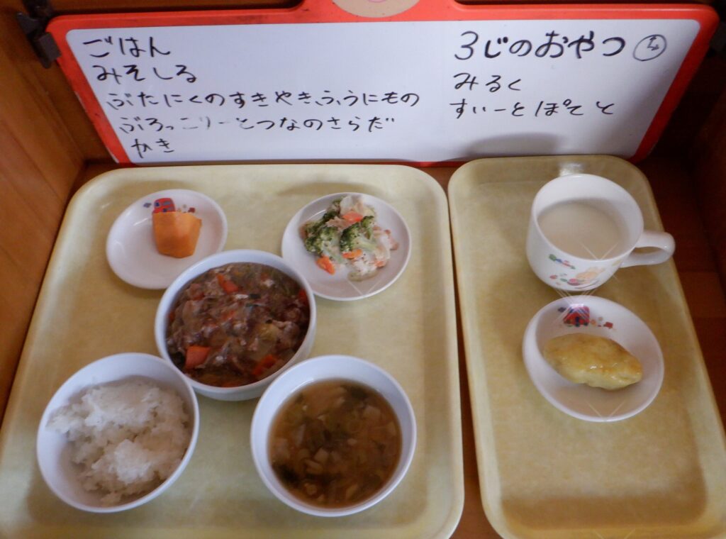 ・ごはん ・みそ汁 ・豚肉のすき焼き風煮物 ・ブロッコリーのツナサラダ ・柿