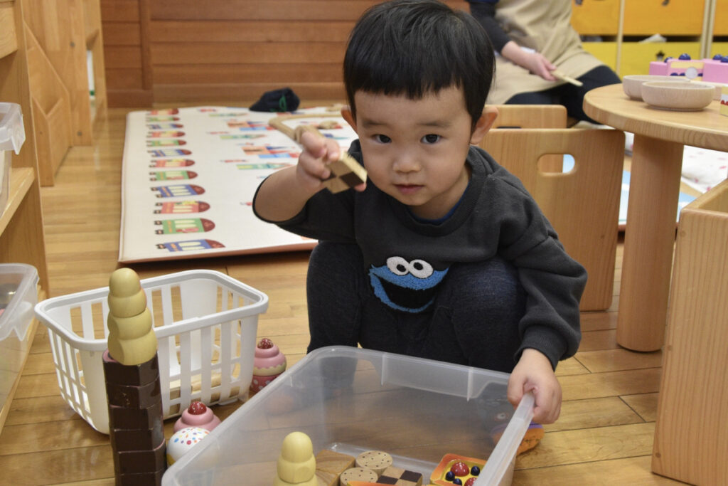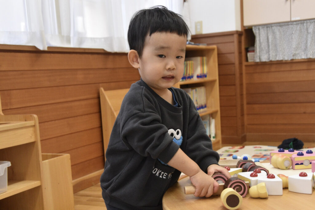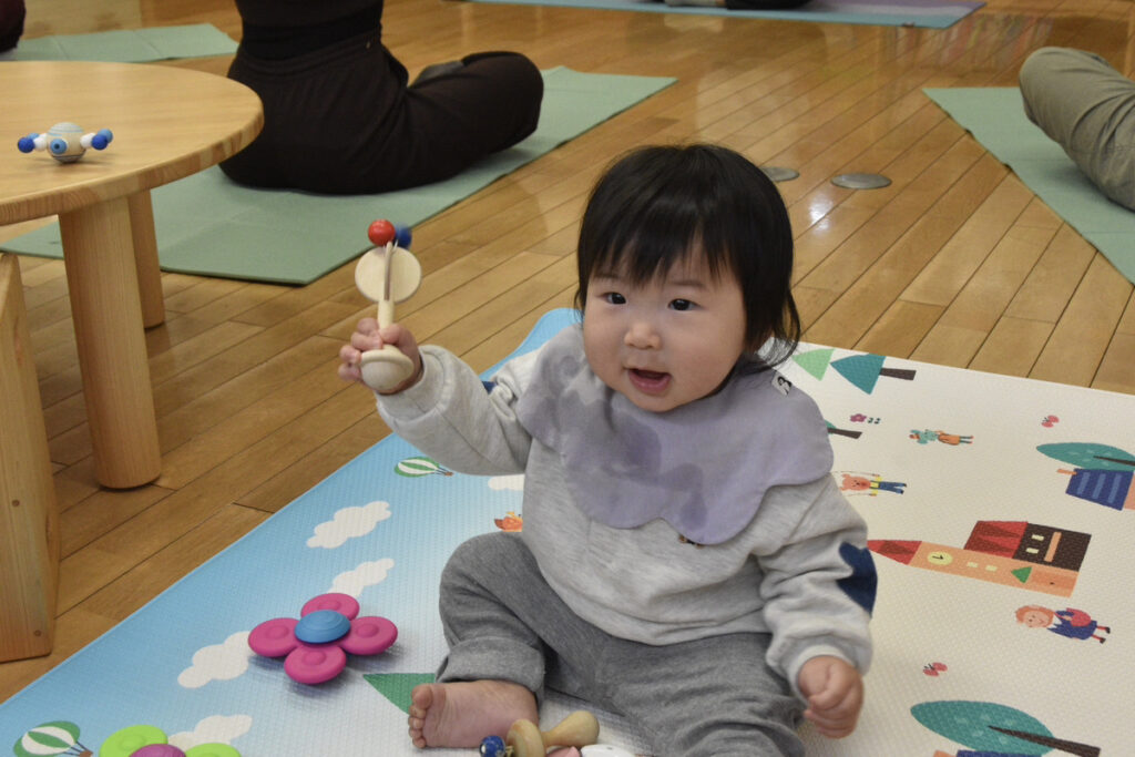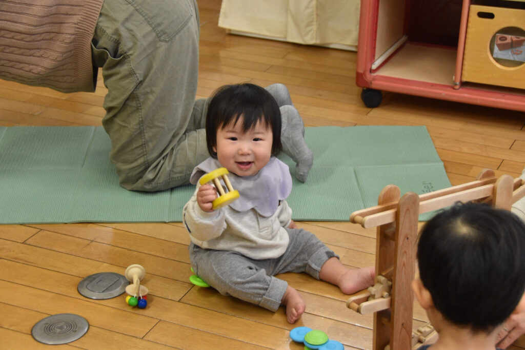 先生の真似っこをして鈴のおもちゃを鳴らしたり、おままごとをして「見て〜」とカメラにポーズ😊