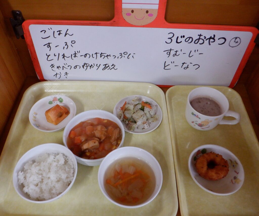 本日のおやつは、手作りのスムージーとおからの入ったドーナツです。