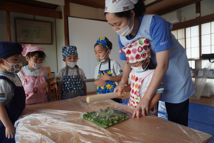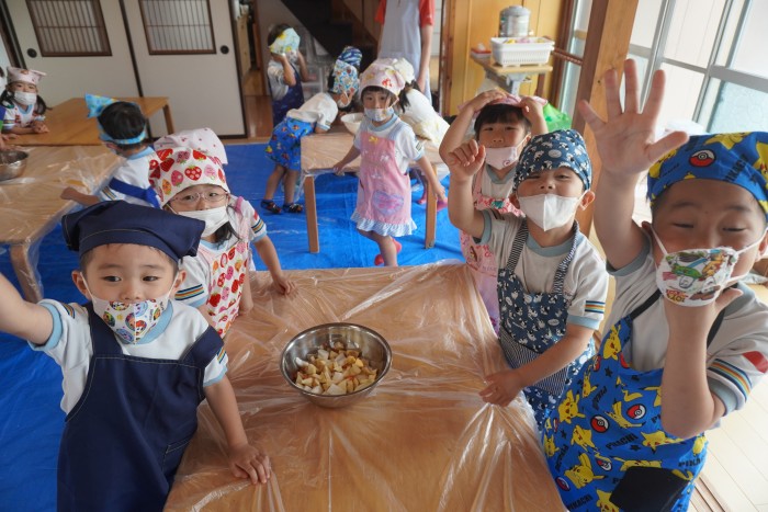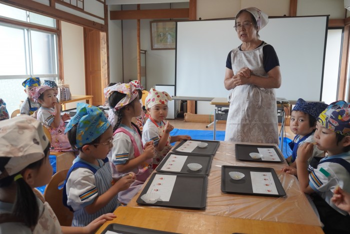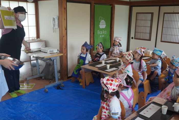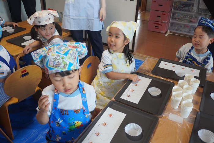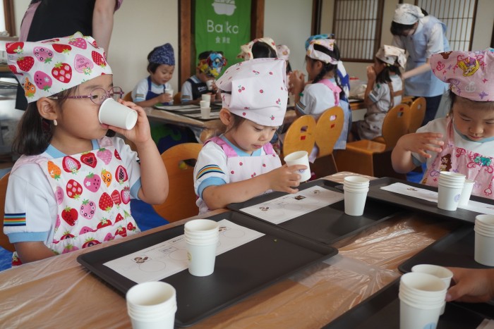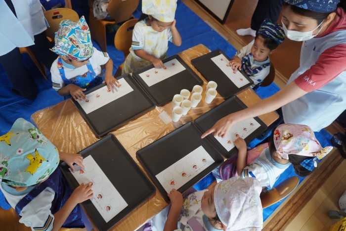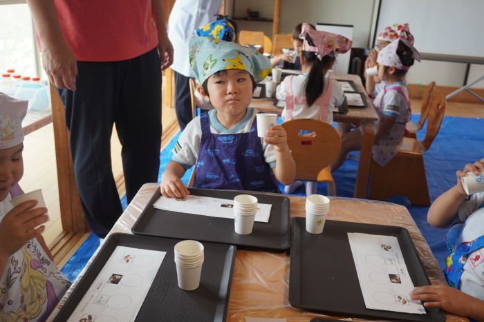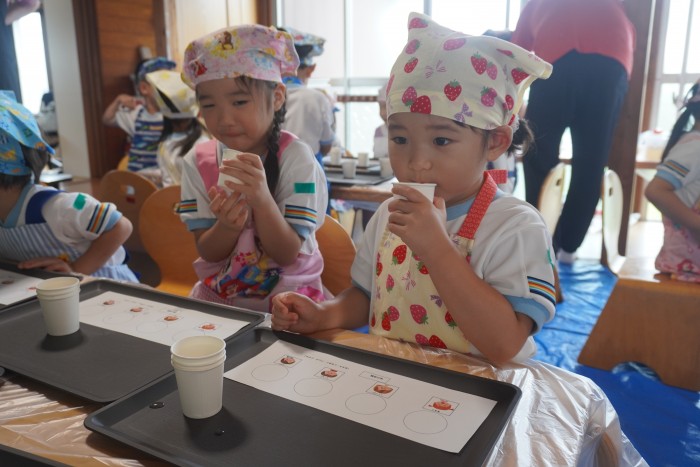 エプロンに着替えて智子先生のお話を聞きながら自分の舌で味を感じながら「これは何味かな?」という質問に「すっぱい!」「あまい!」と味覚をしっかり感じ取る子ども達。