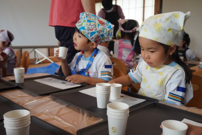 しいたけやにぼしだしも一つずつ考えながら紙コップを置いていました。