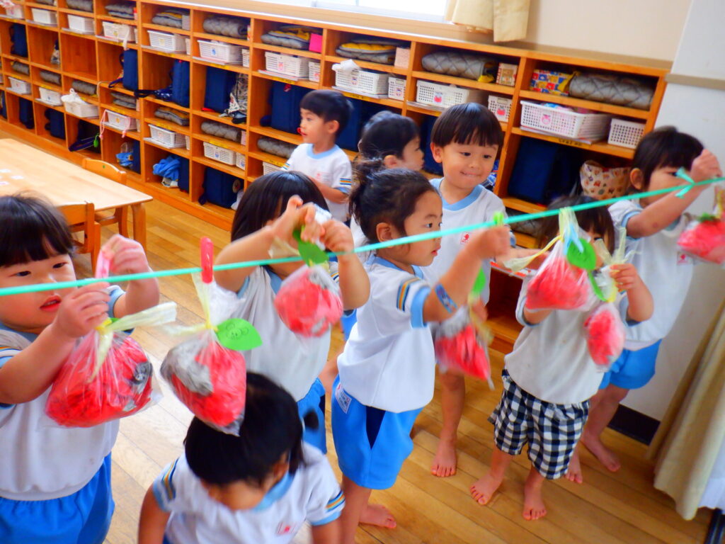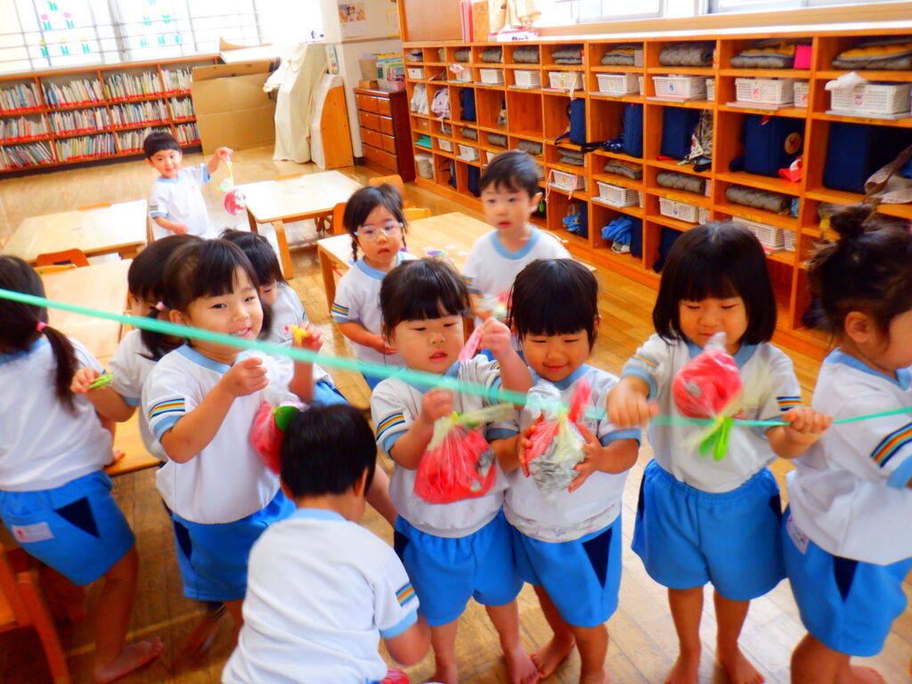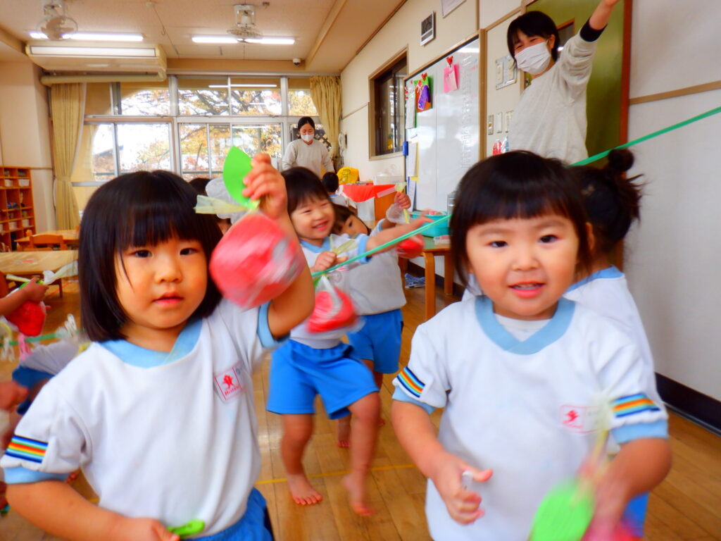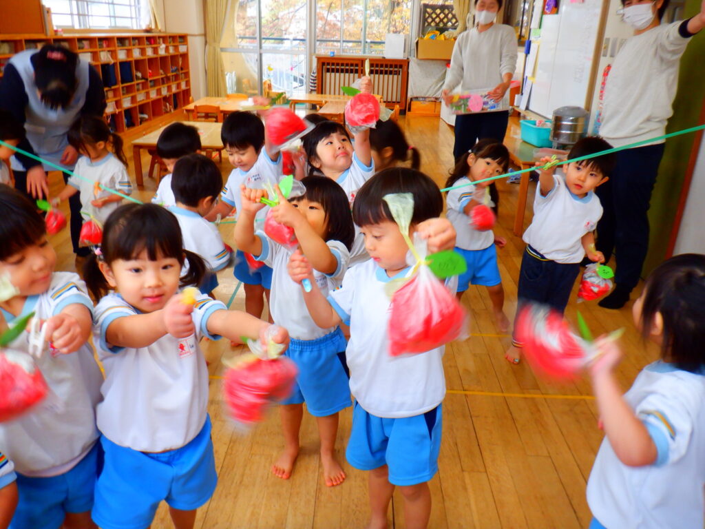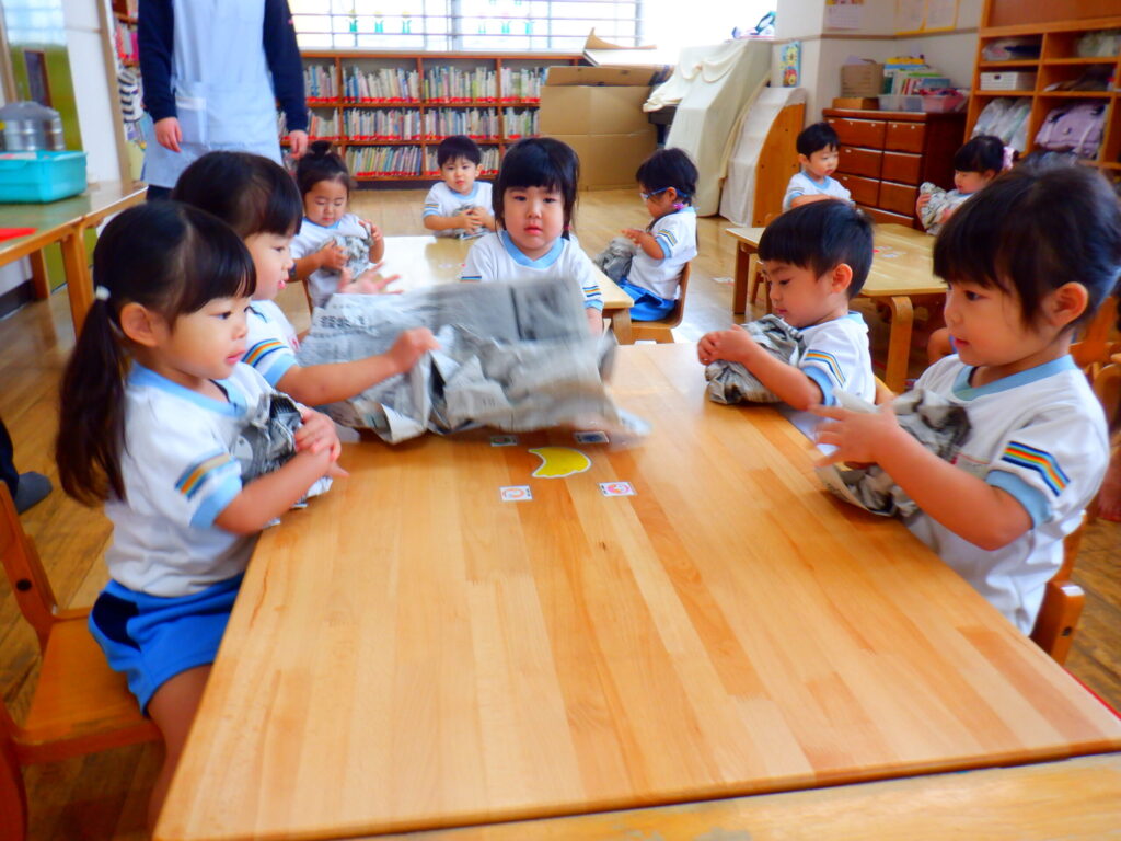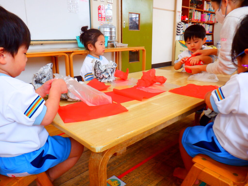 新聞紙とお花紙でリンゴを製作し、リンゴ狩りをおこないました♪