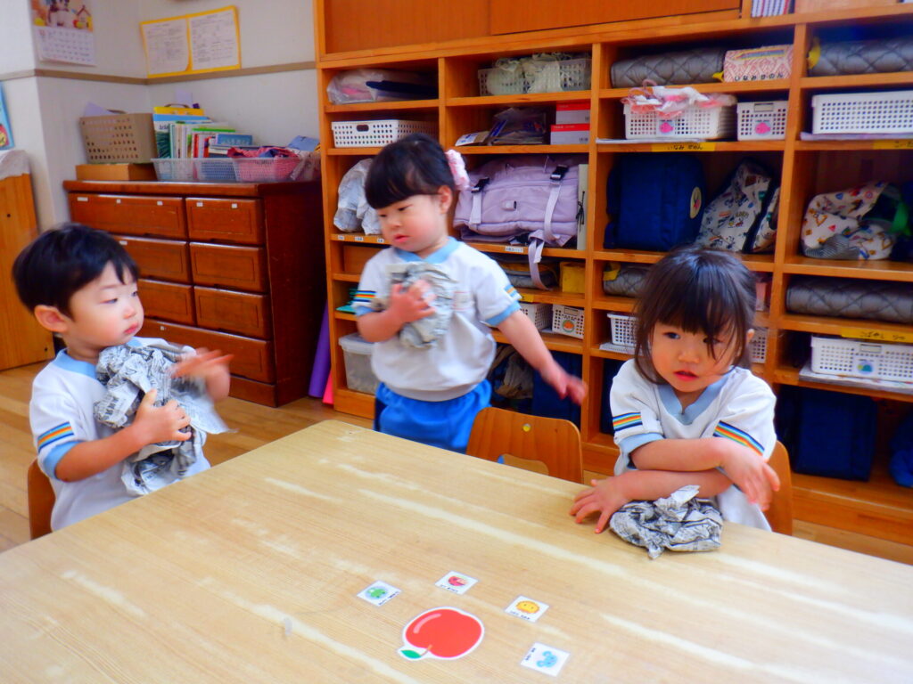 洗濯ばさみにつないだら、おべんとうバスを歌いながら、リンゴ狩りに出発♫