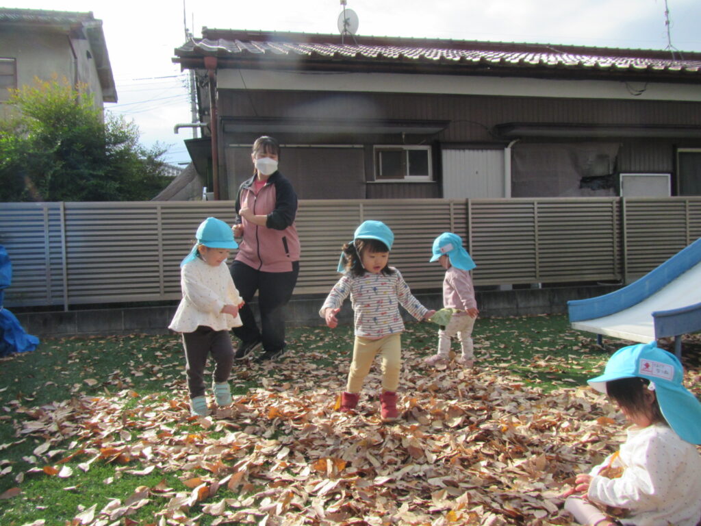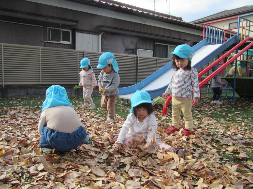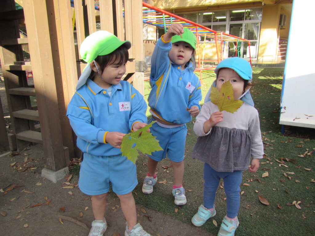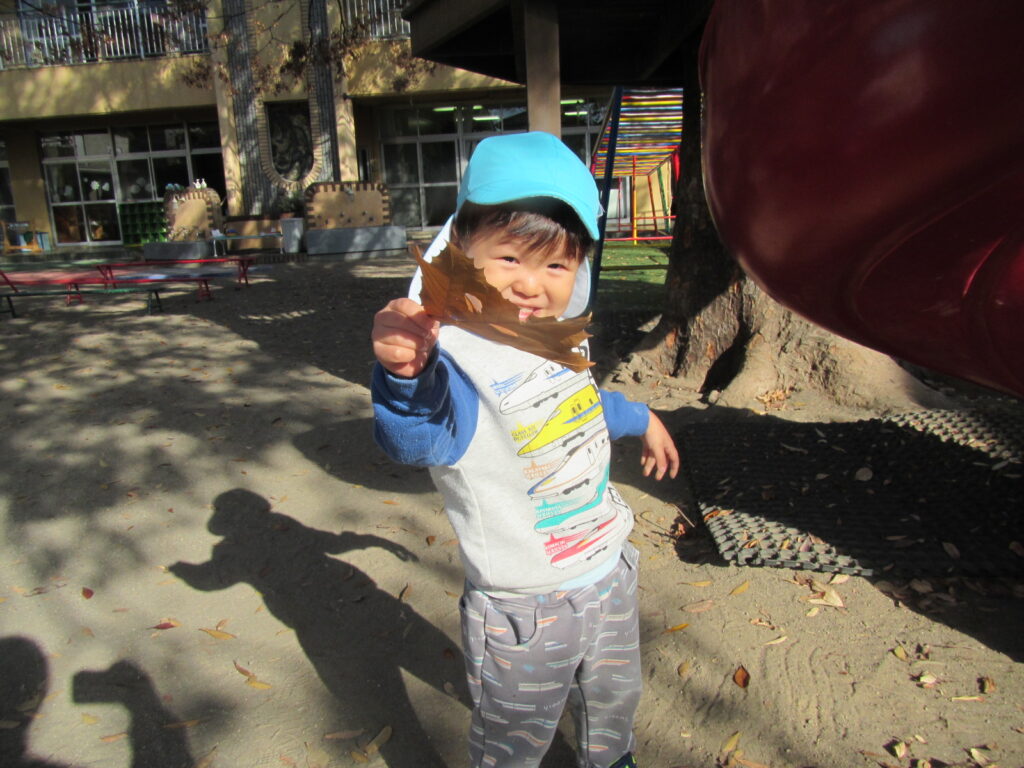 大きな葉っぱを見つけてお面にして遊んだり、落ち葉で遊んでいます😊