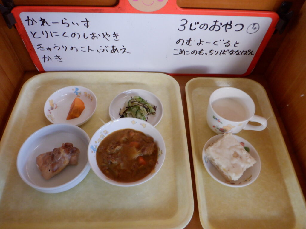・カレーライス ・鶏肉の塩焼き ・キャベツと胡瓜の昆布和え ・柿
