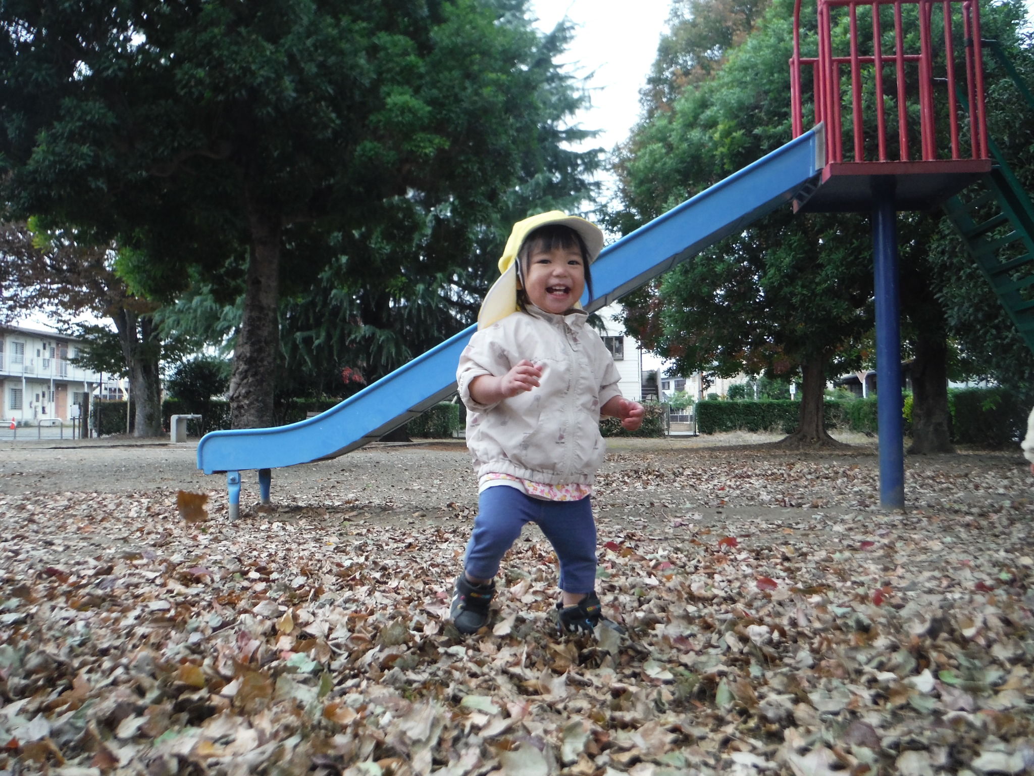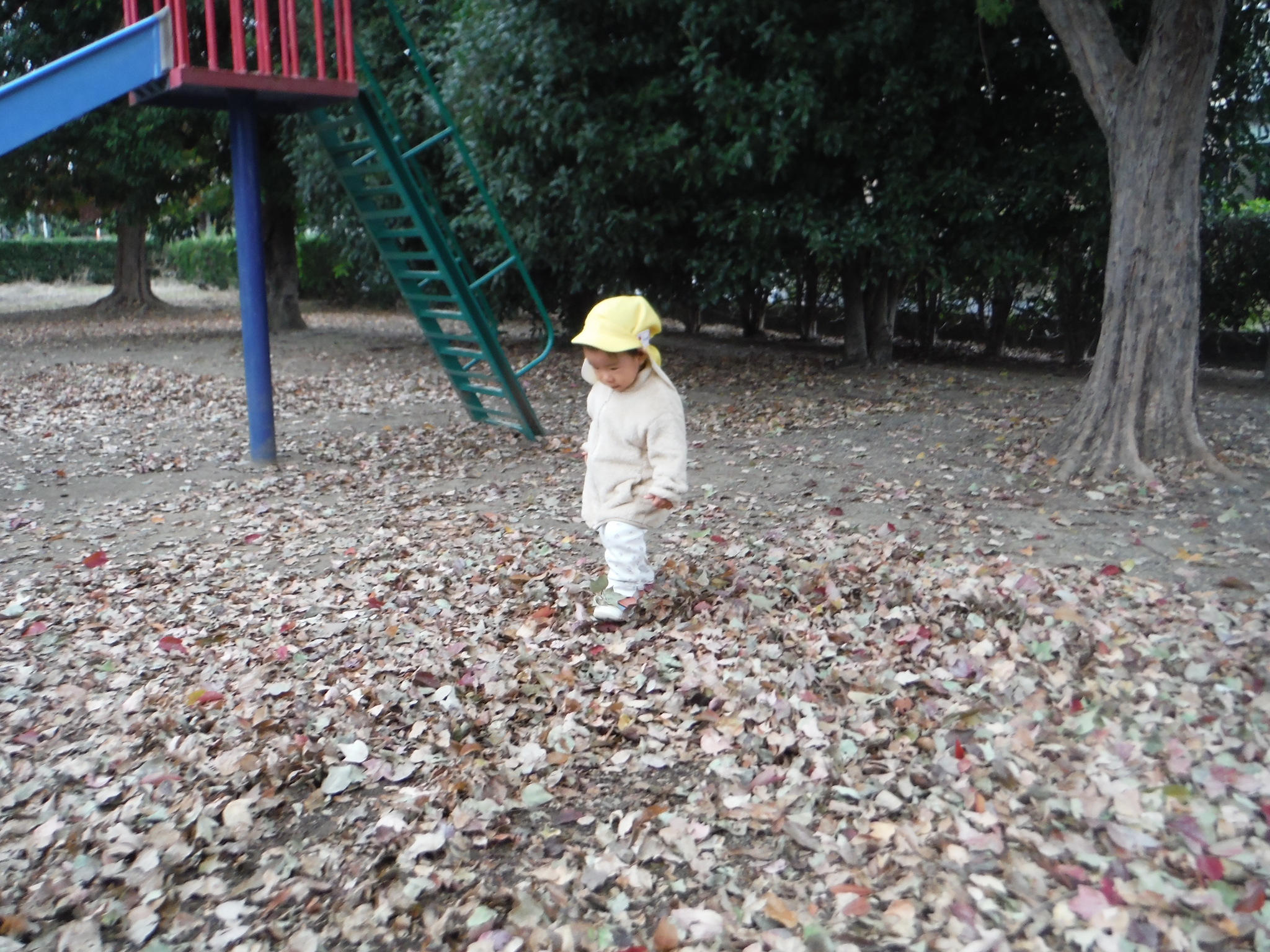 近くの公園までお散歩に行きました。葉っぱが沢山落ちていたので踏み入ってみました。