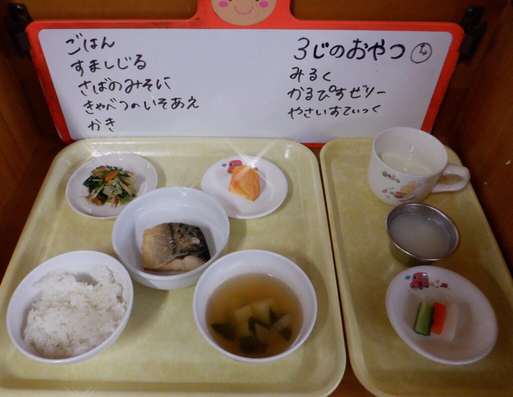 ・ごはん ・すましじる ・さばの味噌煮 ・キャベツの磯和え ・柿