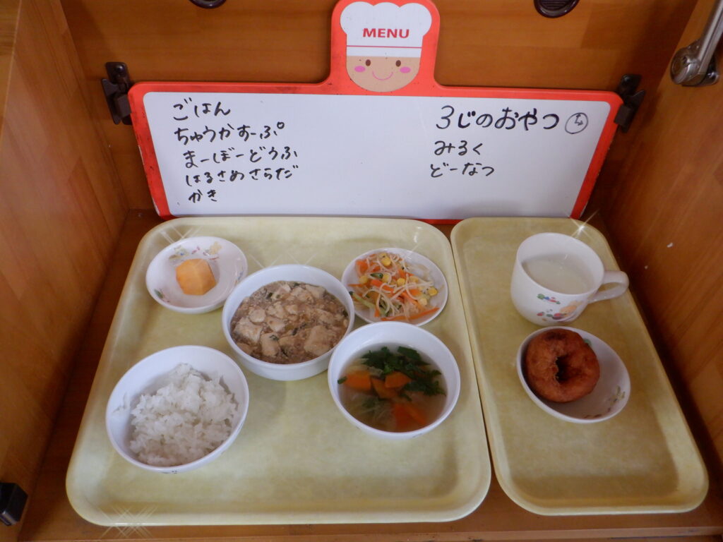 ・ごはん ・中華スープ ・マーボー豆腐 ・春雨サラダ ・柿