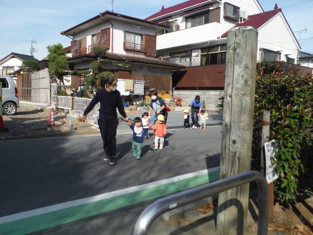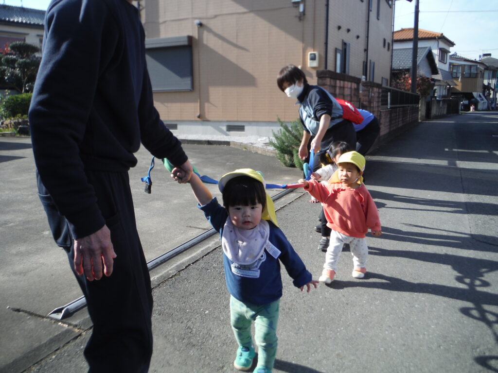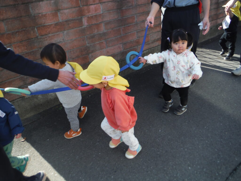 お散歩の様子です。お散歩ロープの練習中!お兄さんたちみたいに掴んで歩けるかな?