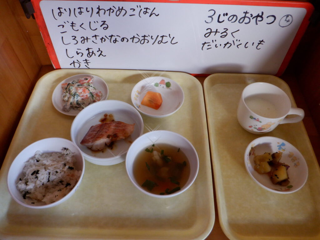 ・ハリハリわかめ御飯 ・五目汁 ・白身魚の香り蒸し ・白和え ・柿