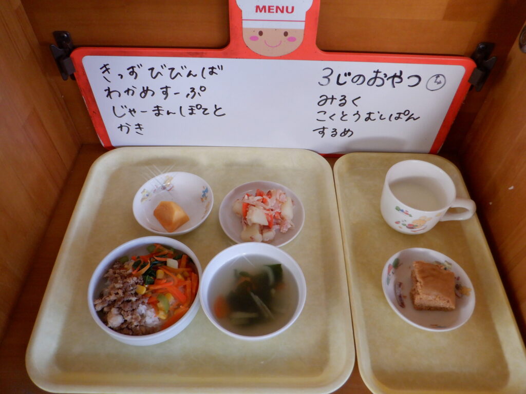 ・キッズビビンバ ・わかめスープ ・ジャーマンポテト ・柿