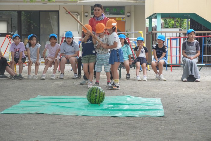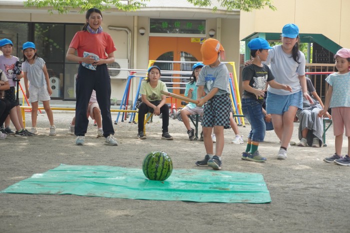 学童のお友達も「スイカ割りはじめて♪」とわくわくしながら園庭に集まってきました!