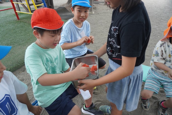 学童のお友達が割ってくれて、みんな嬉しさにスイカに集まる様子がありました。