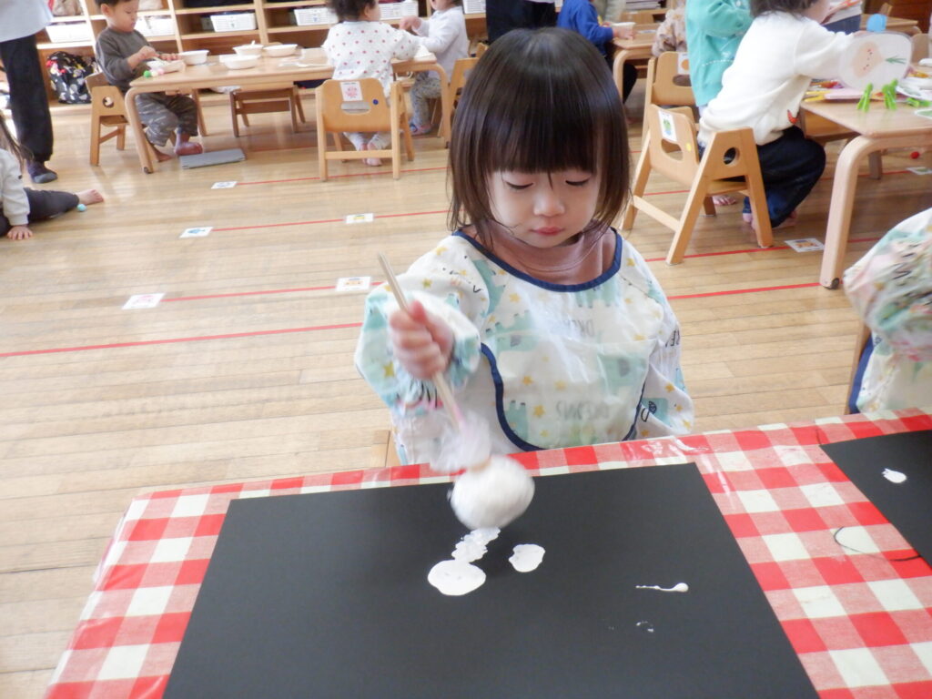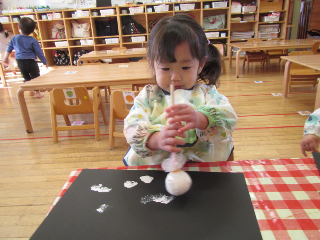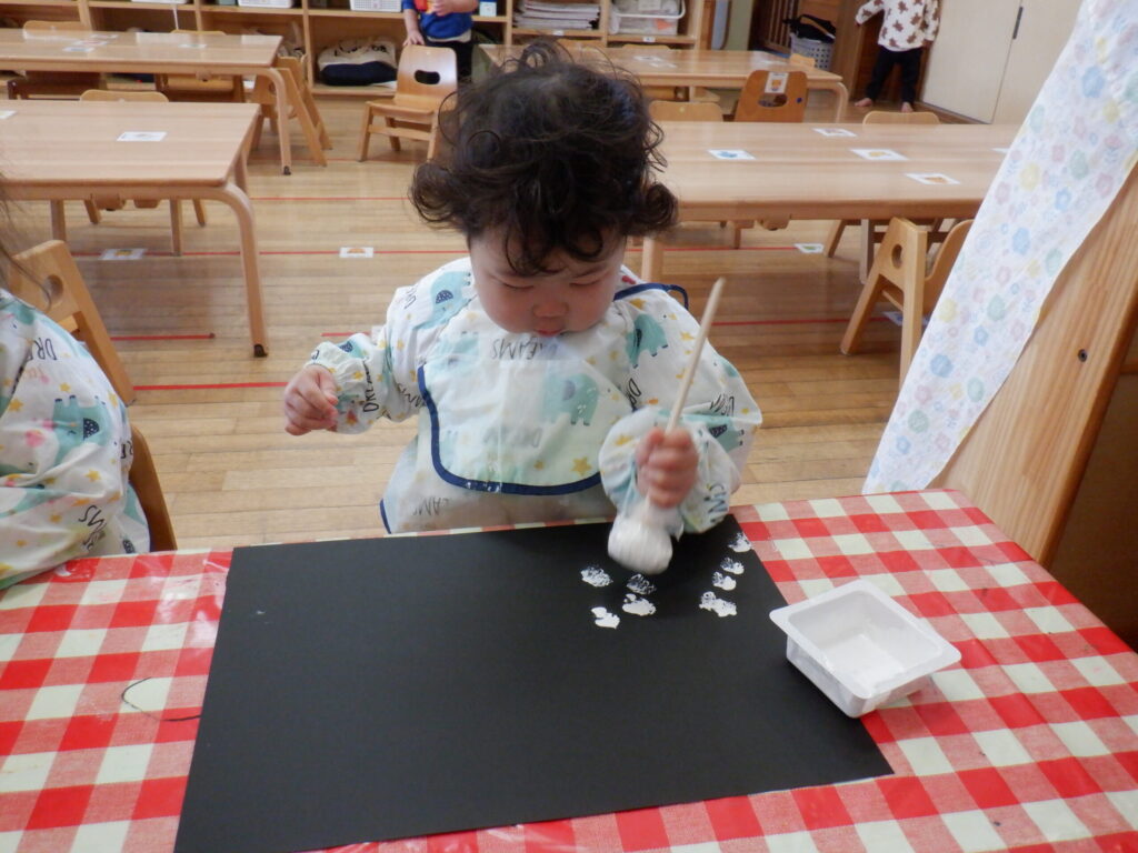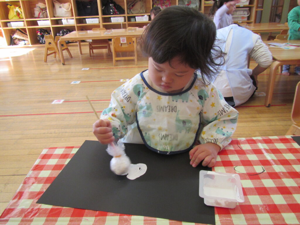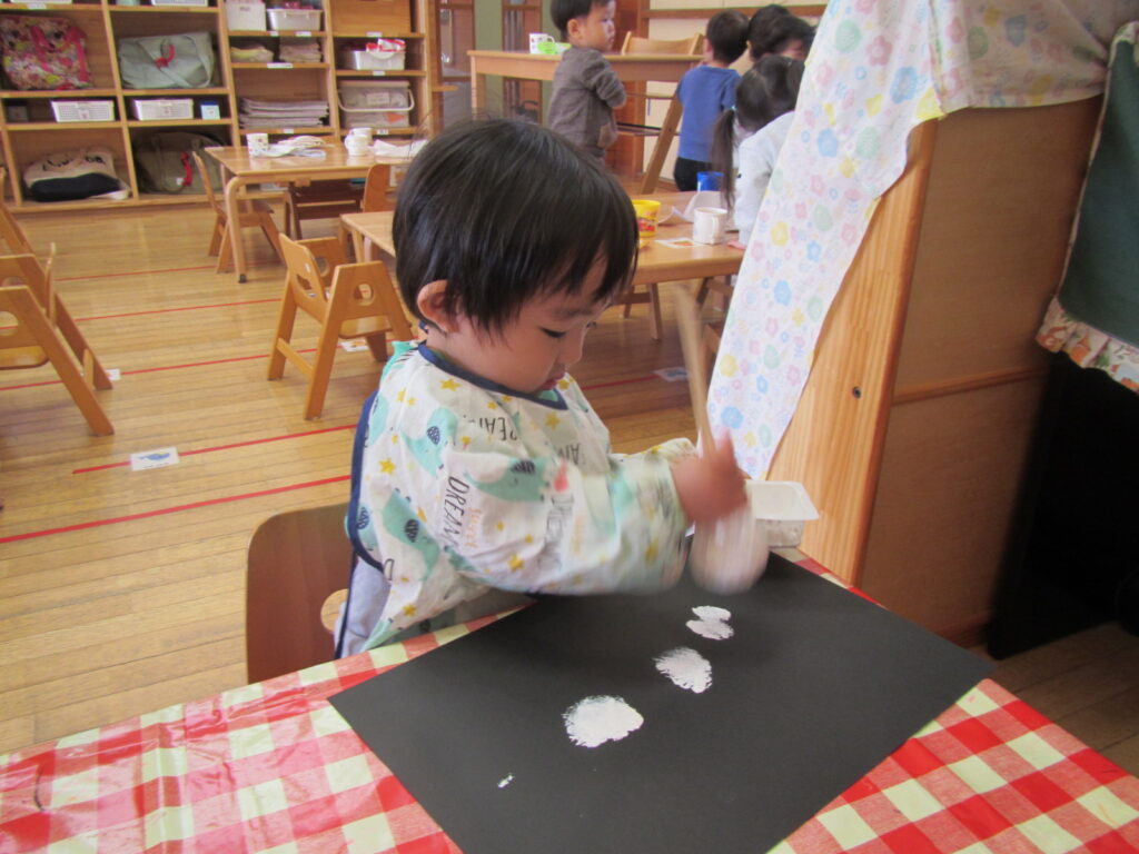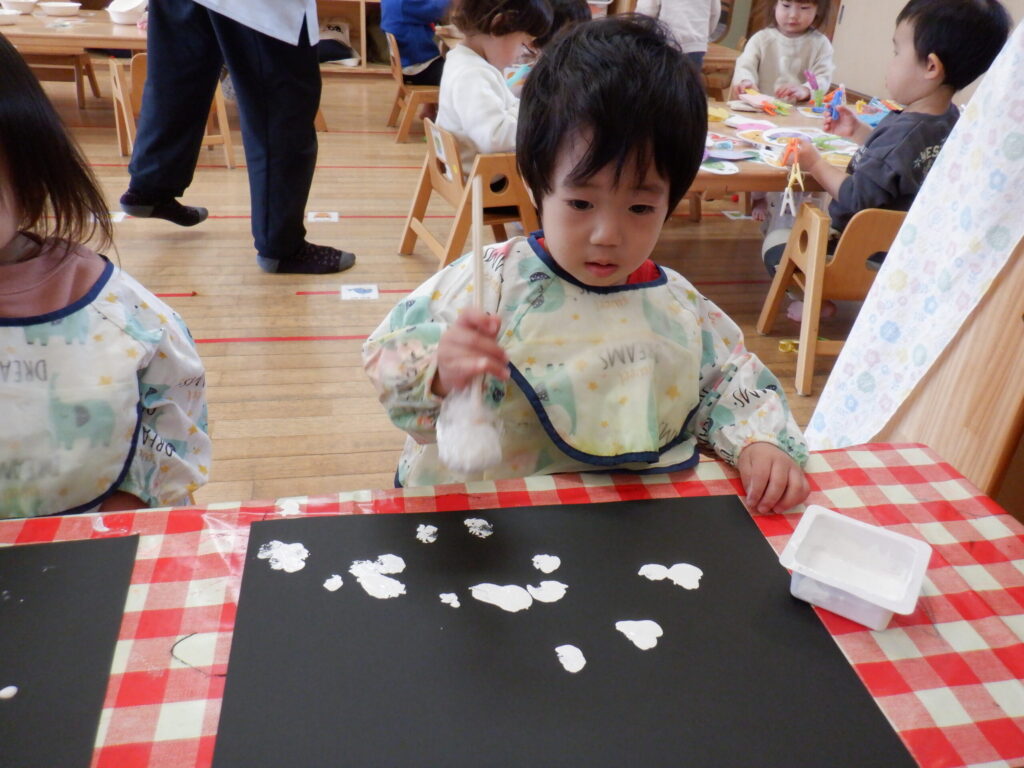 12月はクリスマスの製作です🎄画用紙に雪を降らせました❄