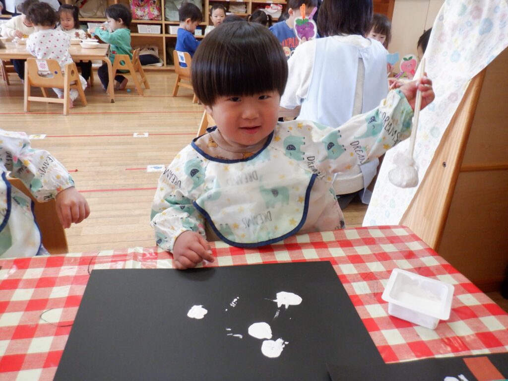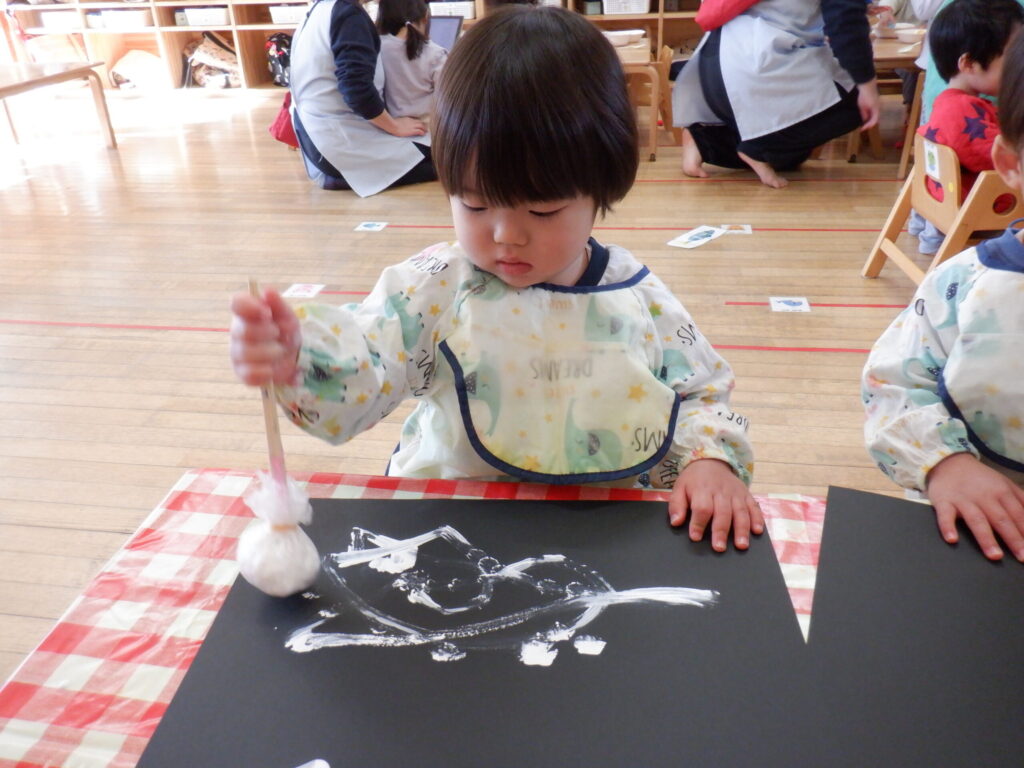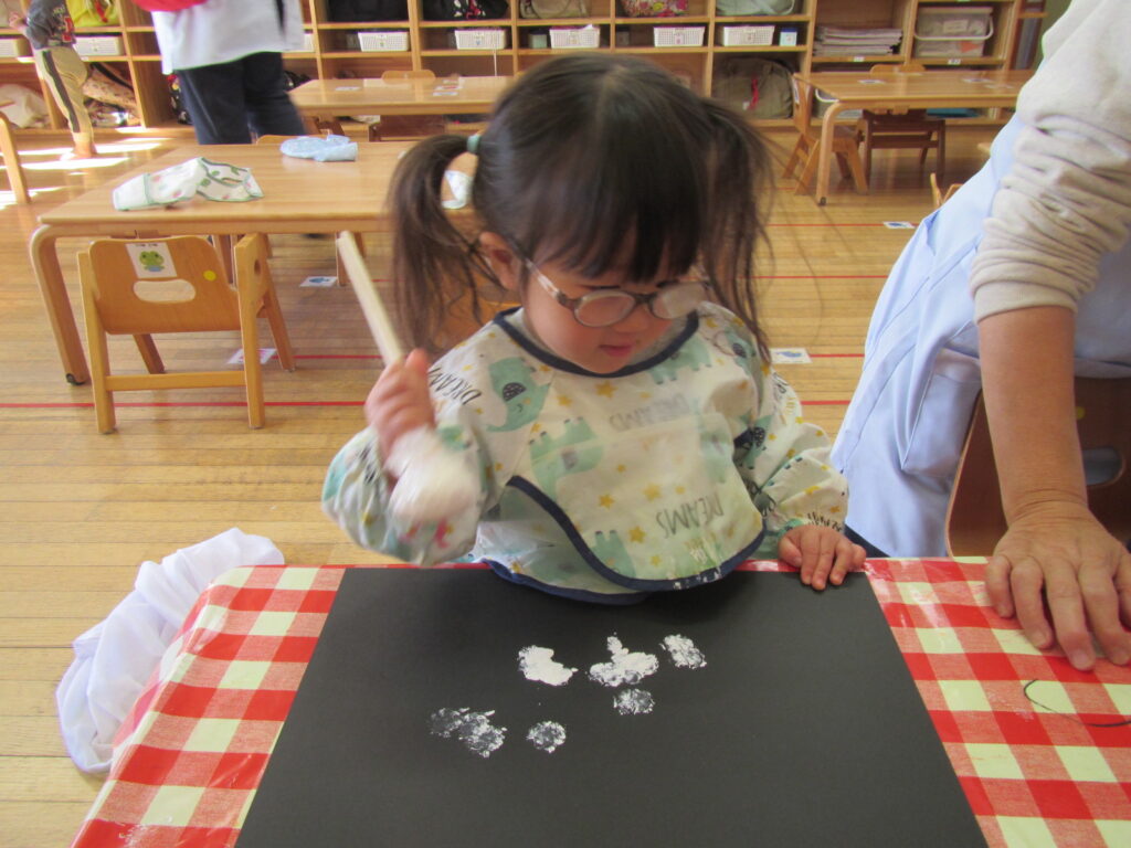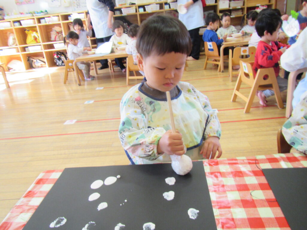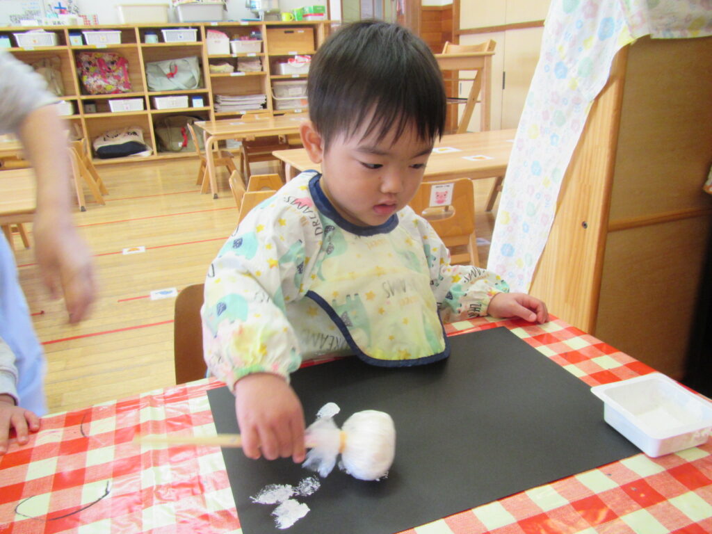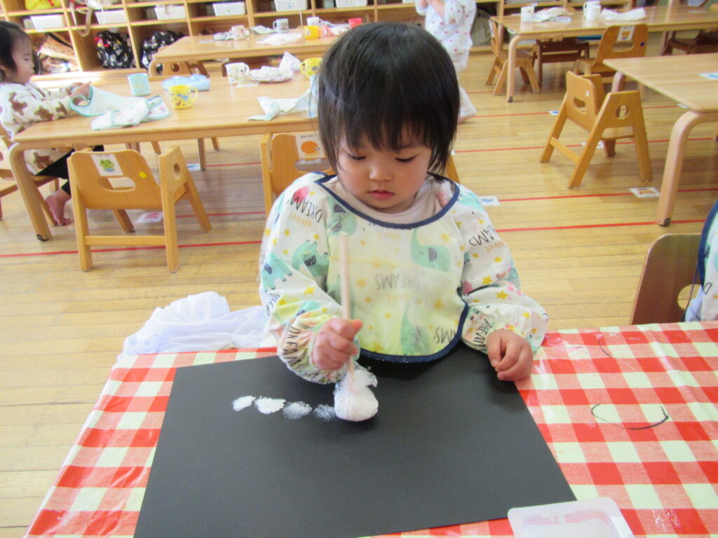 12月はクリスマスの製作です🎄画用紙に雪を降らせました❄