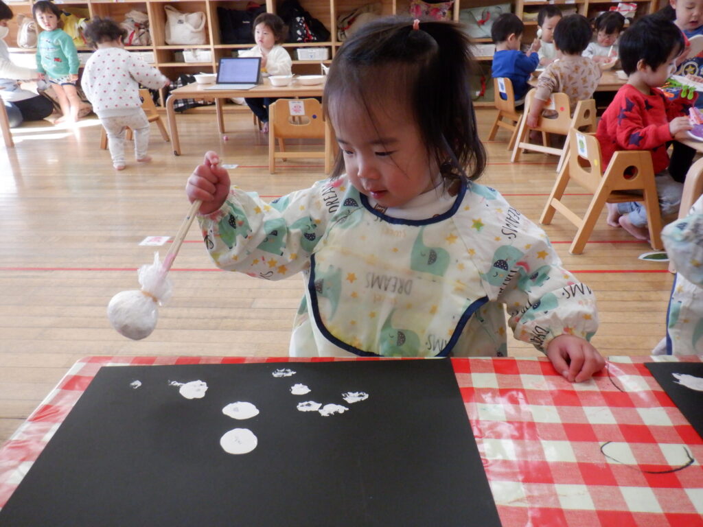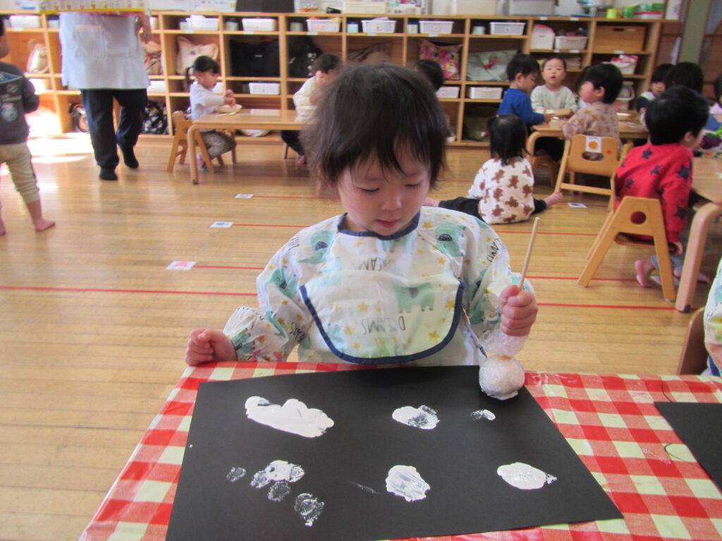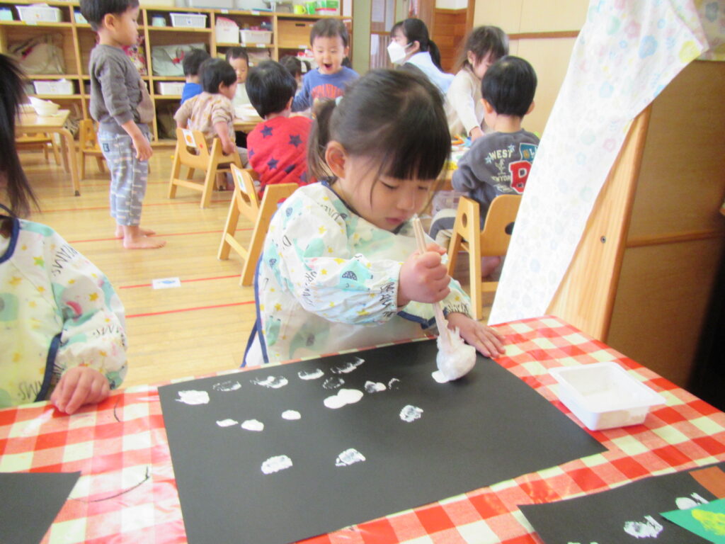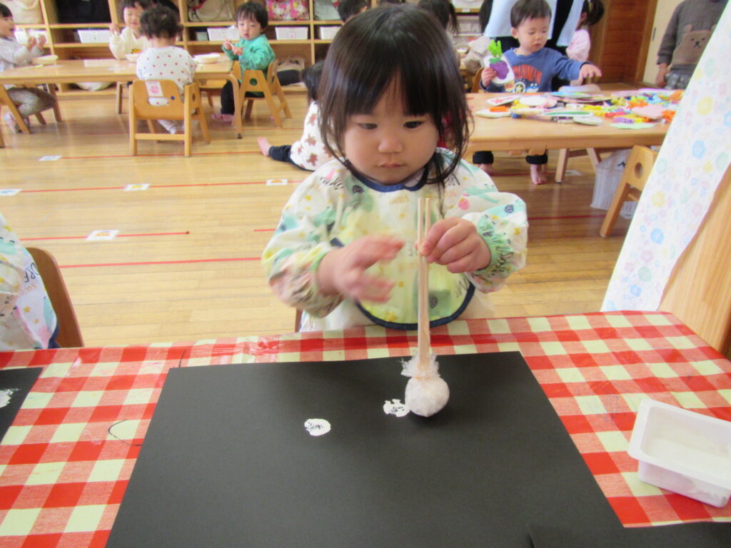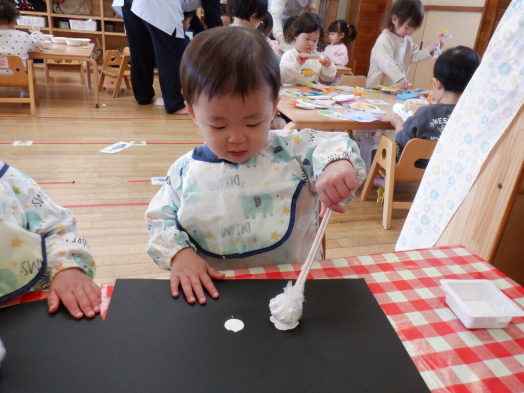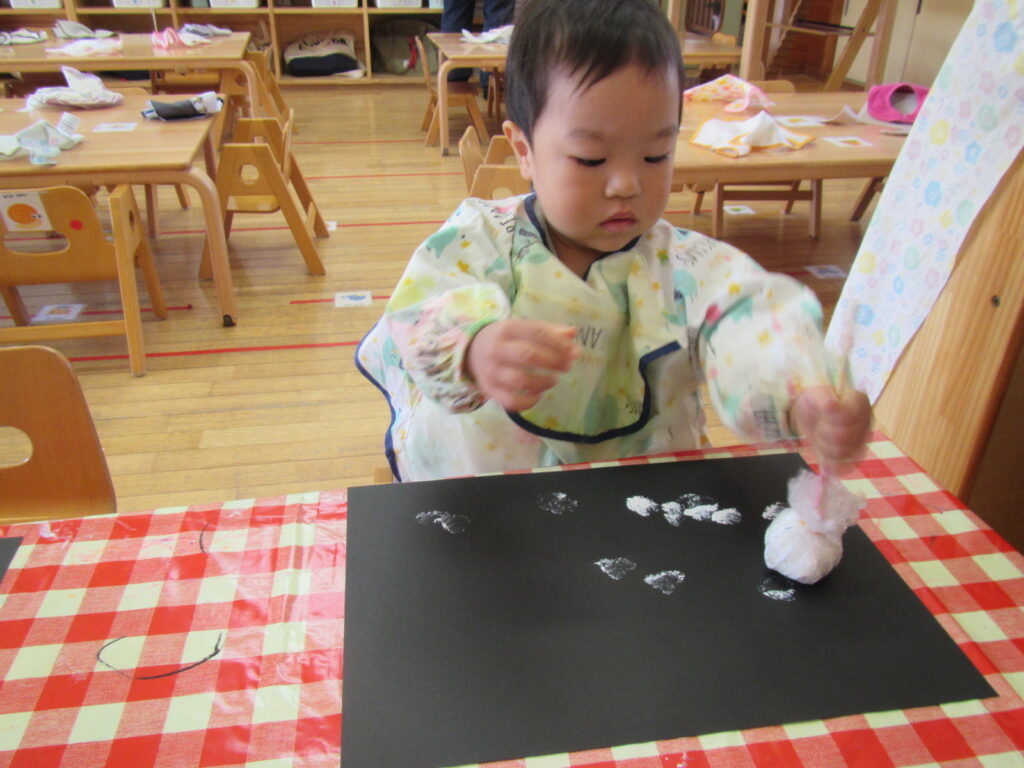 12月はクリスマスの製作です🎄画用紙に雪を降らせました❄