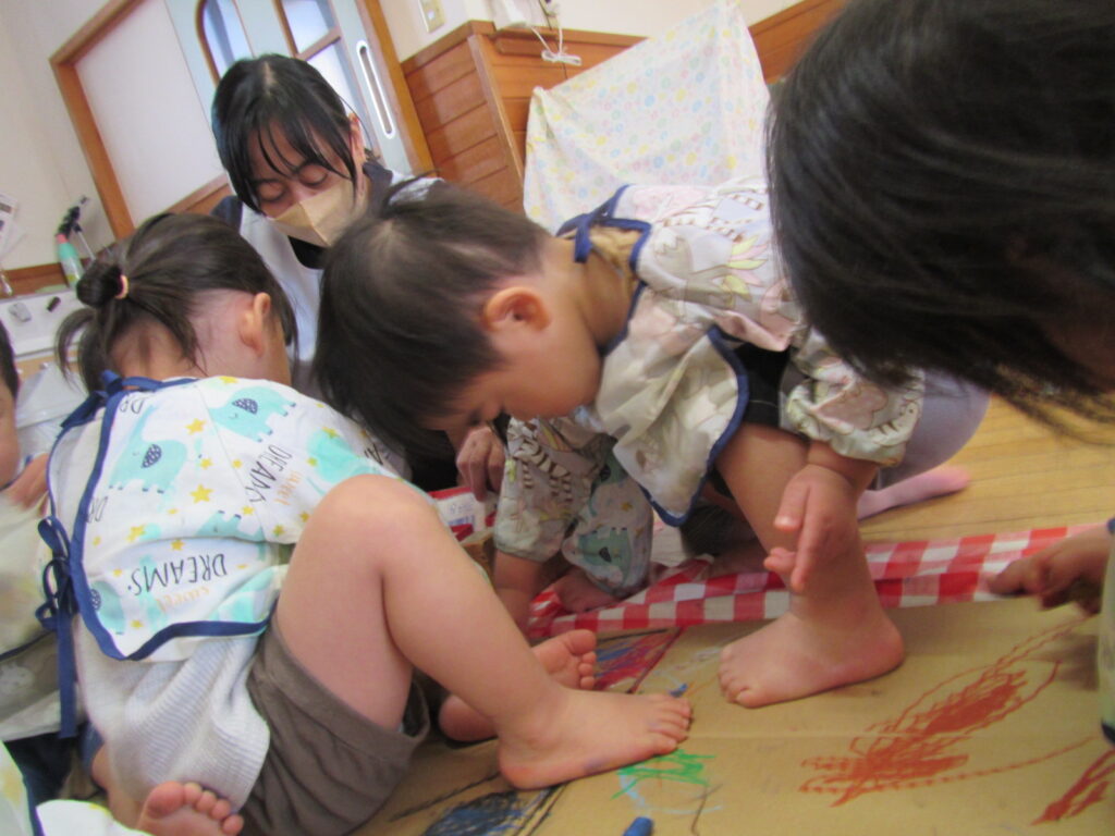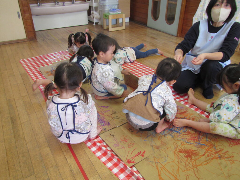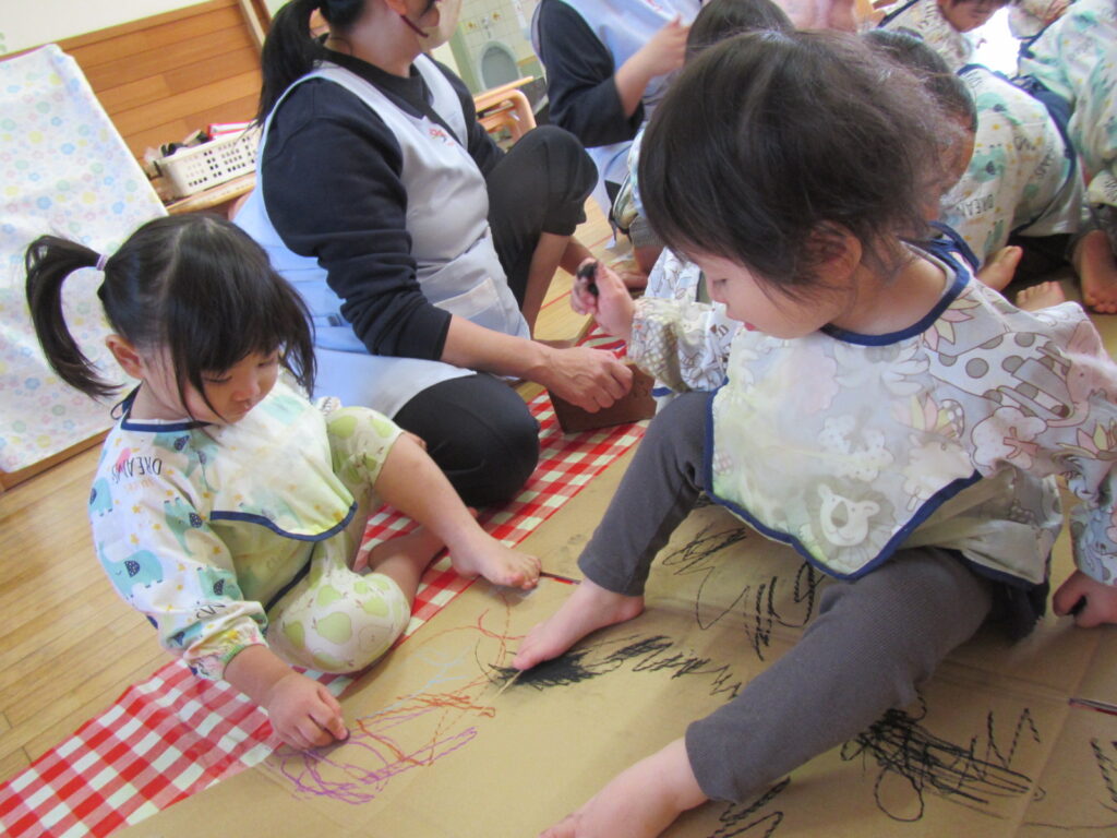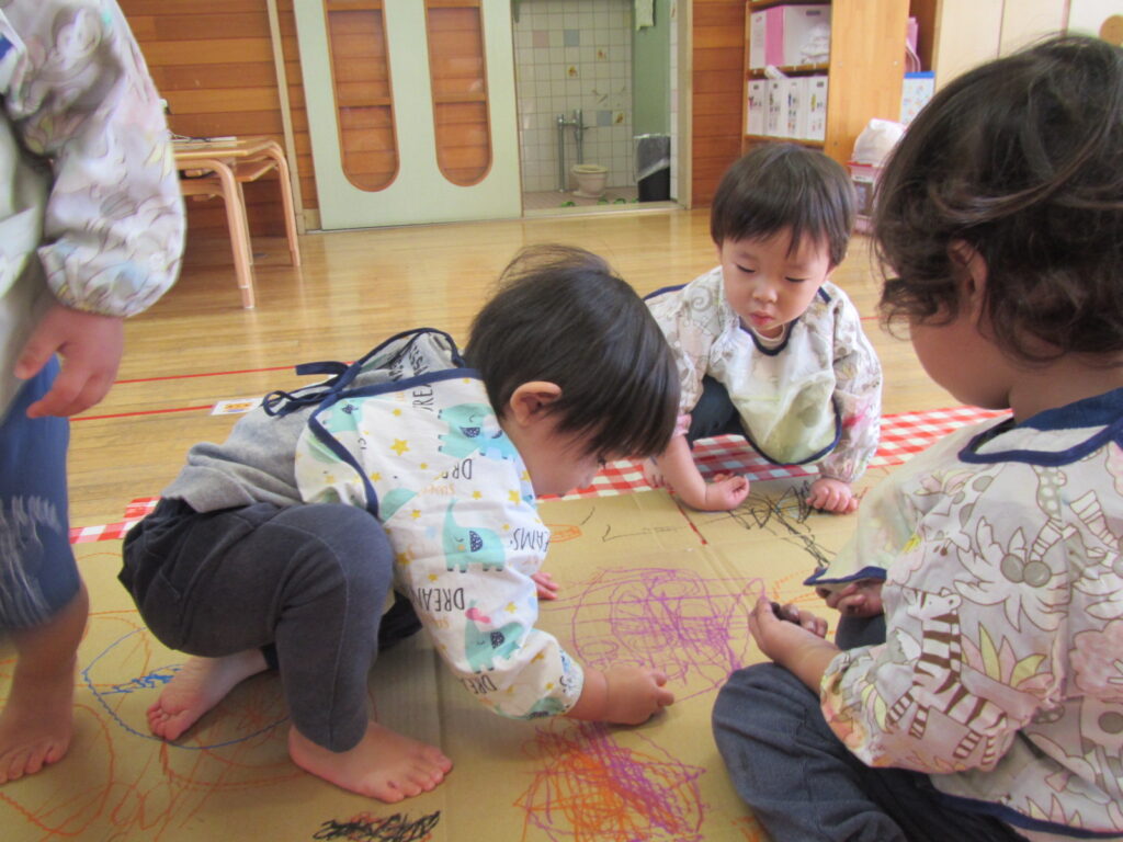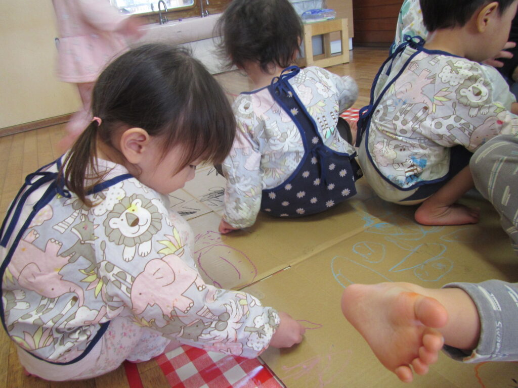 段ボールのガタガタの感触を楽しみながらたくさんお絵描きしています♪