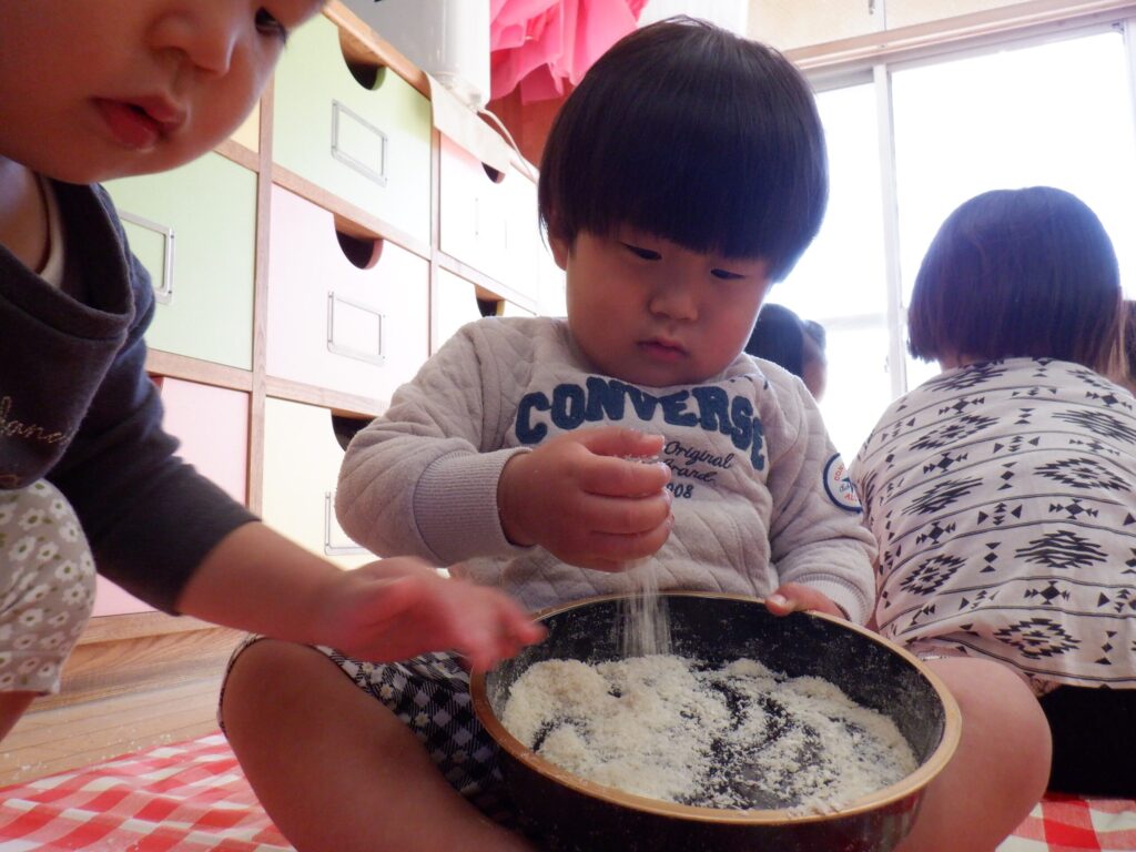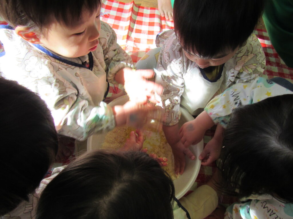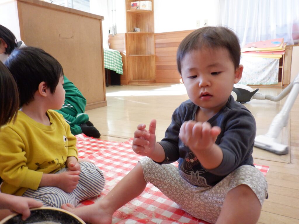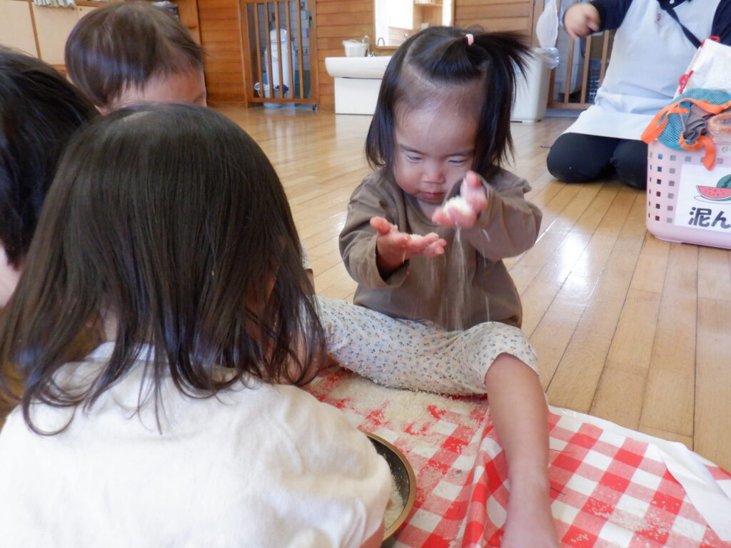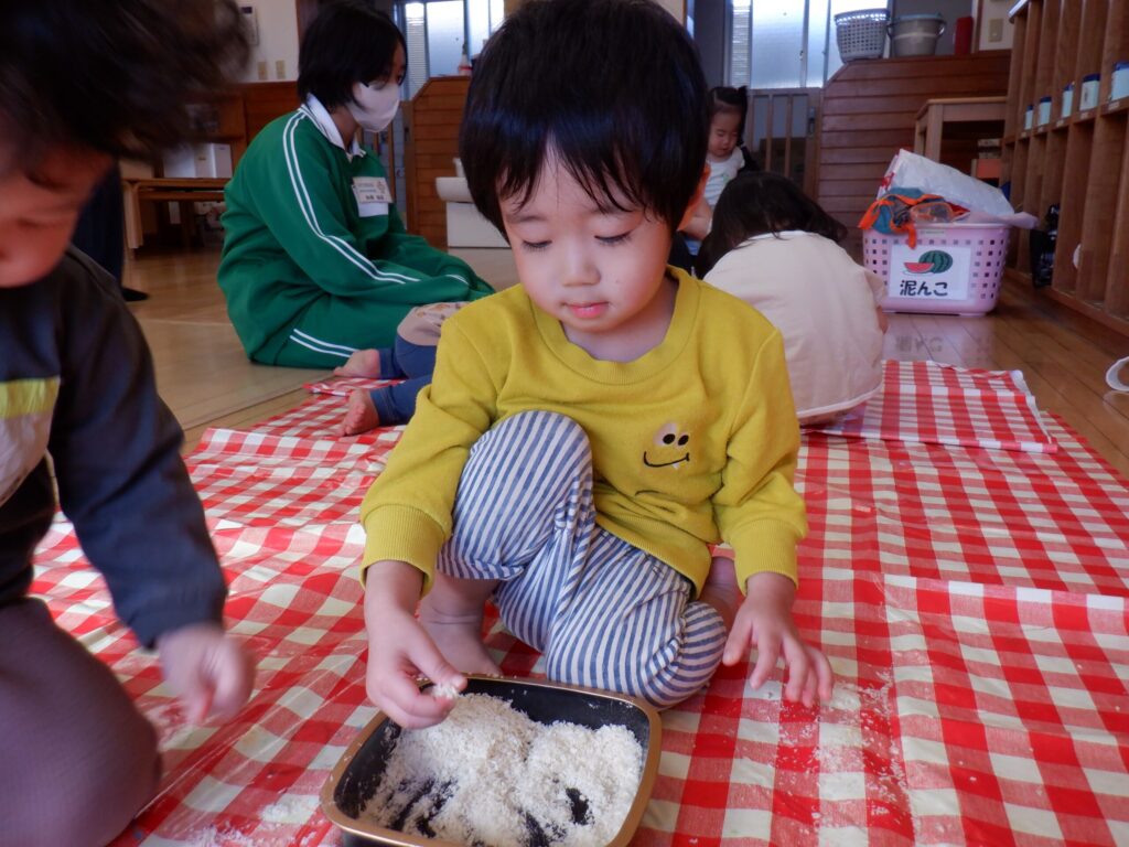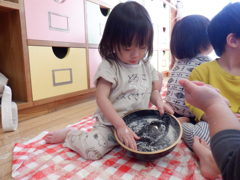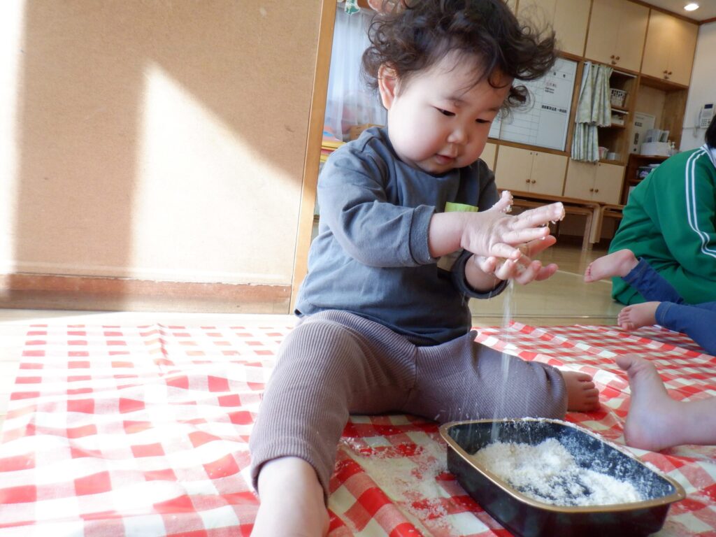 パン粉で遊びました🍞サラサラの感触をみんなで楽しんでいます😊