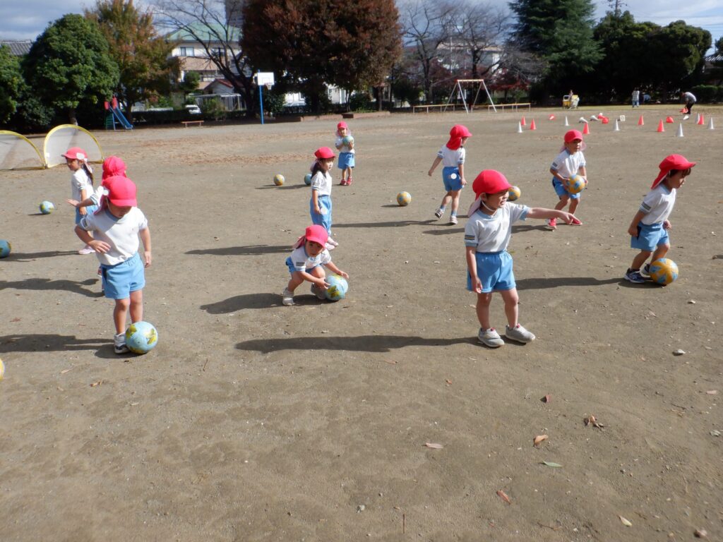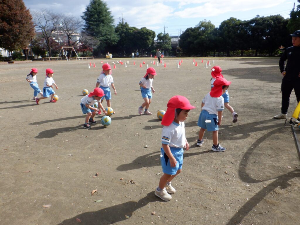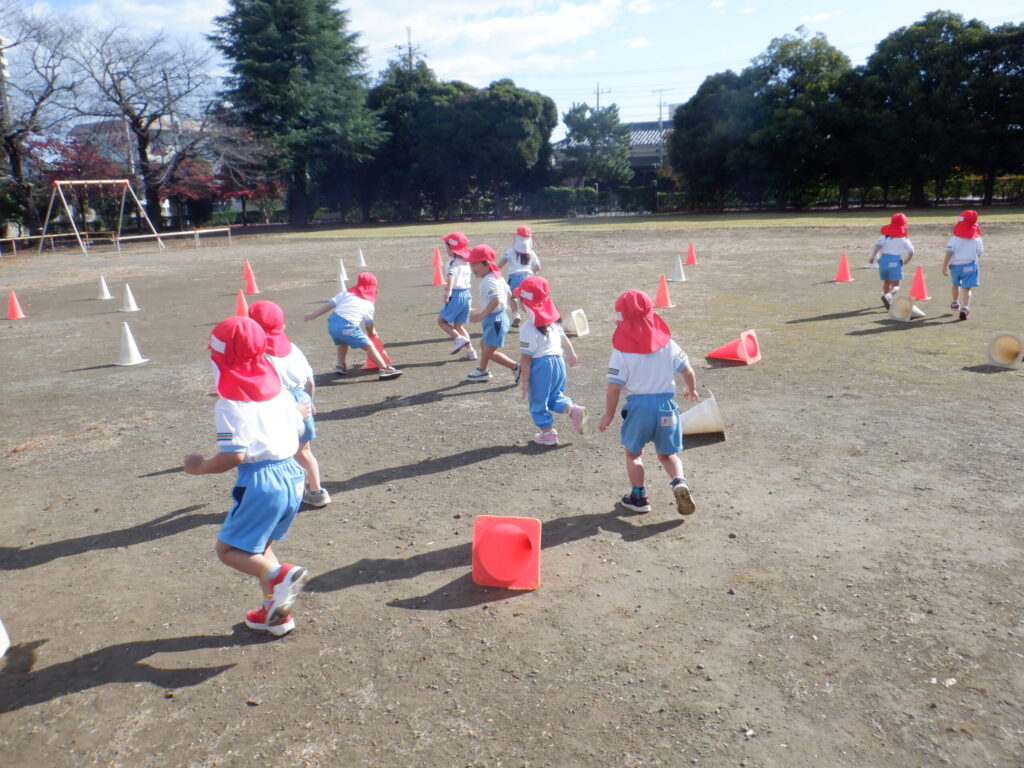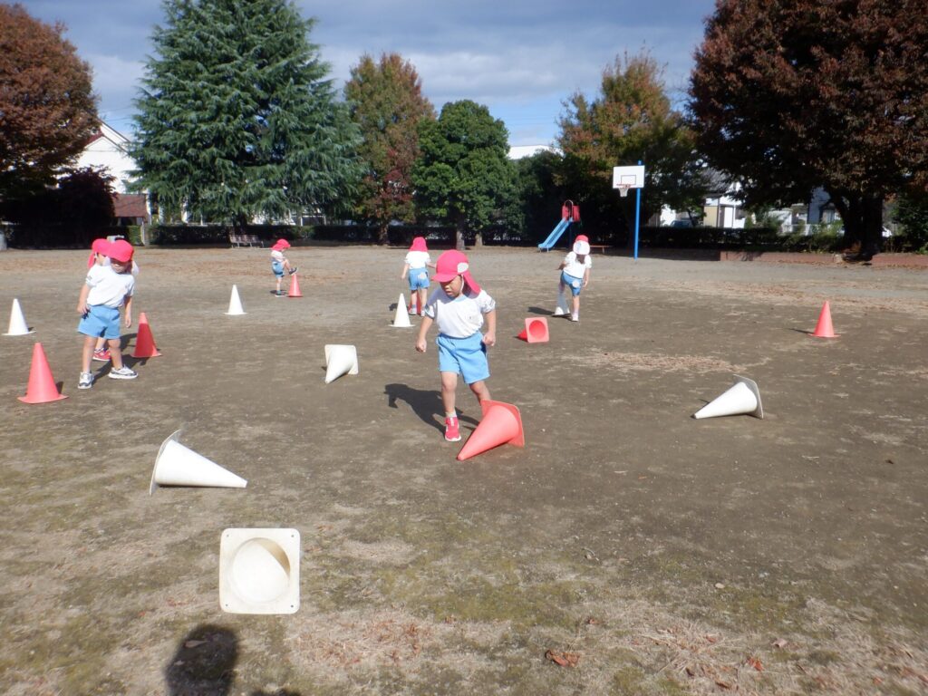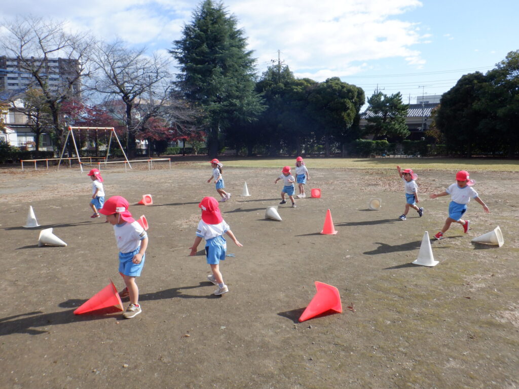 コーチのお話をよく聞いて、コーンを右手で赤、左手で白を倒すのを行い、真剣に倒していました!