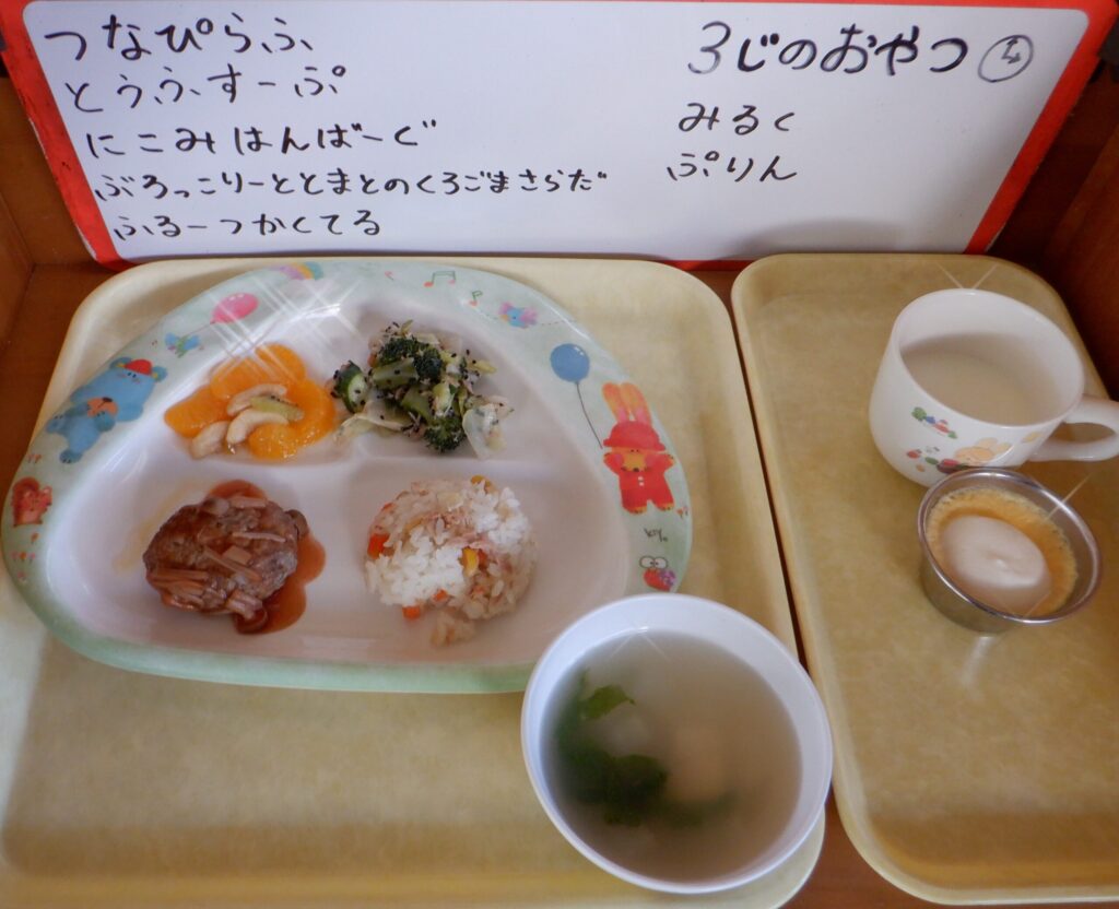 ・ツナピラフ ・豆腐スープ ・煮込みハンバーグ ・キャベツとトマトの黒ゴマサラダ ・フルーツカクテル