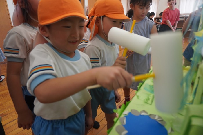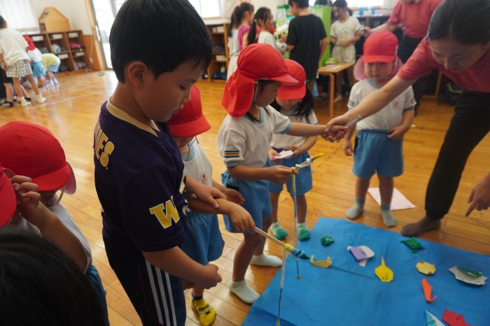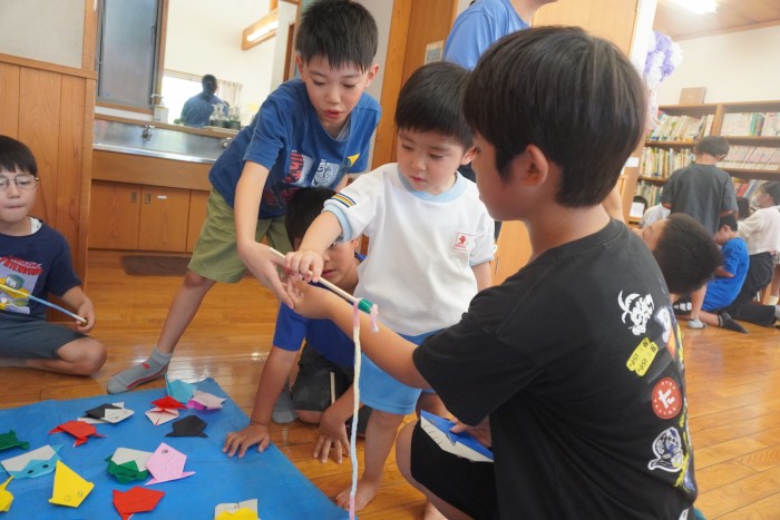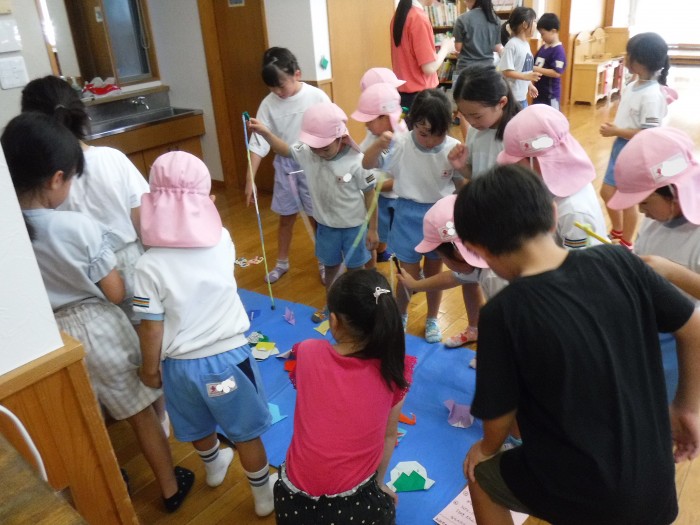 魚釣りでは、学童のお友達が作ってくれたお魚を竿で釣りました!