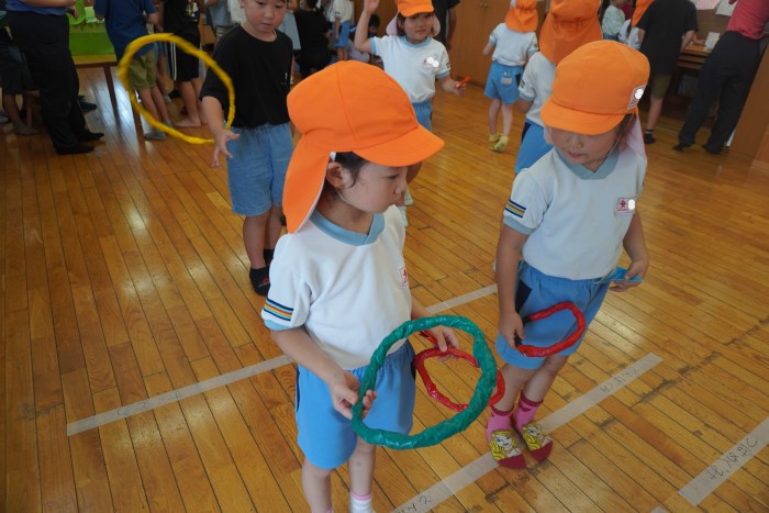 輪投げでは、「こうやって投げるとうまく入るよ」と教えてもらって投げたら、上手に入って喜ぶ様子がありました☺️