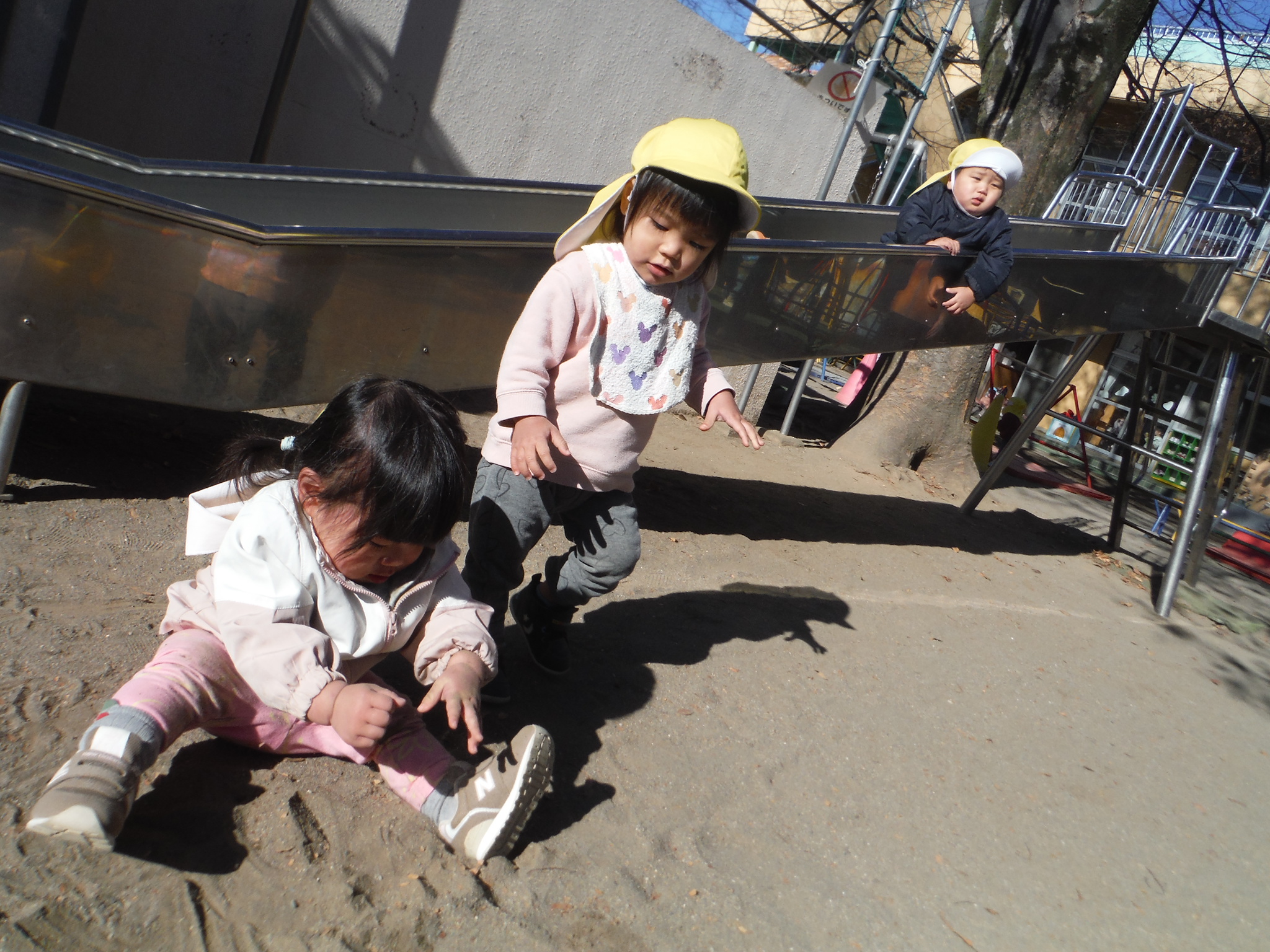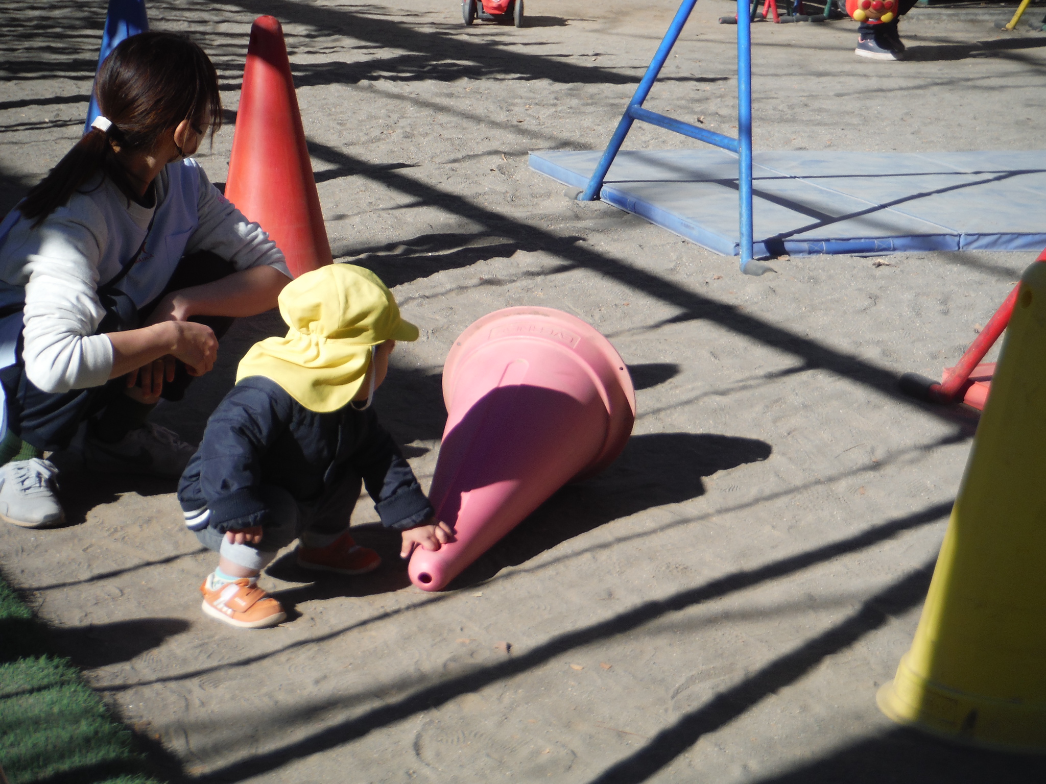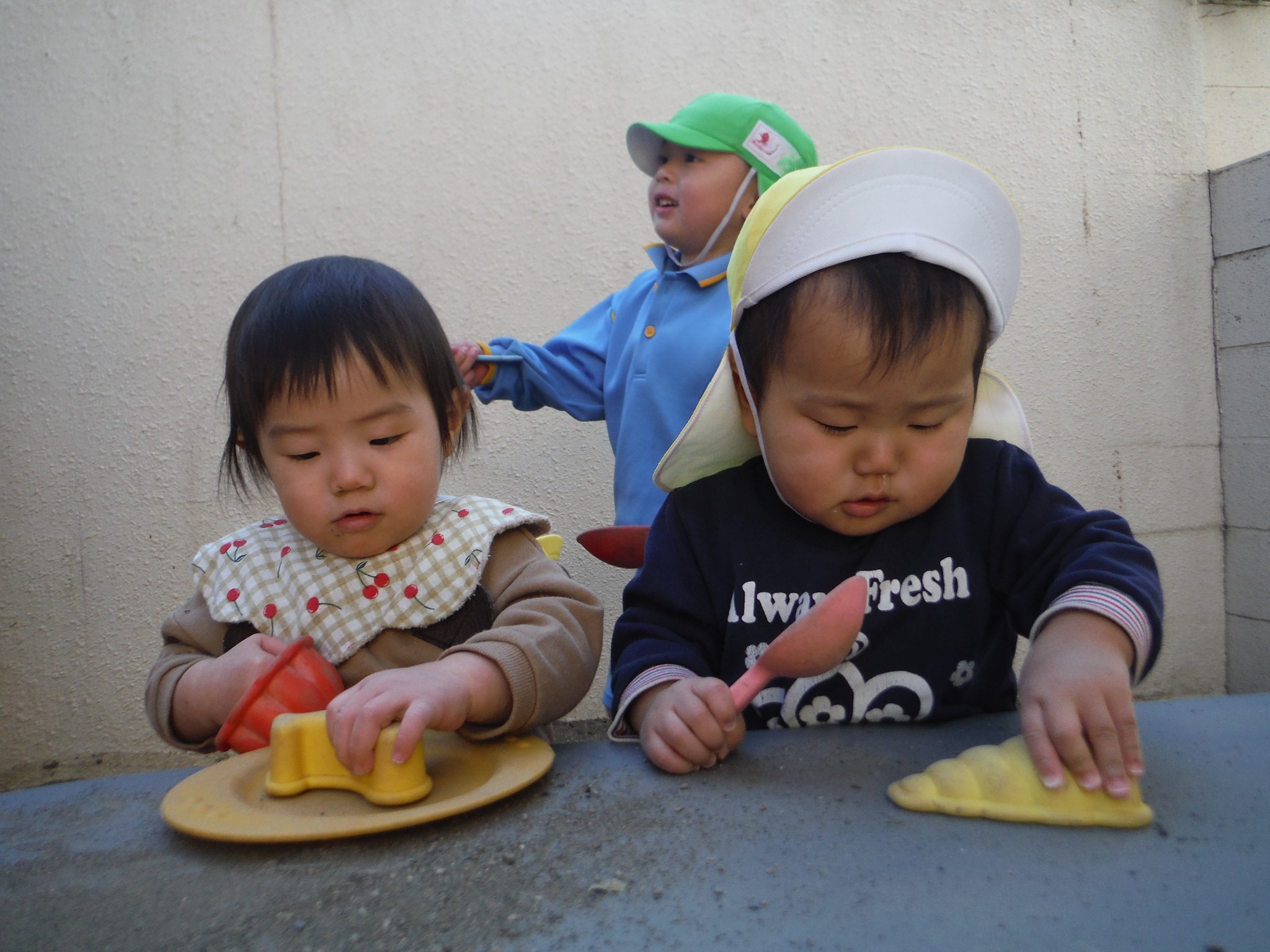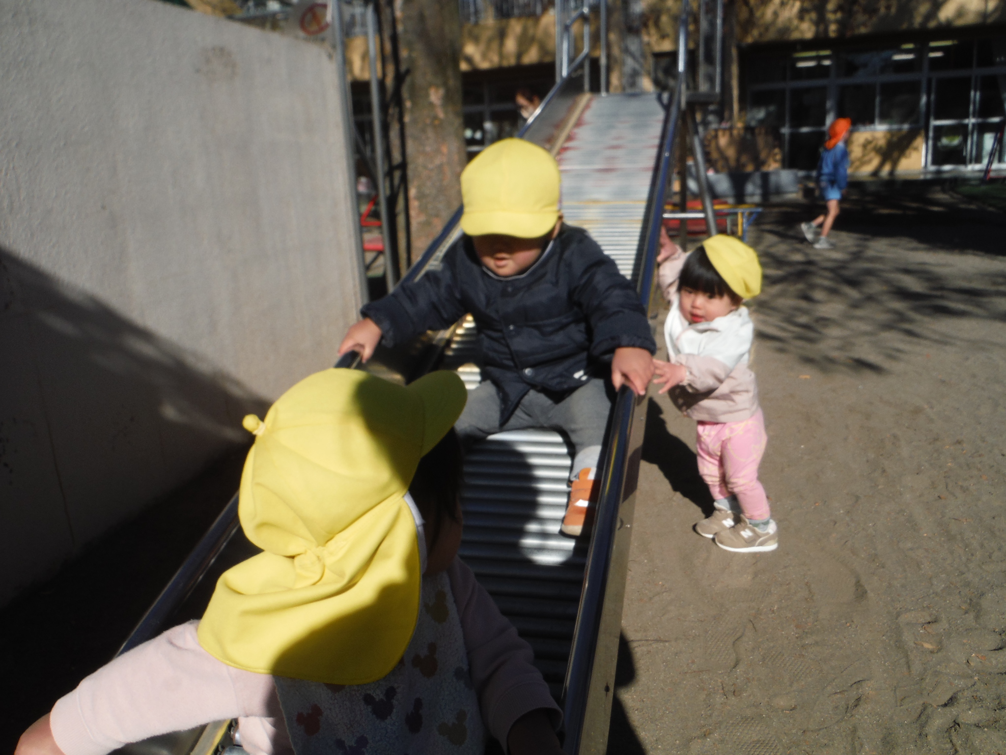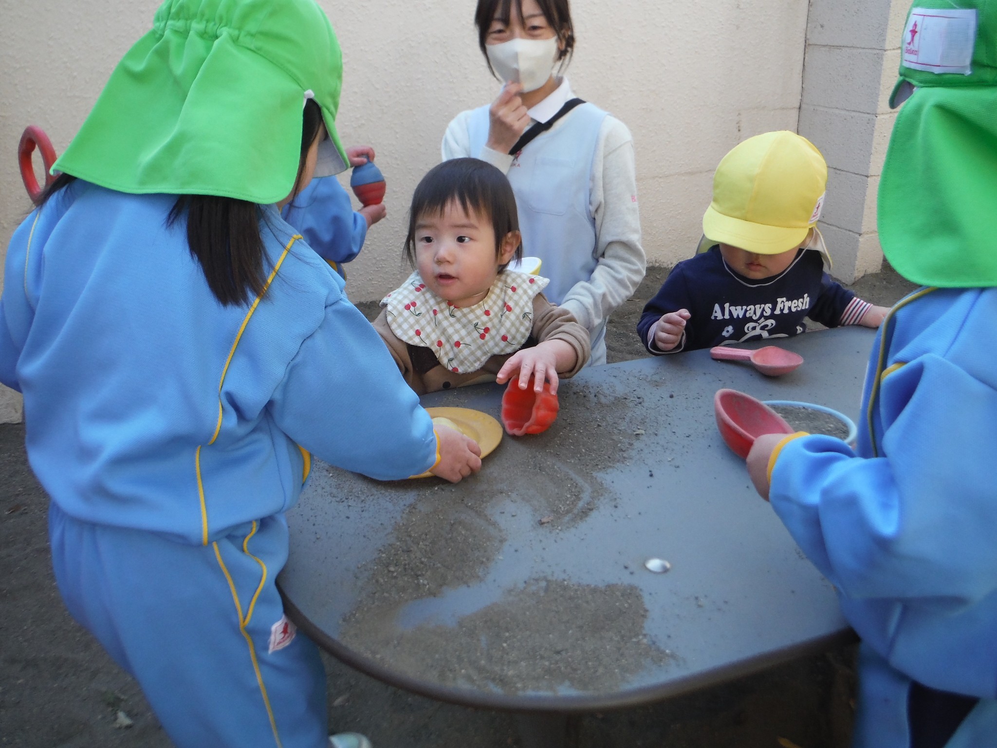 滑り台に挑戦してみたり、大きいクラスのお姉さんたちとごはんごっこを楽しんだり。