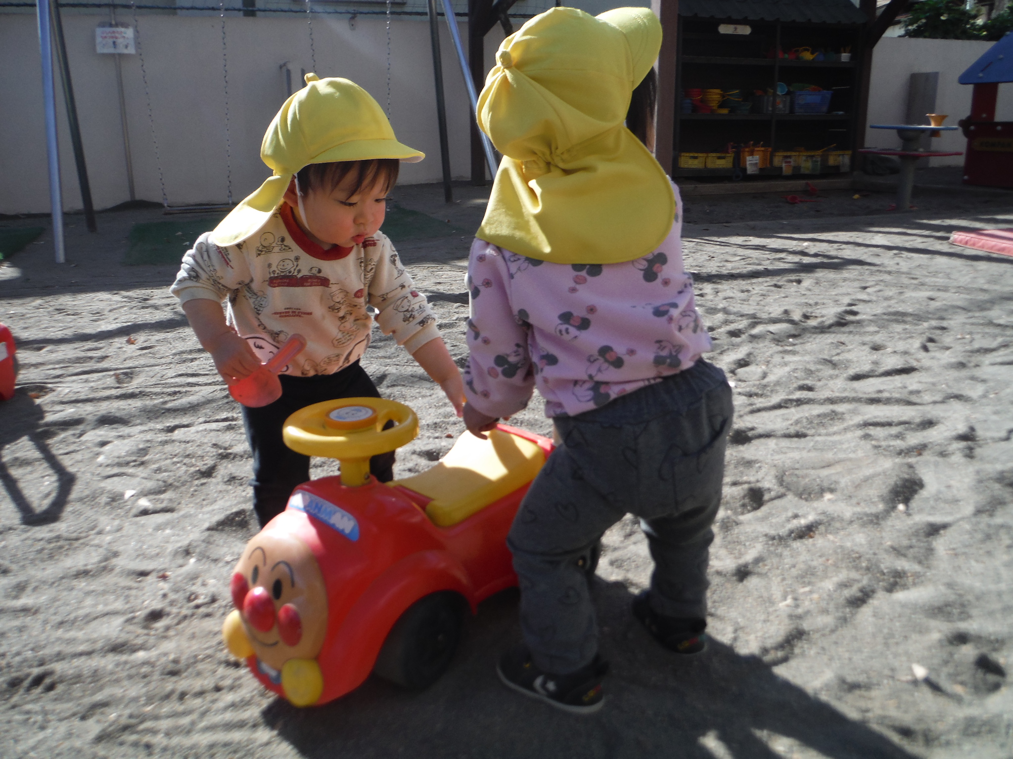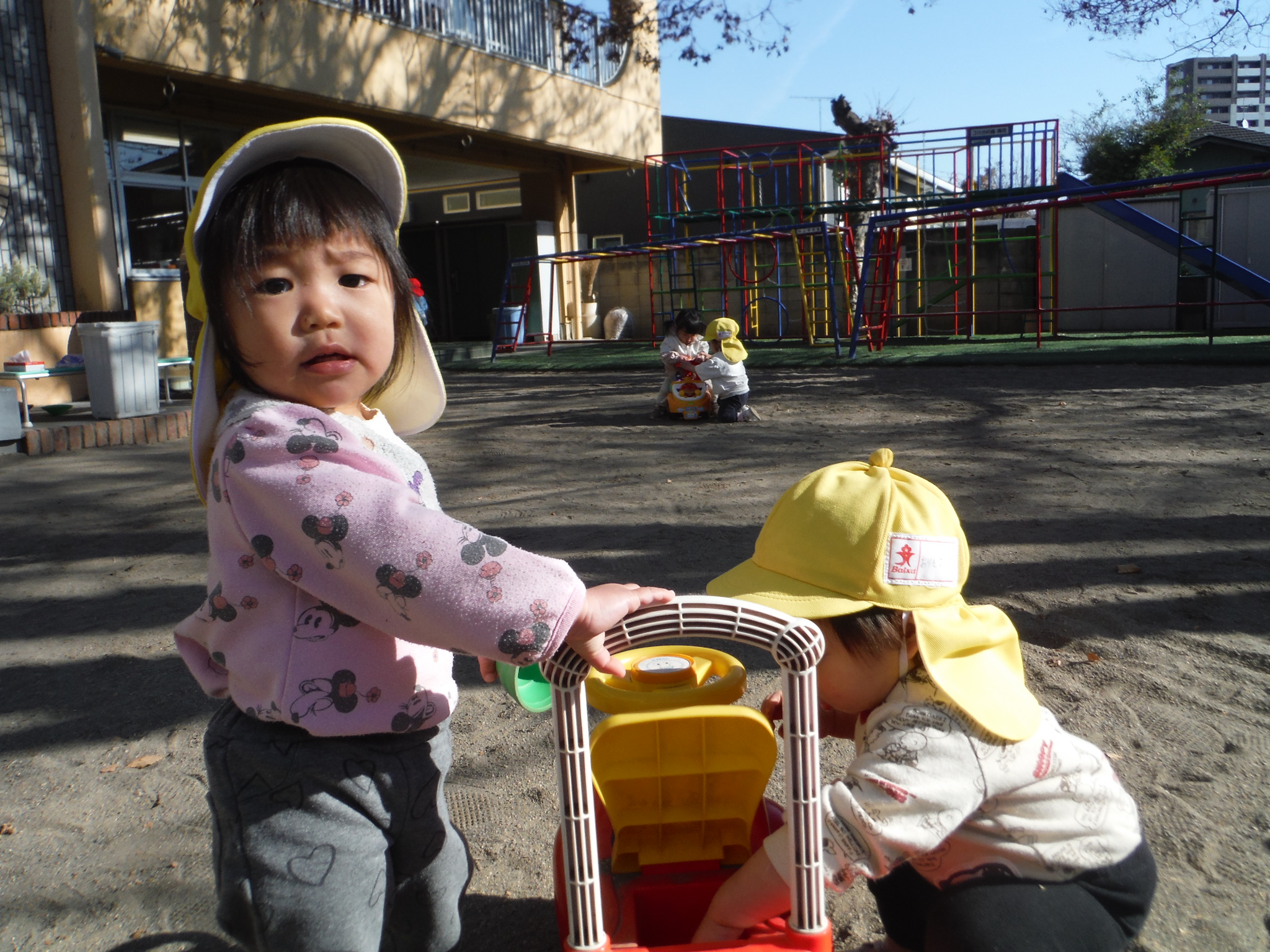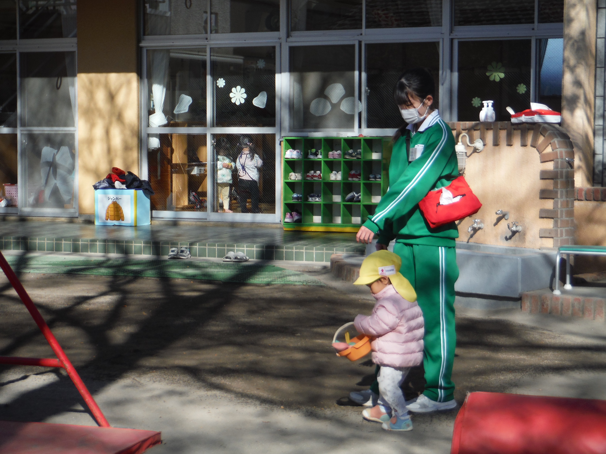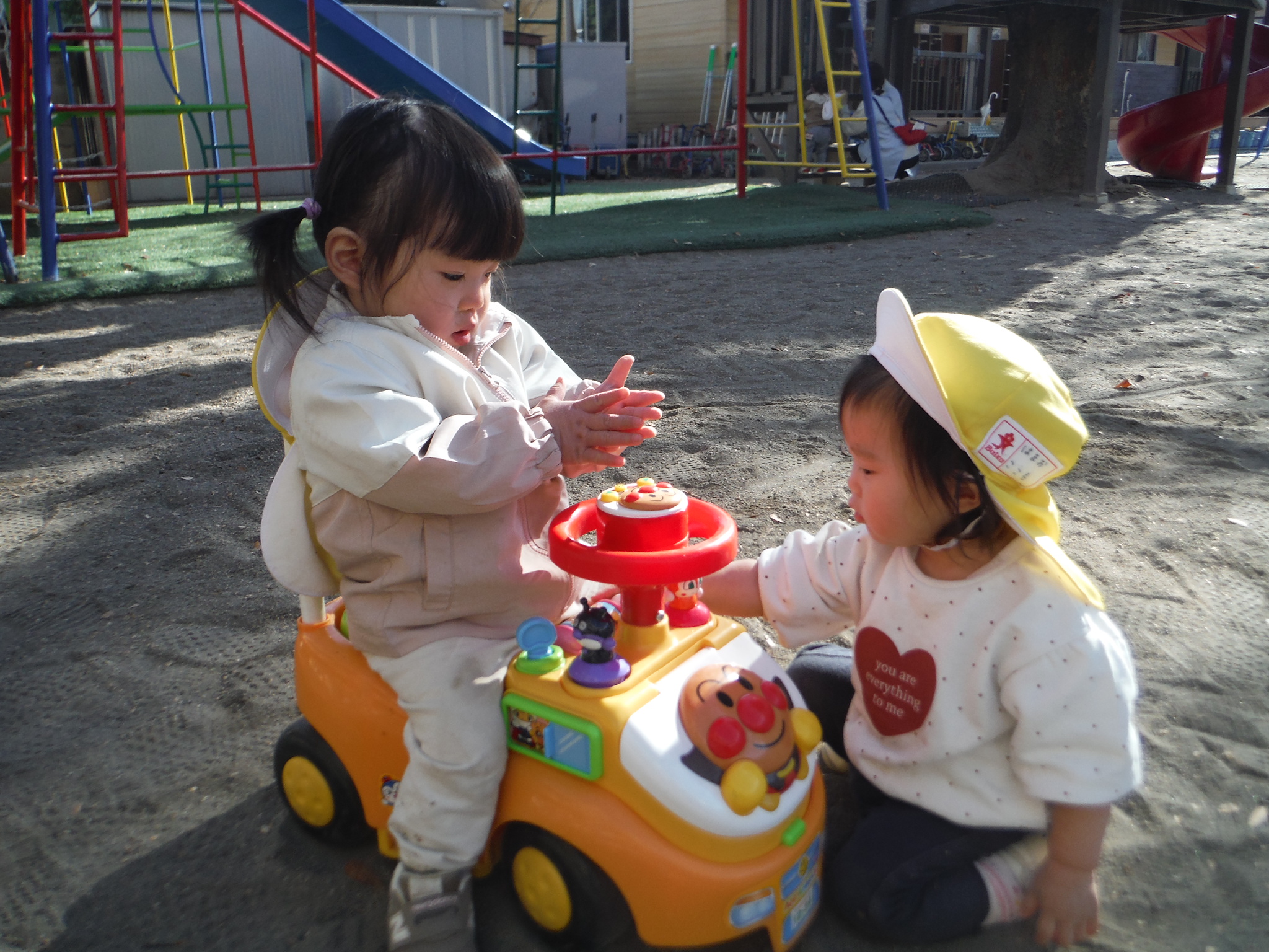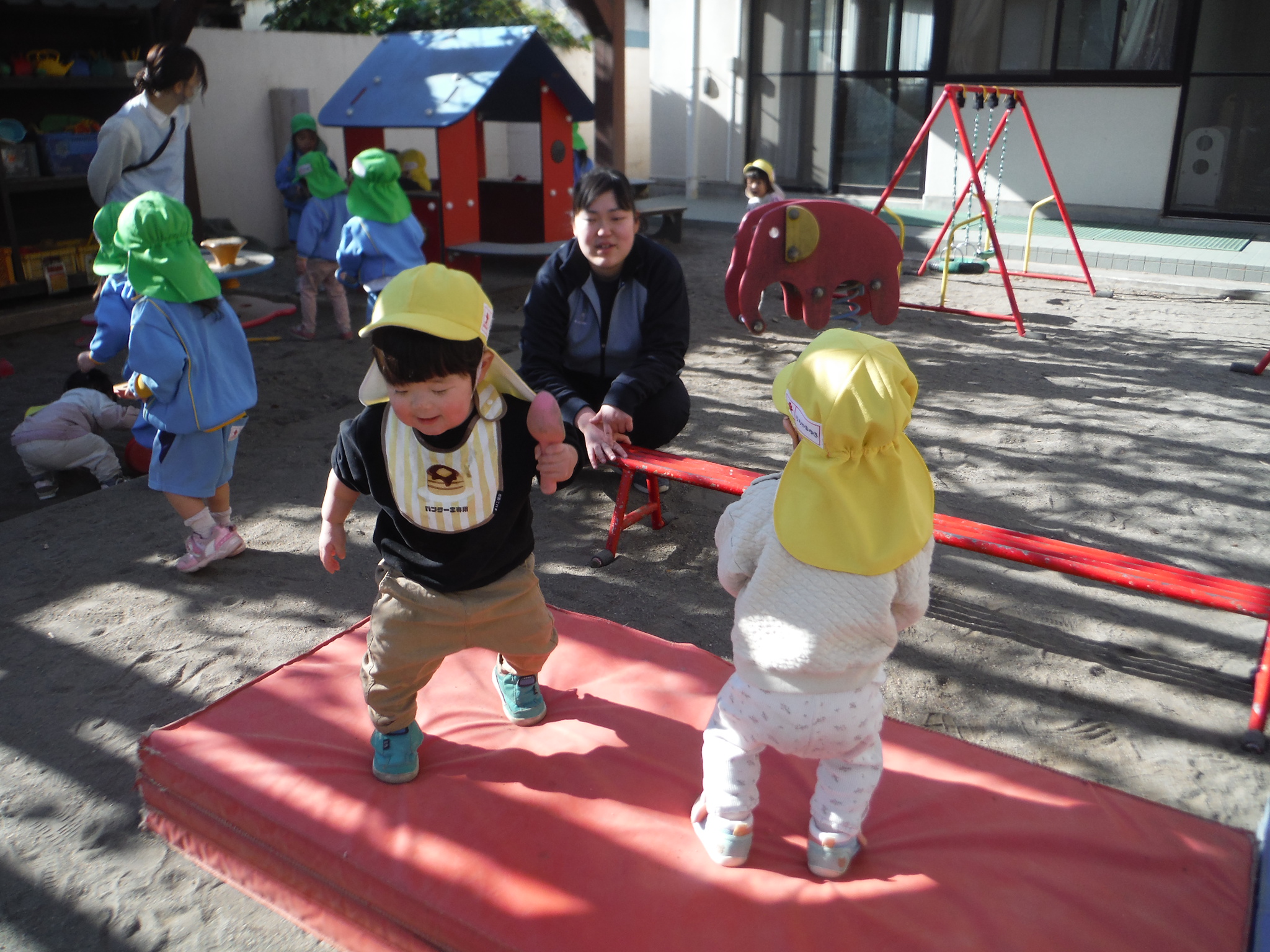 滑り台に挑戦してみたり、大きいクラスのお姉さんたちとごはんごっこを楽しんだり。