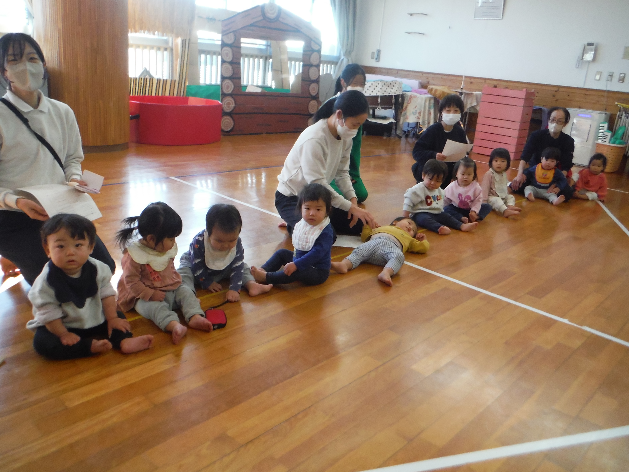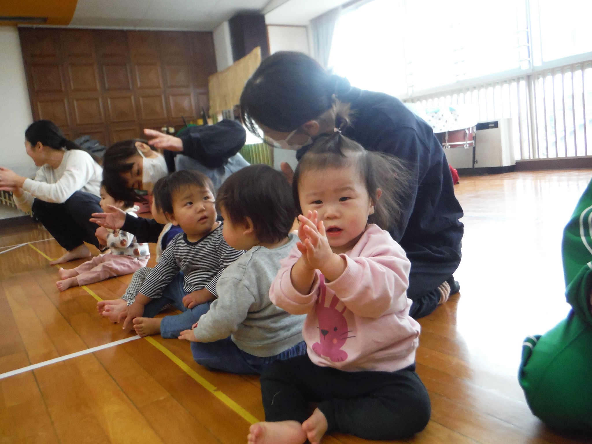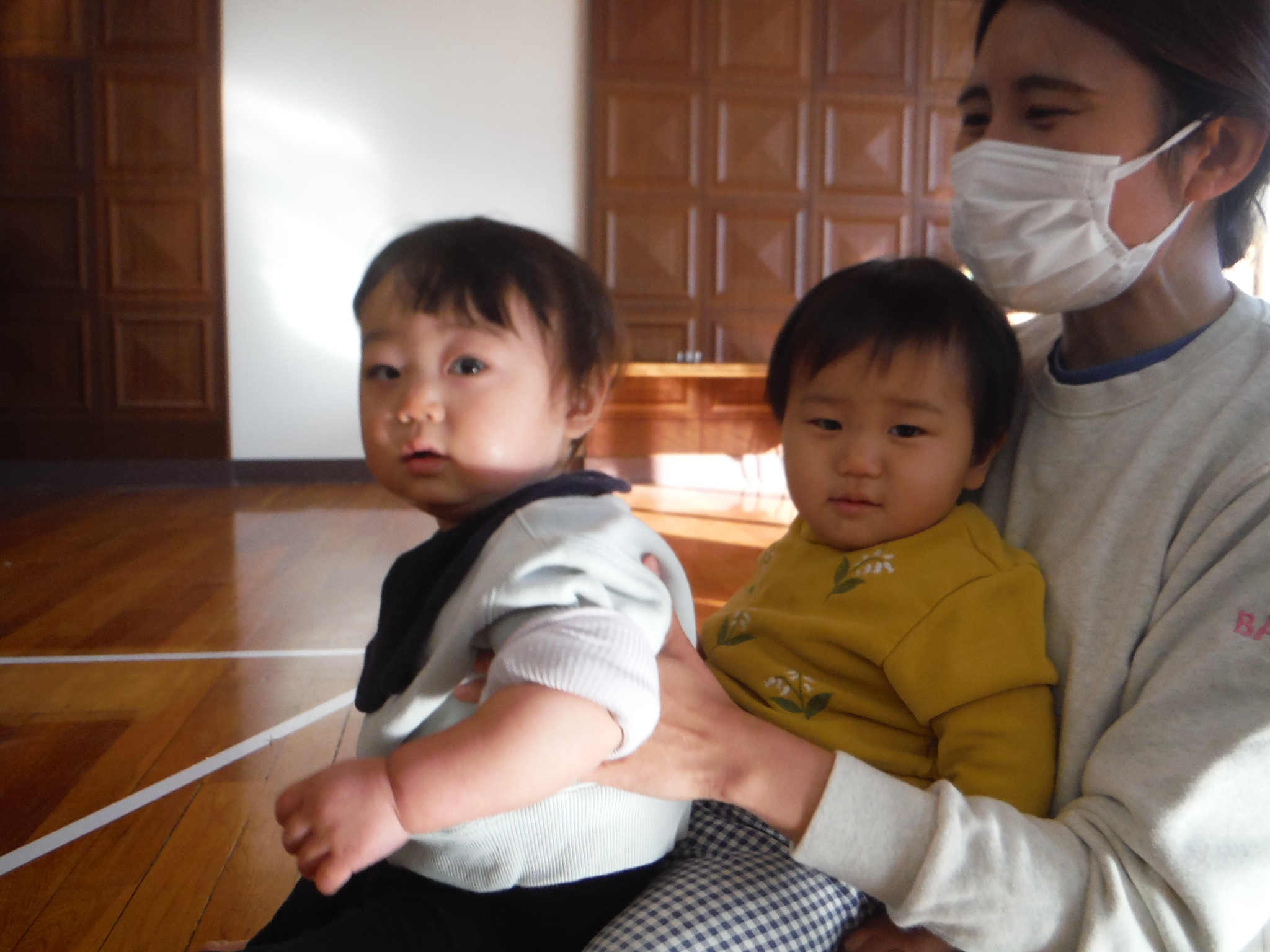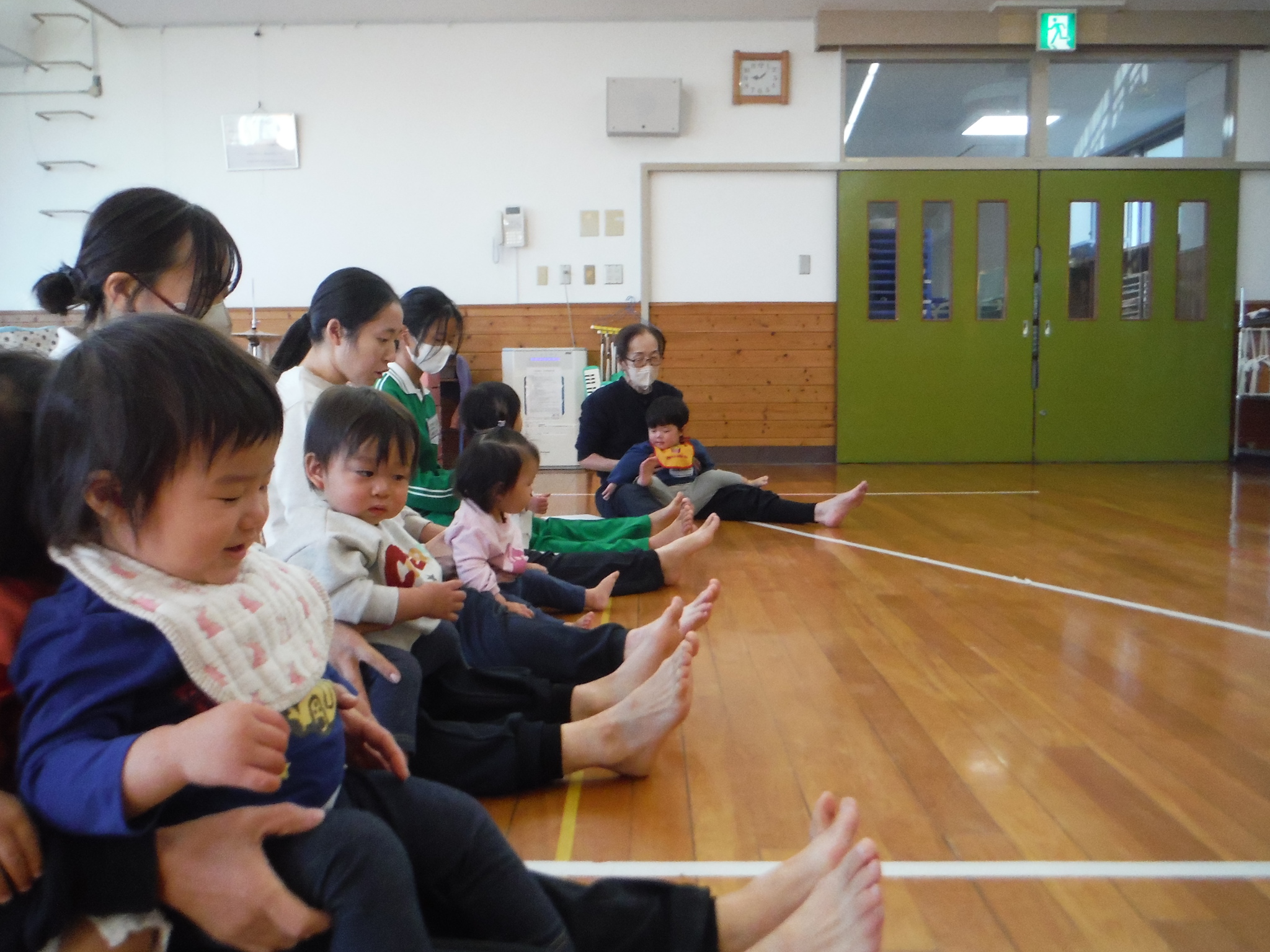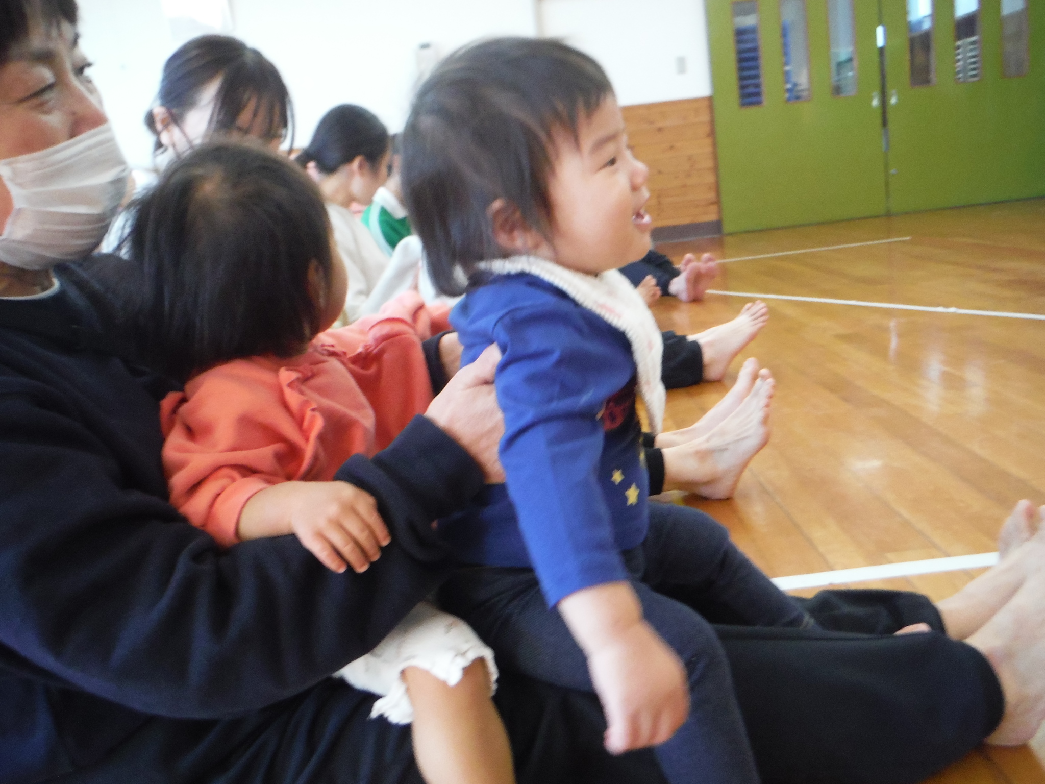 線上に並んでお返事じょうずにできるかな?先生のお膝の上で揺られてニコニコ😊