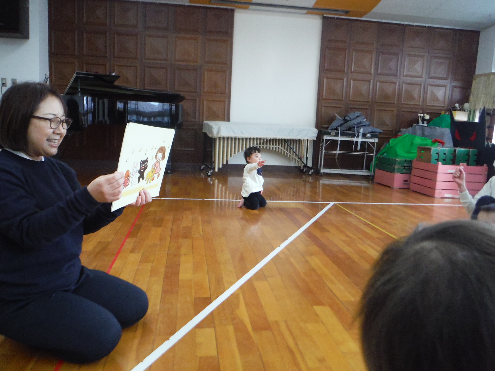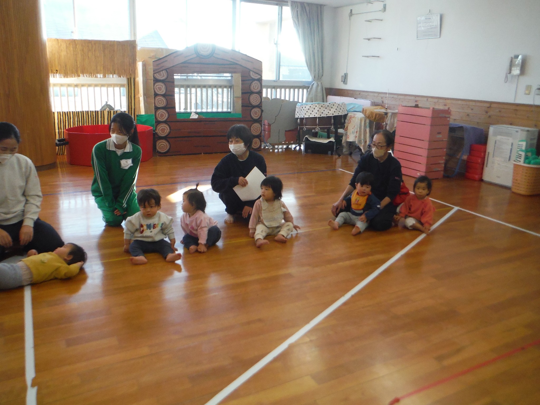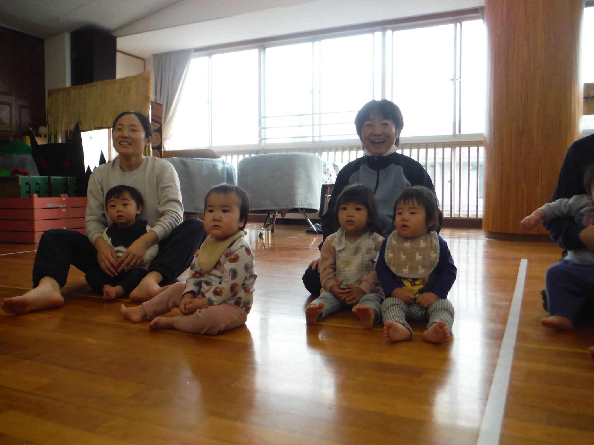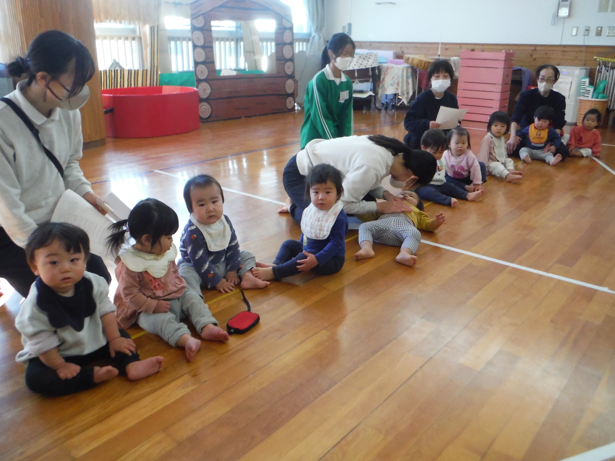 線上に並んでお返事じょうずにできるかな?先生のお膝の上で揺られてニコニコ😊