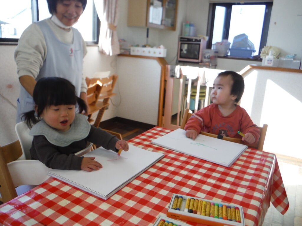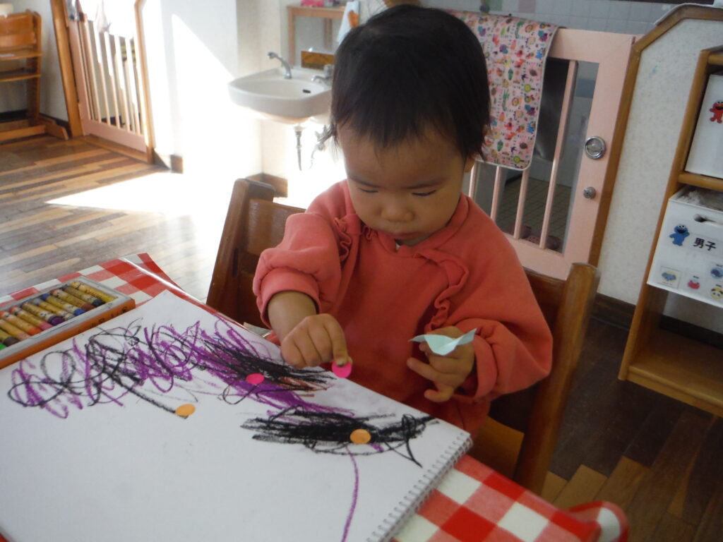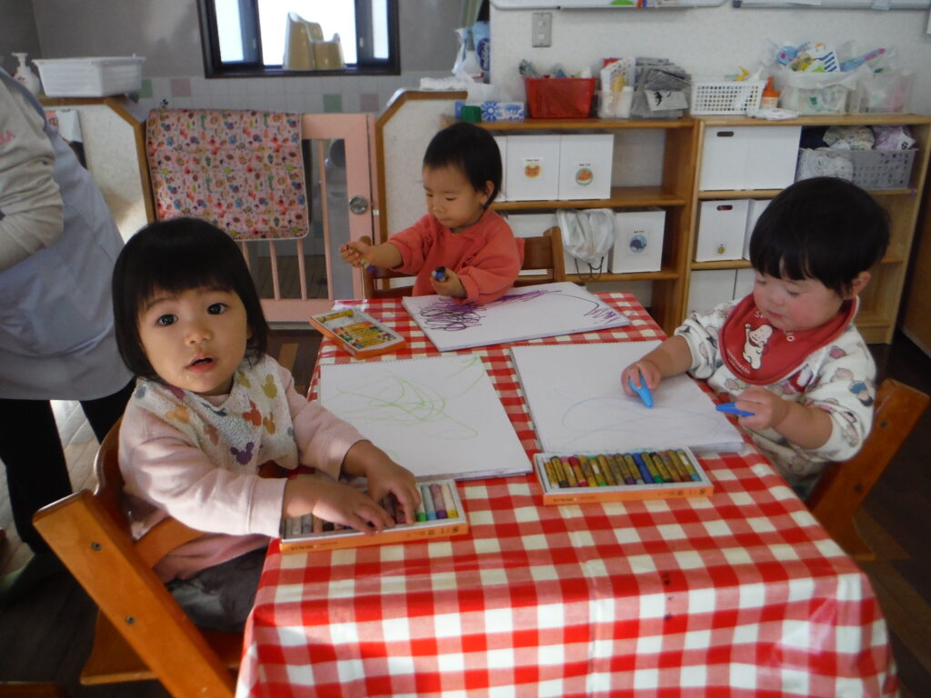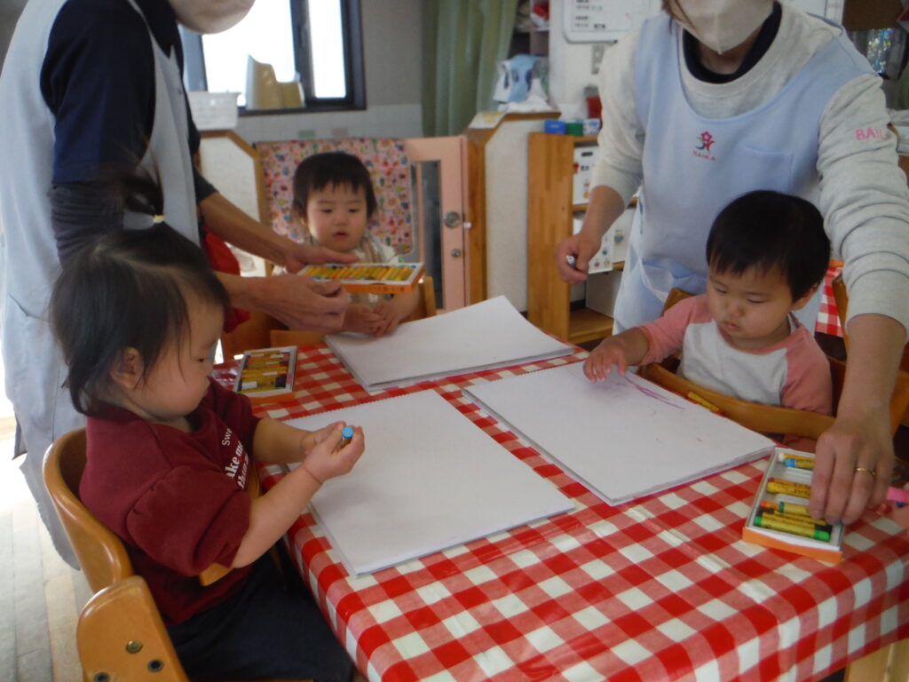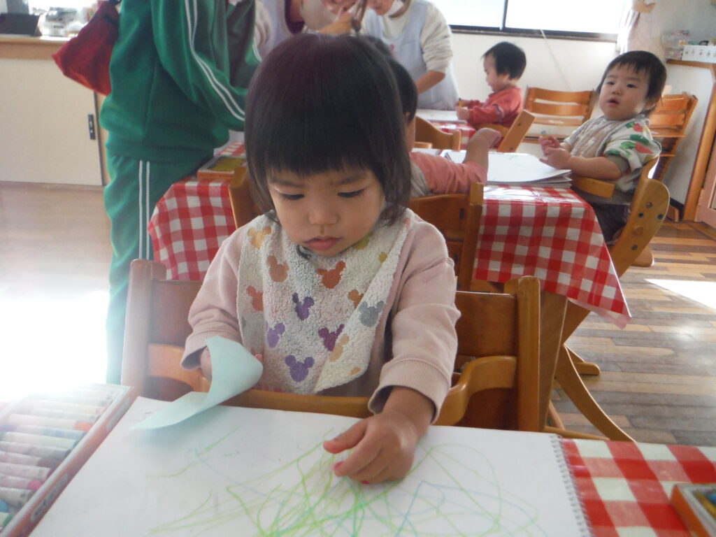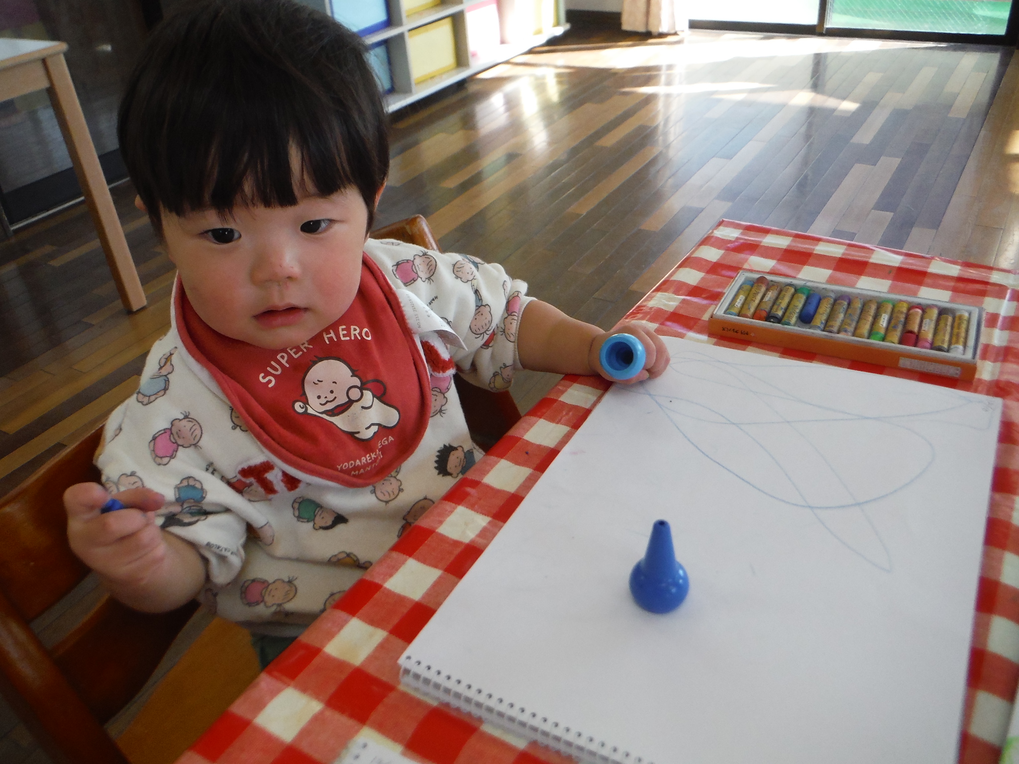 描きかき上手にできるかな?クレヨンをギュ!と握って描きました!