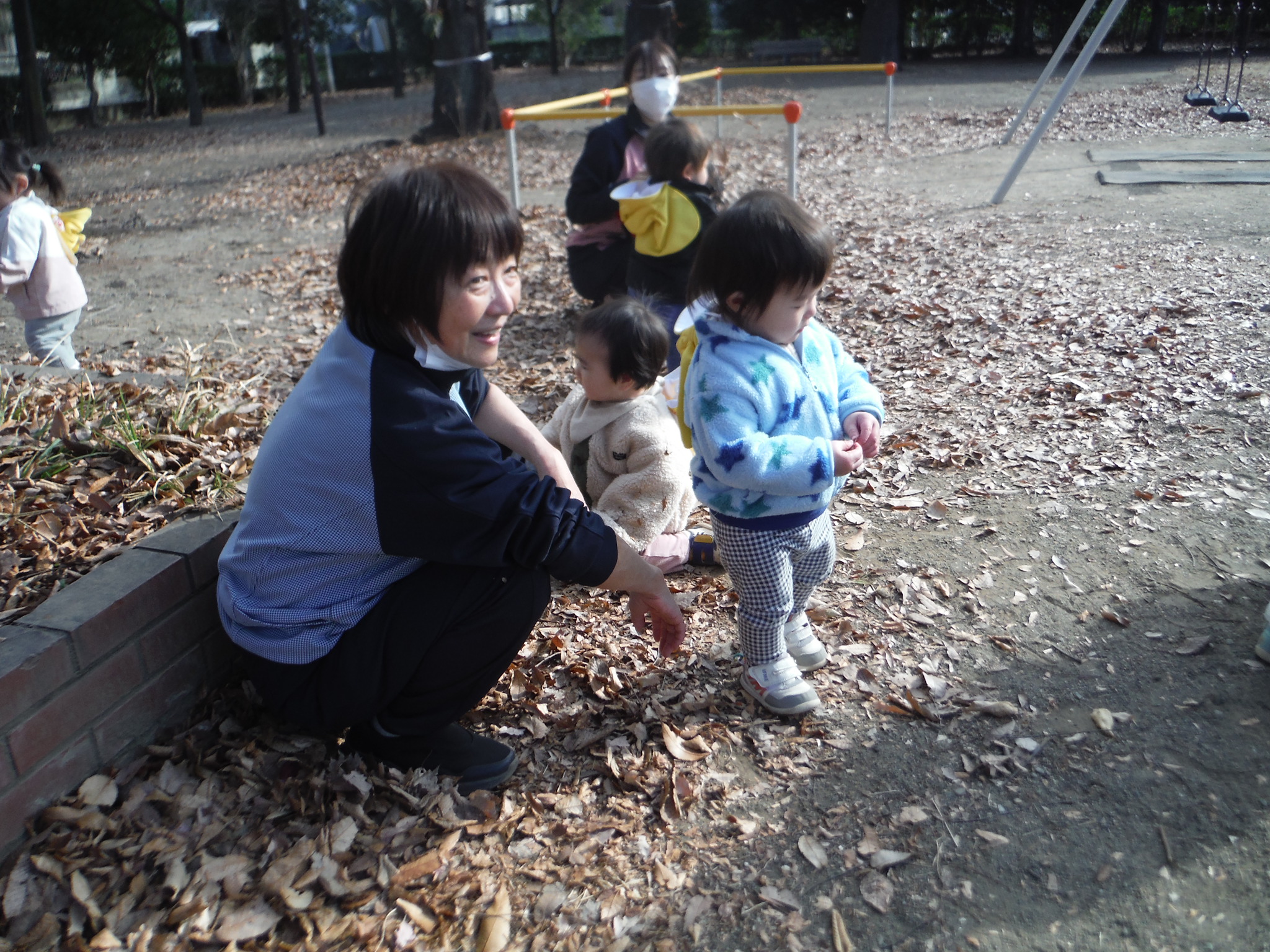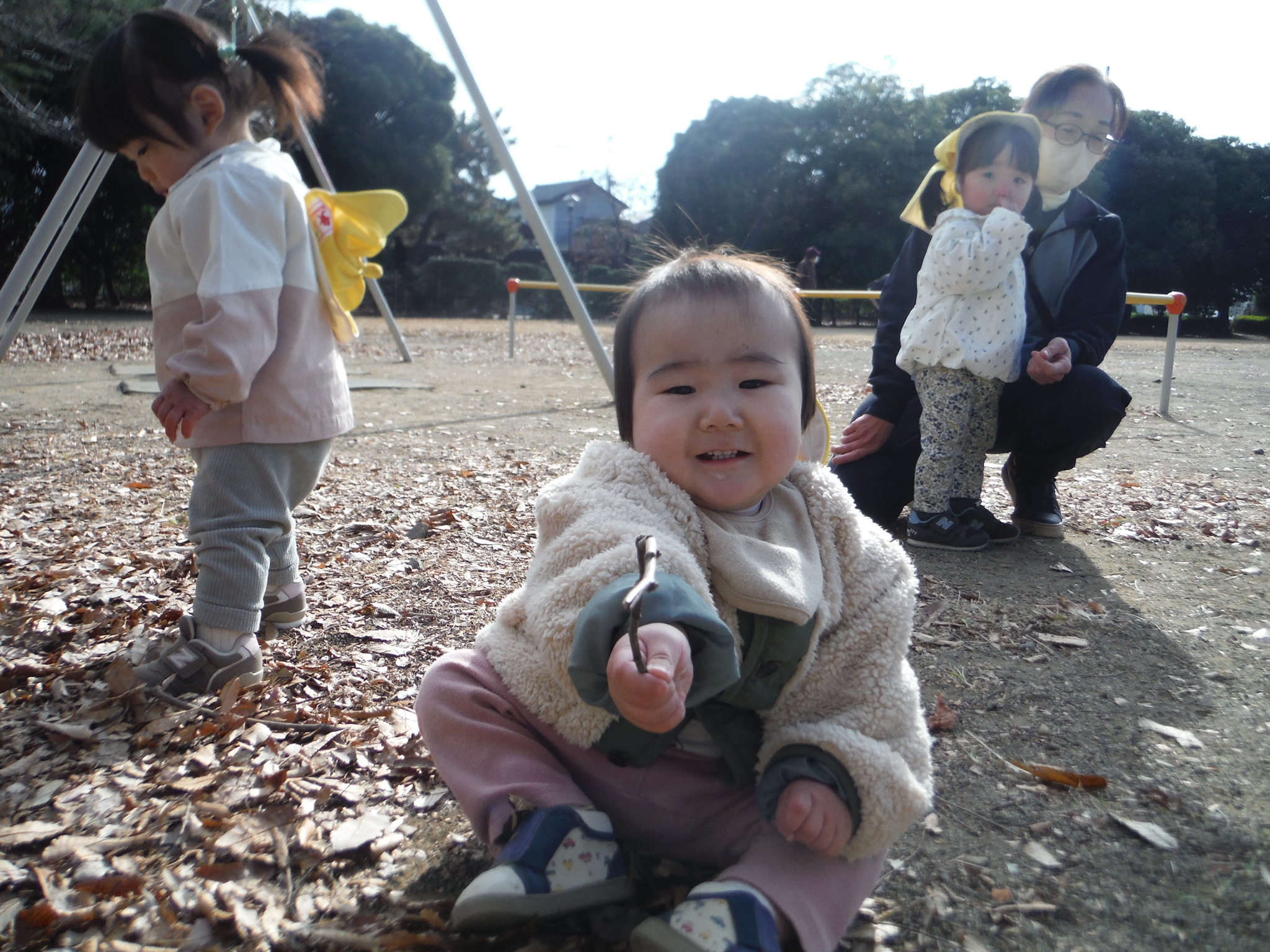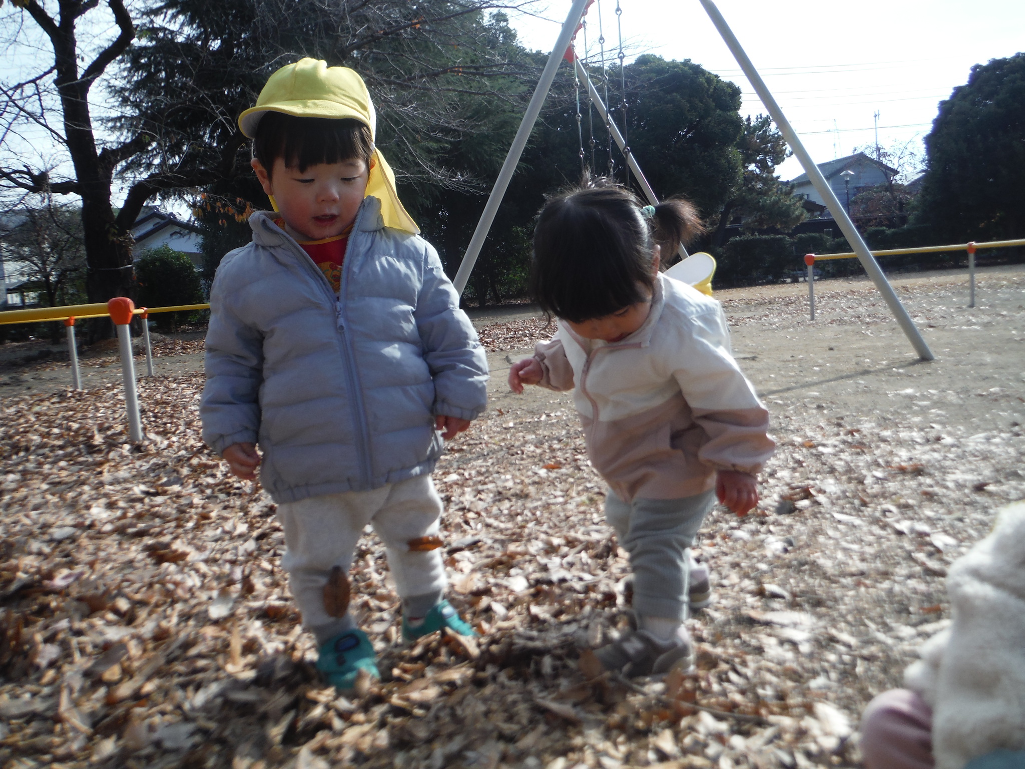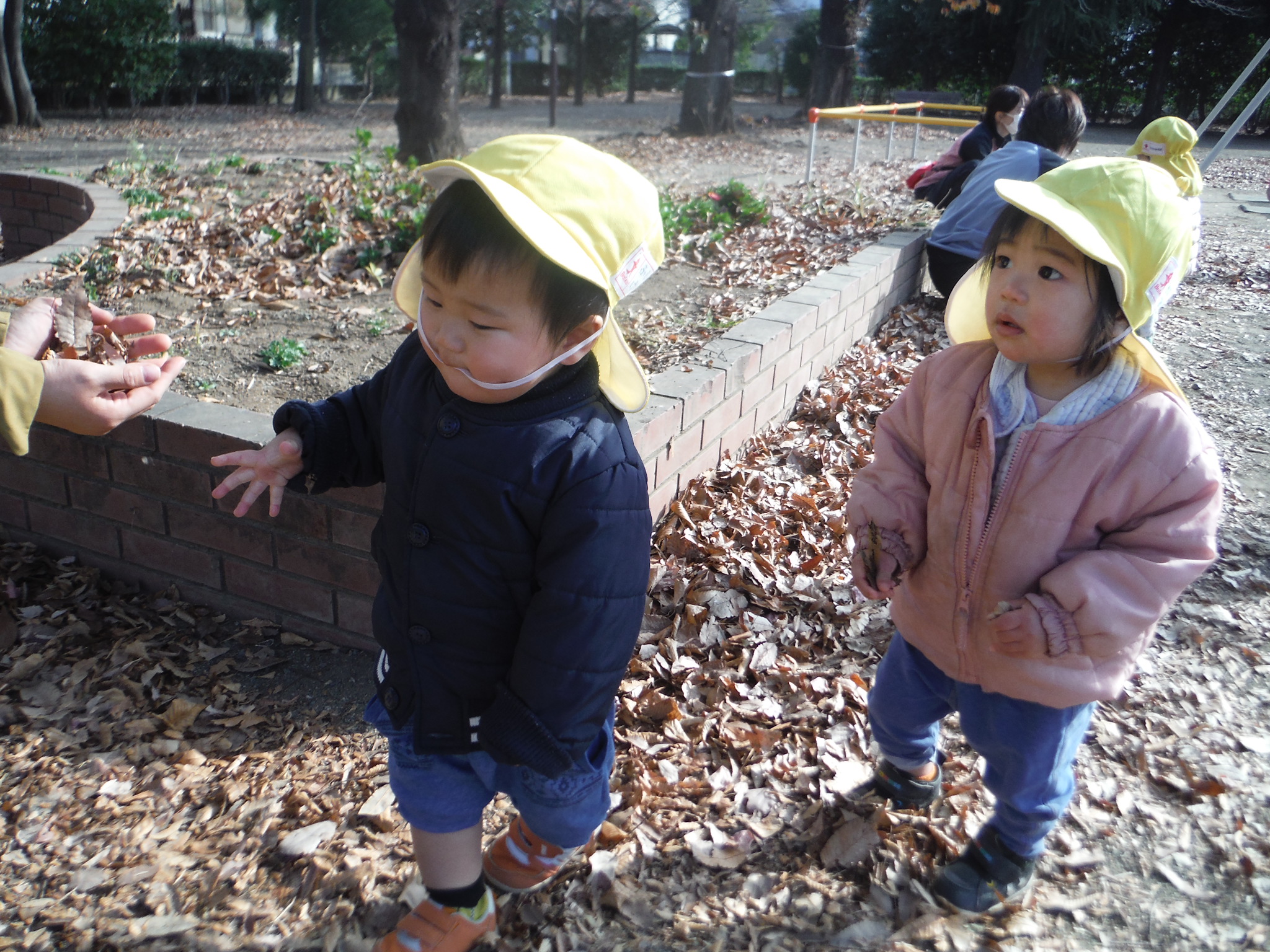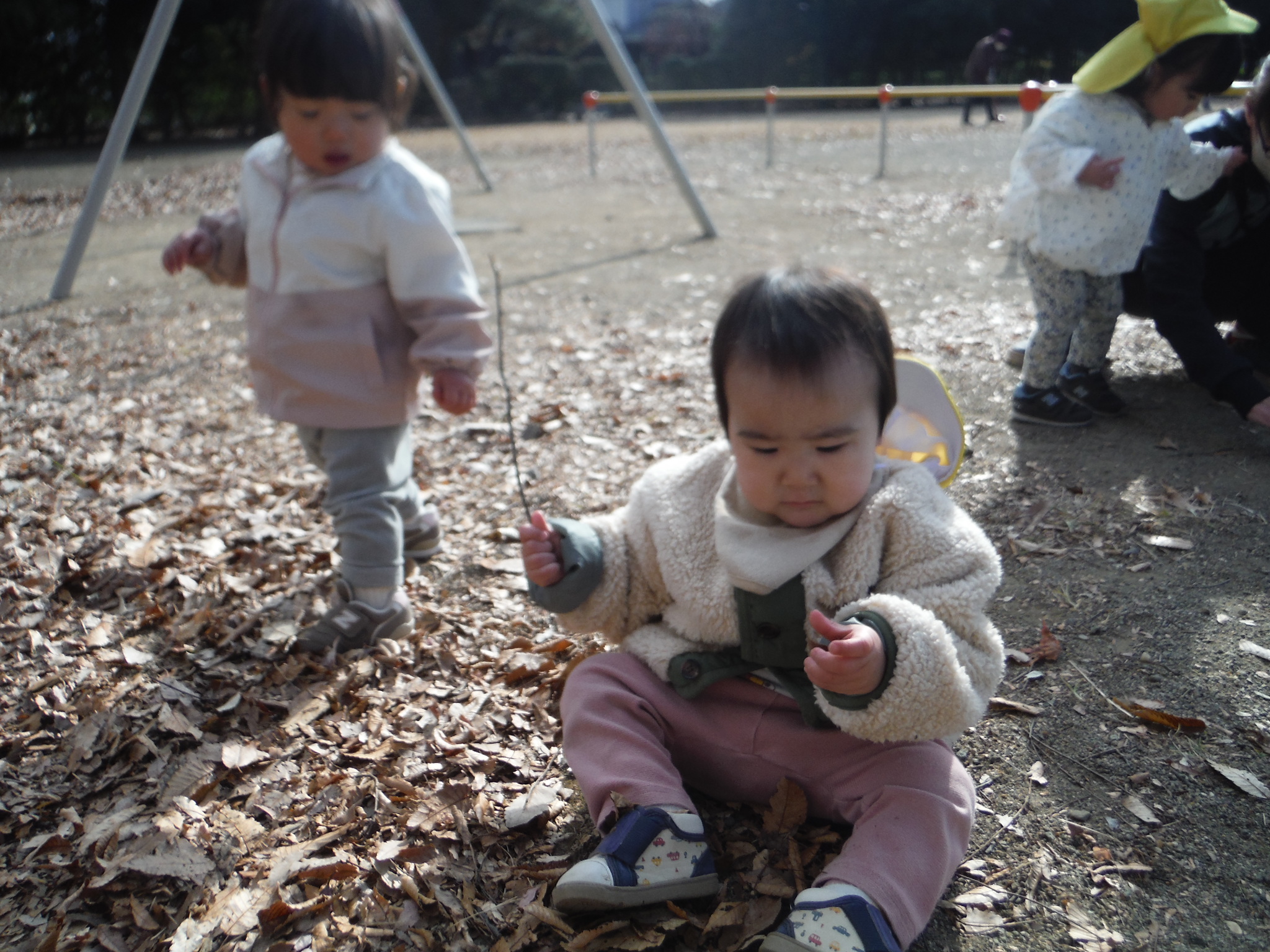 公園に行くと、葉っぱいっぱい!パーッと遊びました。