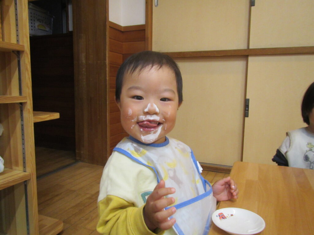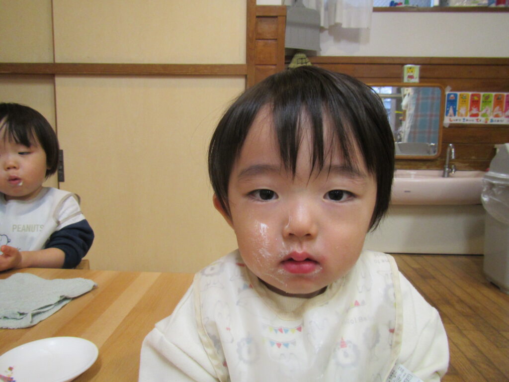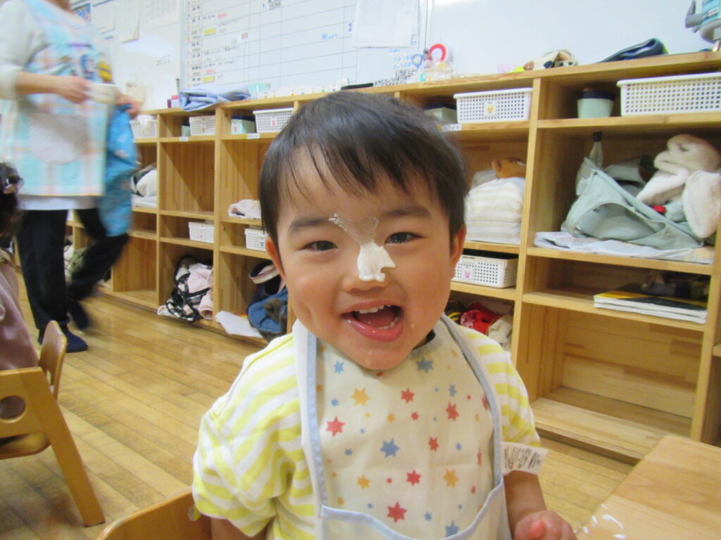 クリスマスの日に生クリーム付きのホットケーキが出ました🍰生クリームをお顔に付けてサンタさんのようになってしまいました🎅