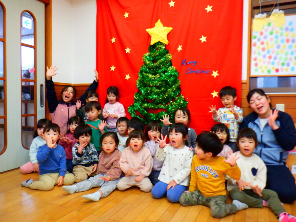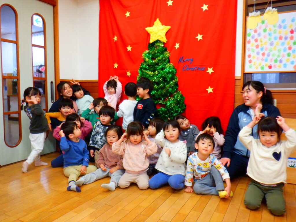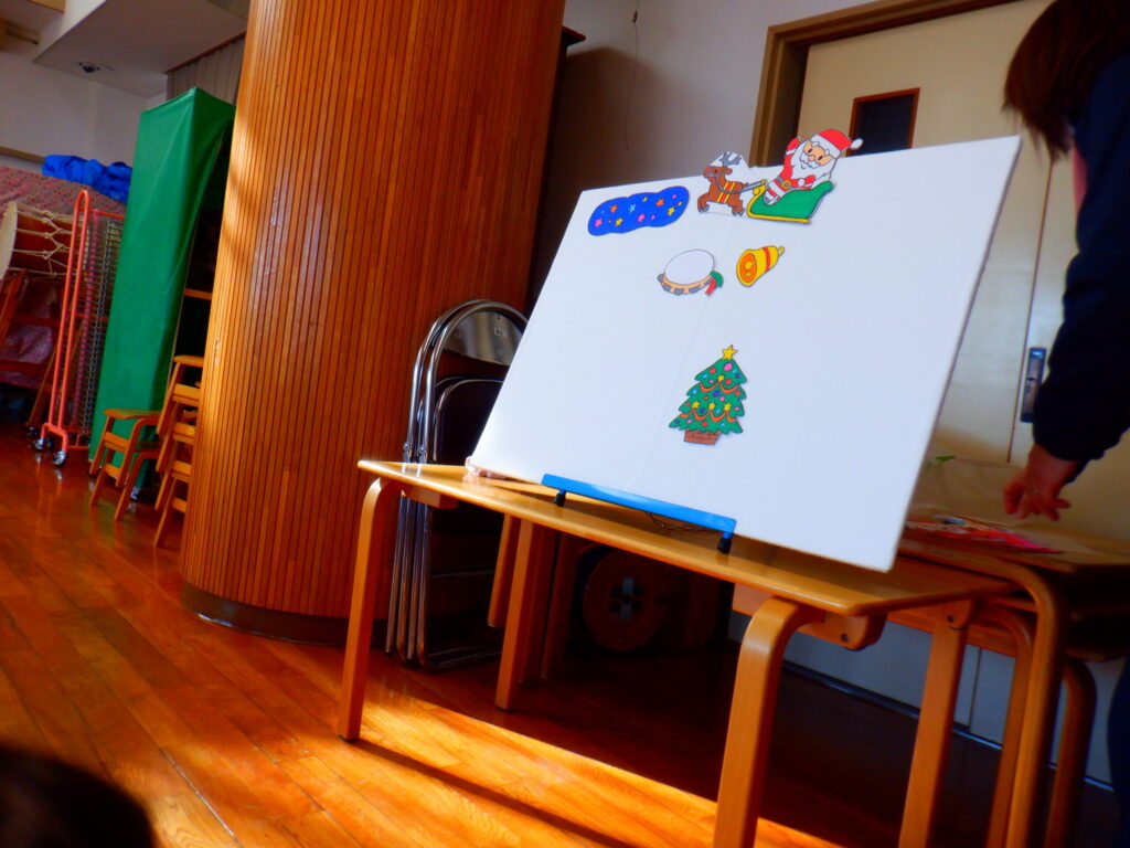 12月23日にクリスマスのリトミックをしました!ジングルベルなどクリスマスの曲に合わせてピアノをよく聞いて身体を動かしました!鈴とたまごマラカスを持ってリンリン♪シャカシャカ♪と楽しく振っていました😊あわてんぼうのサンタクロースのパネルシアターを見て、サンタさんを「がんばれー!」と応援していました✨