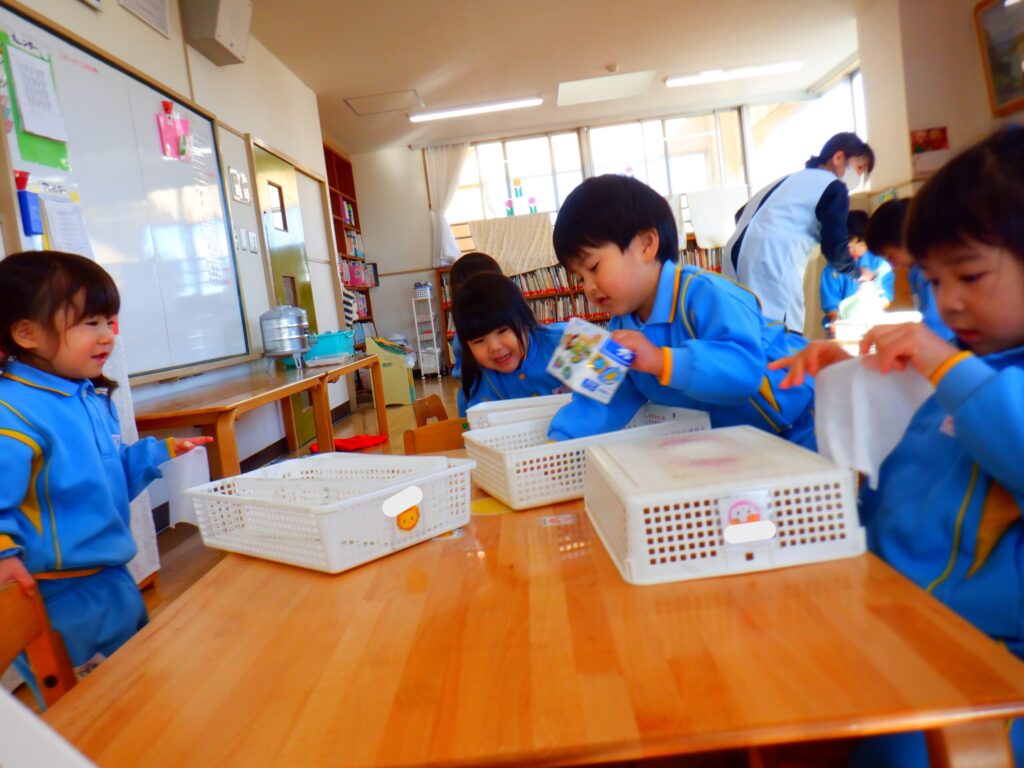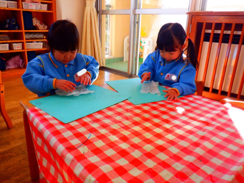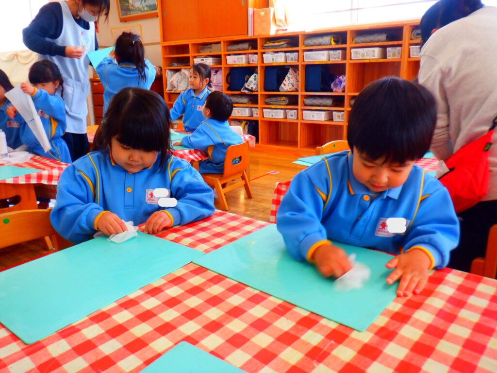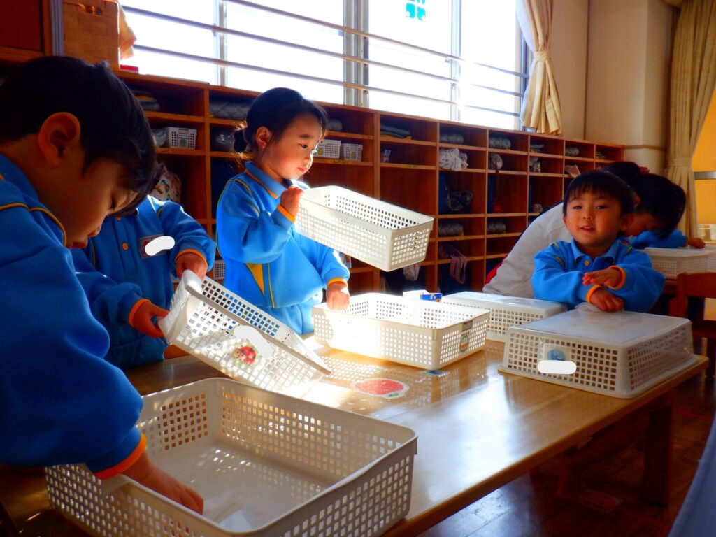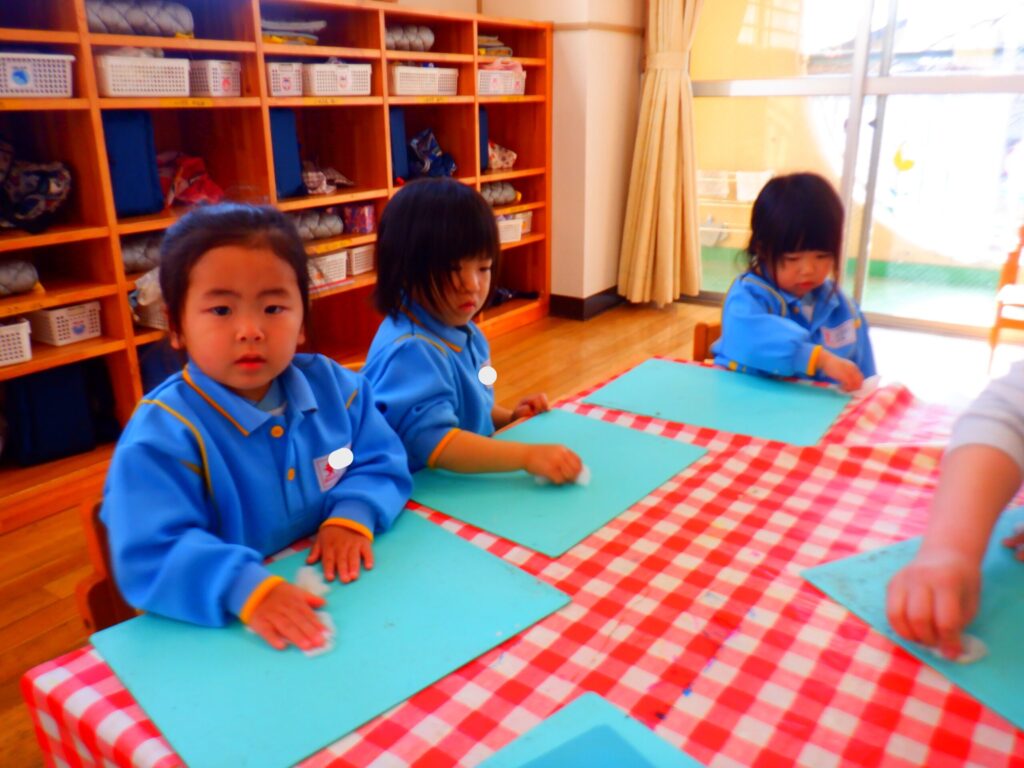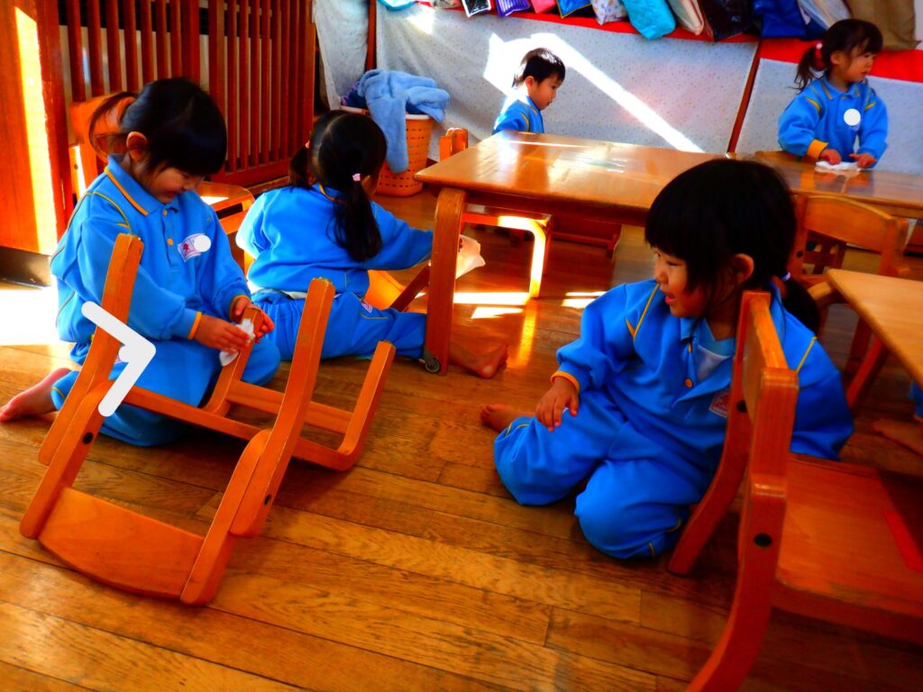 12月26日にお部屋の大掃除をしました。「たくさん使ったよ!ありがとう!」の気持ちを込めて椅子やかご、粘土板を一生懸命拭いていたひまわり組さんでした🌻