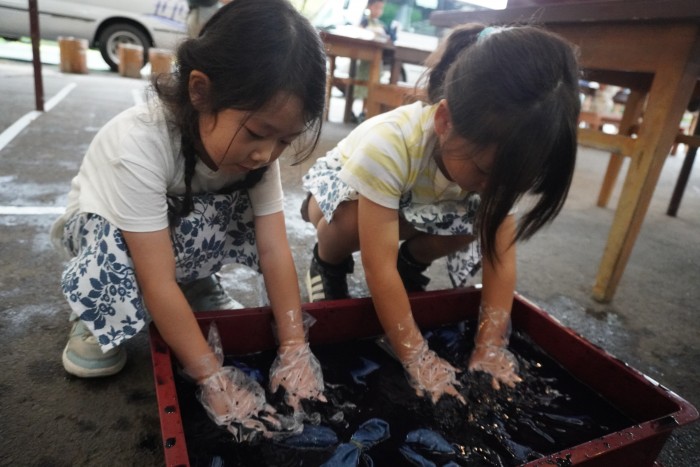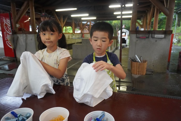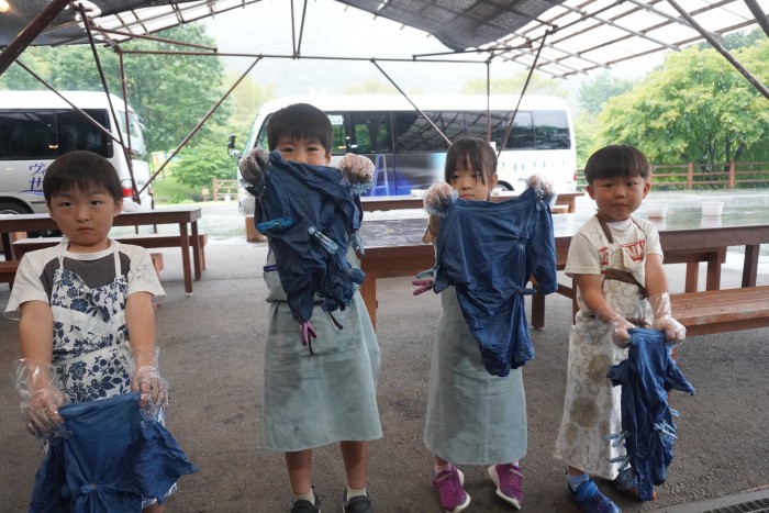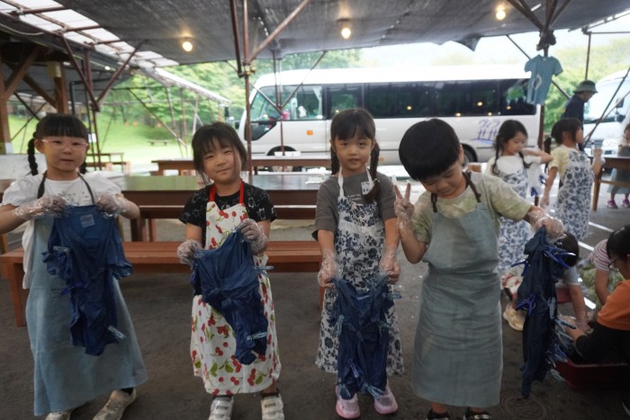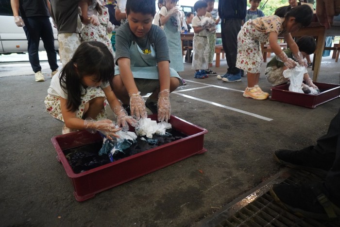 マホーバの森にて藍染め体験! 輪ゴムで結んで藍液につけました☺️