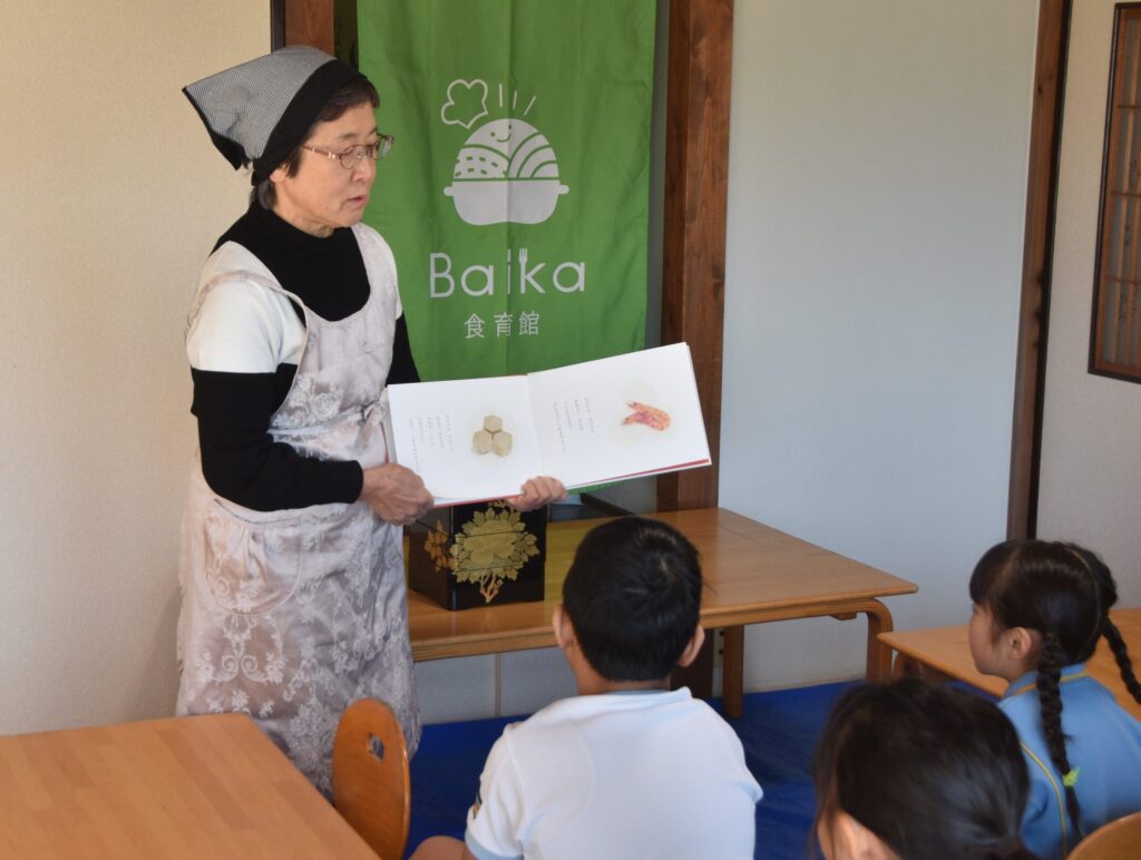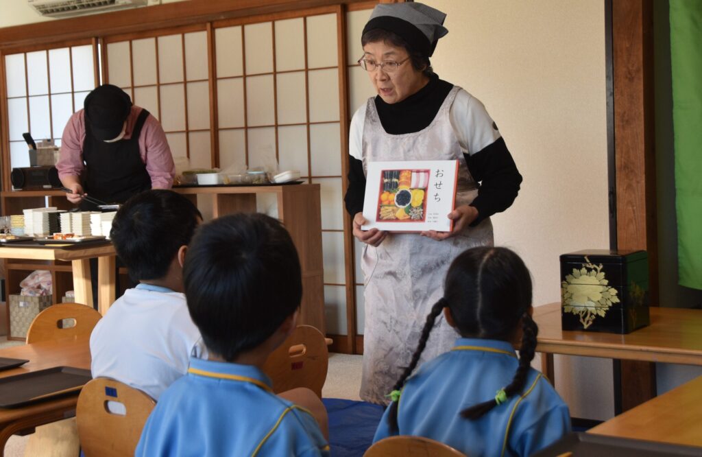 年長児が食育館へ行き、智子先生から『おせち』について学びました。