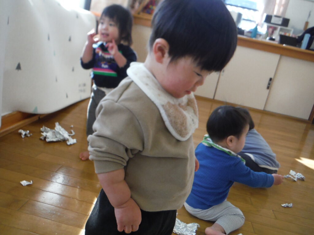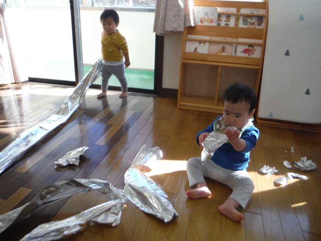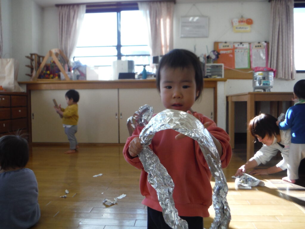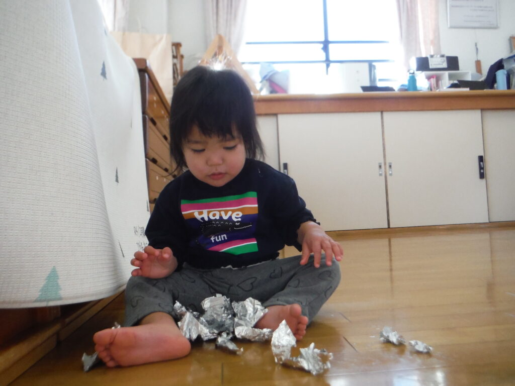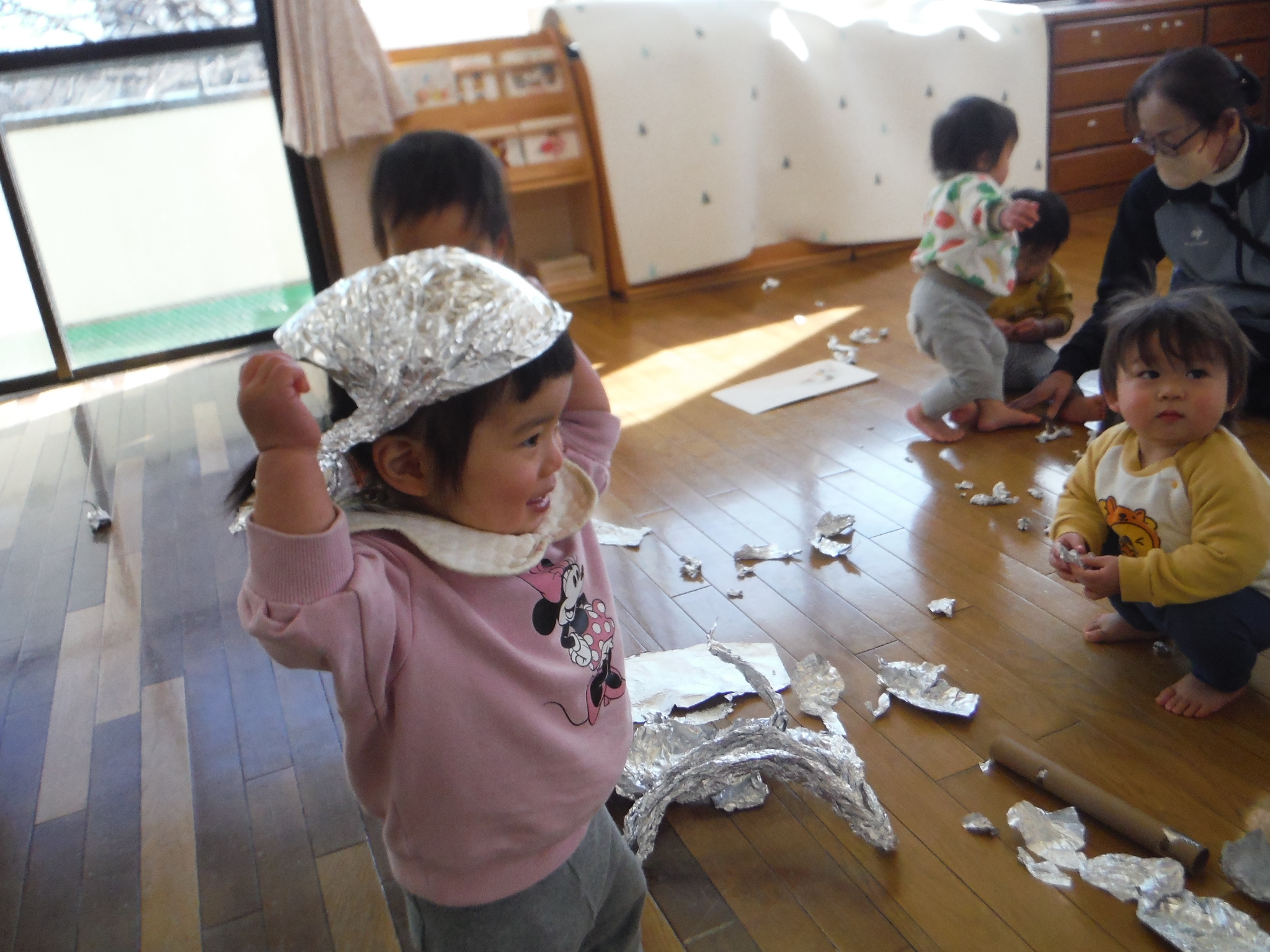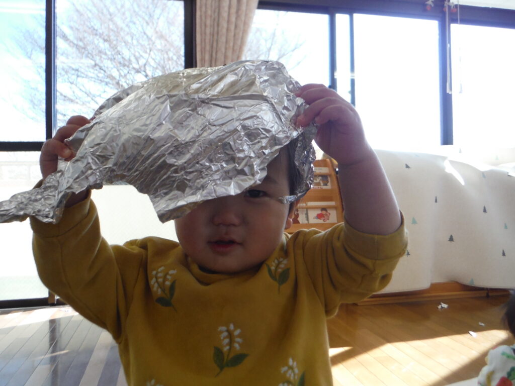 引っ張りだしたり、丸めたり、ちぎったり、被ってみたり。楽しみました♪