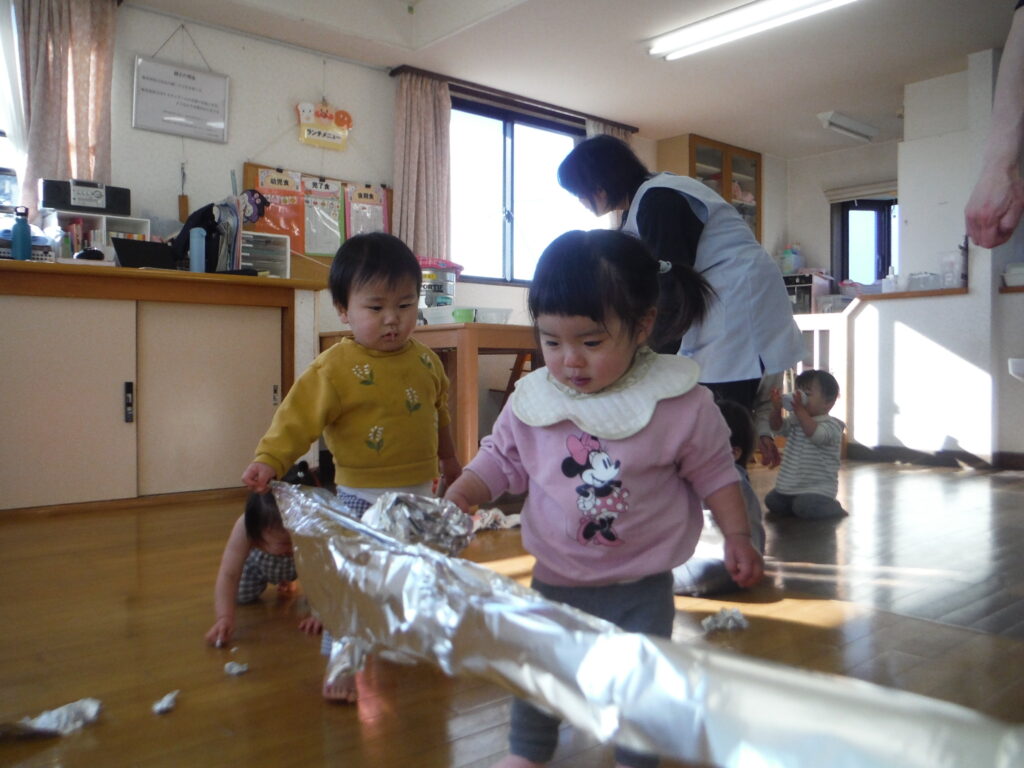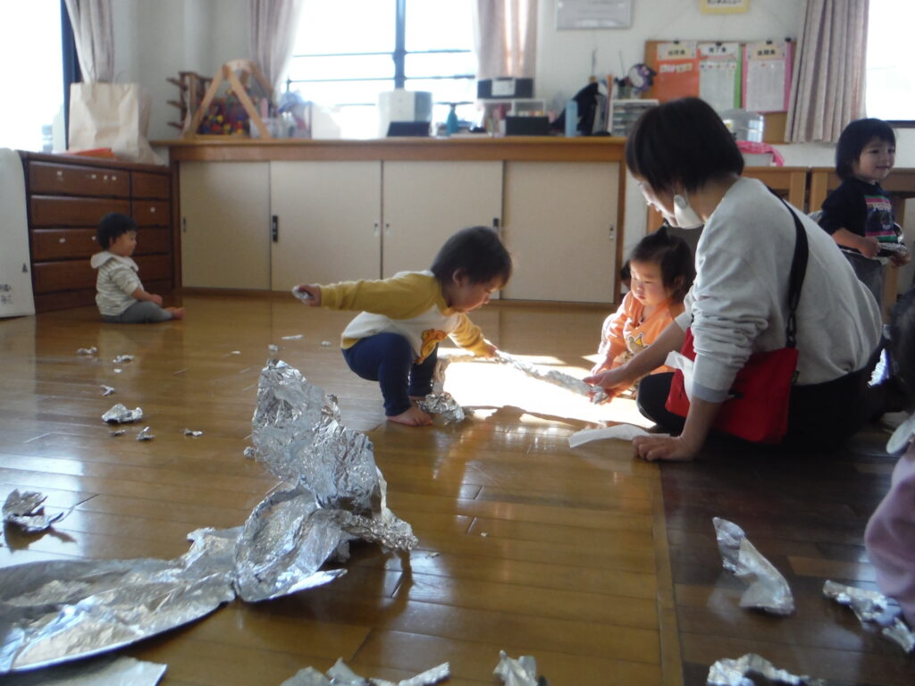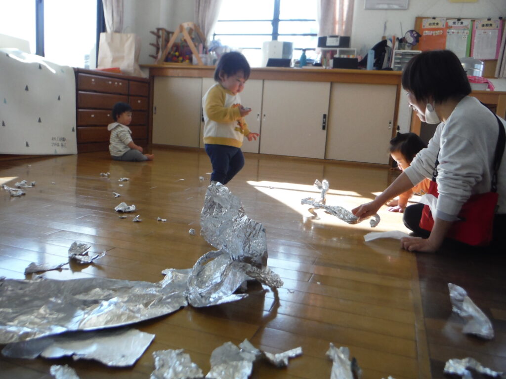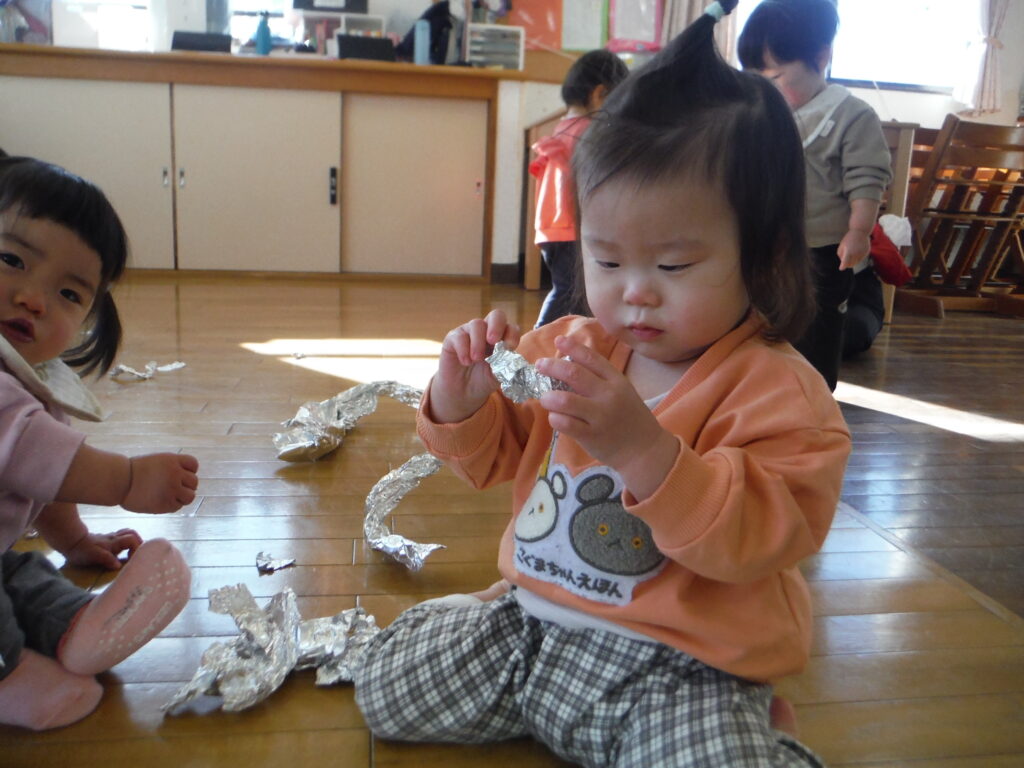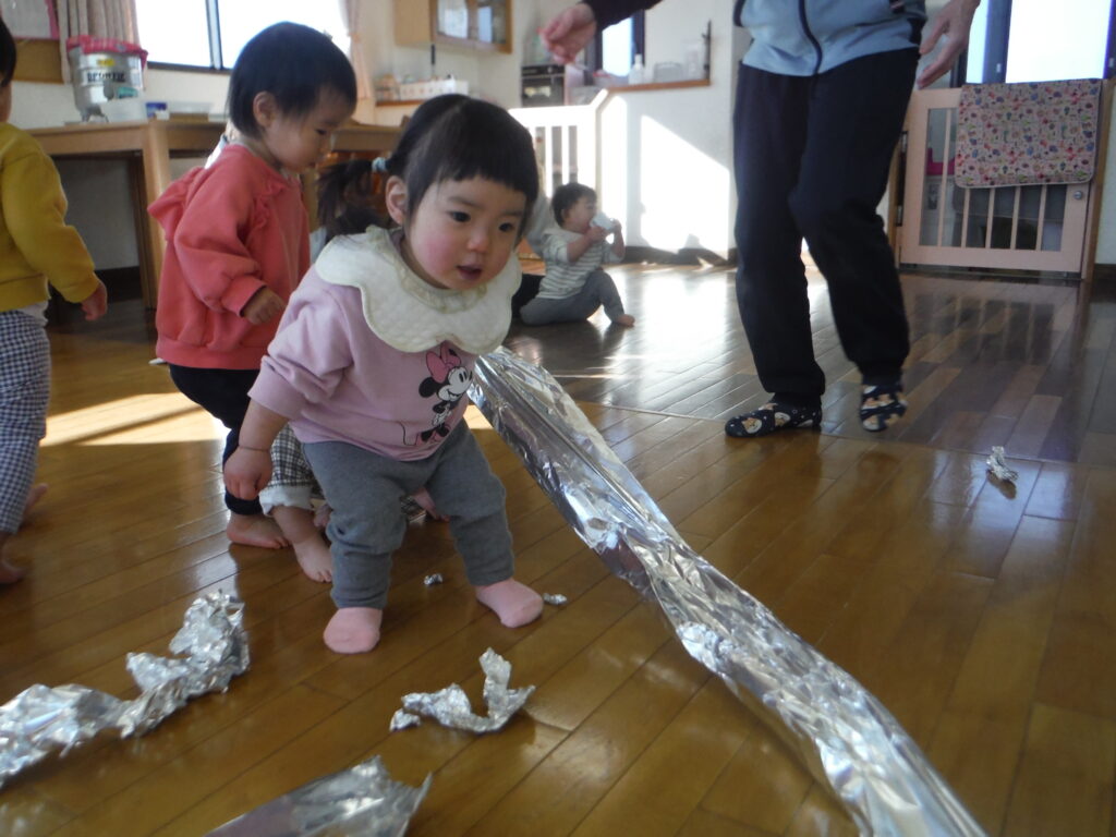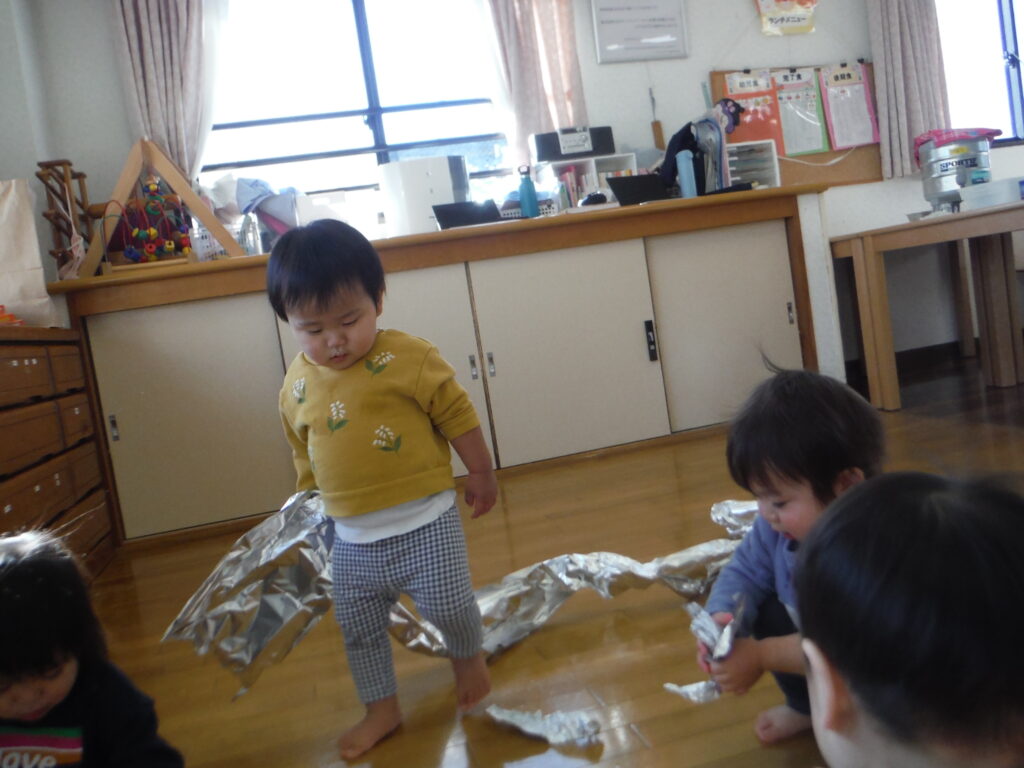 引っ張りだしたり、丸めたり、ちぎったり、被ってみたり。楽しみました♪