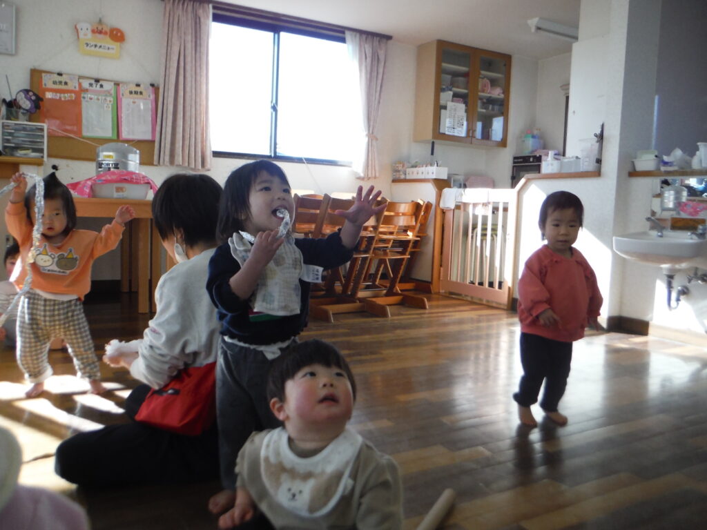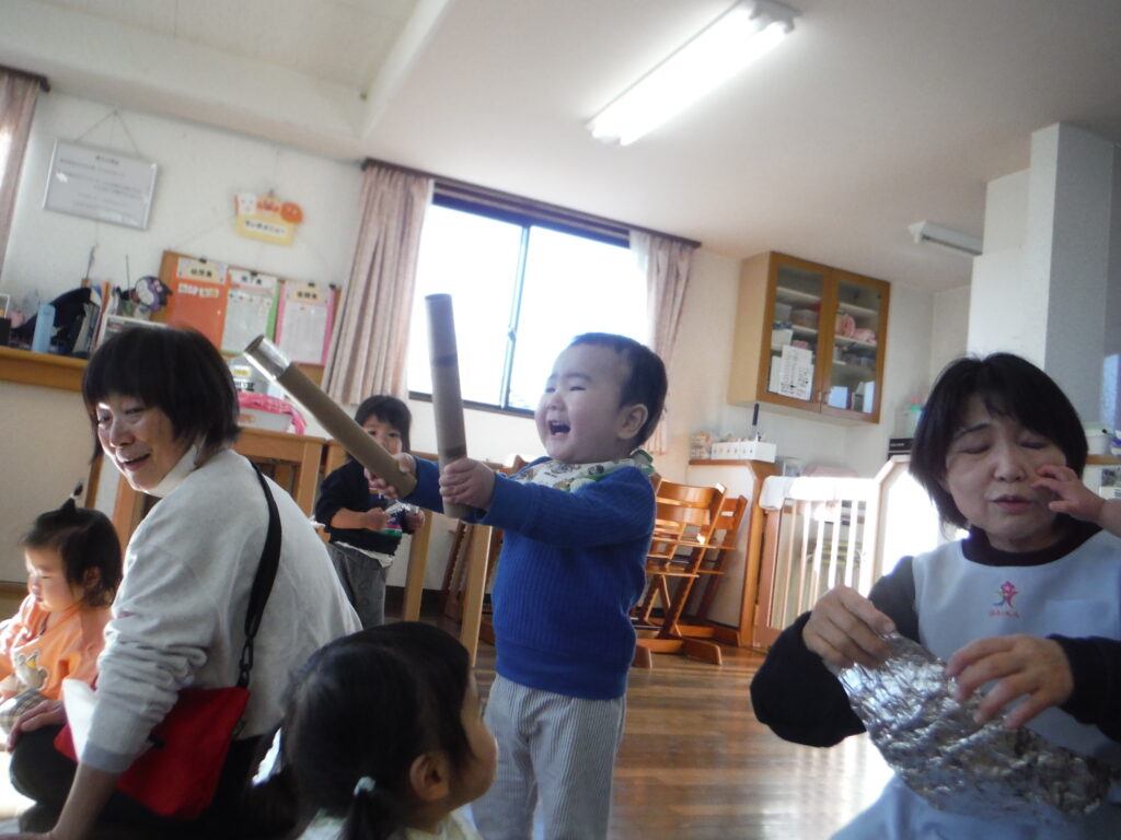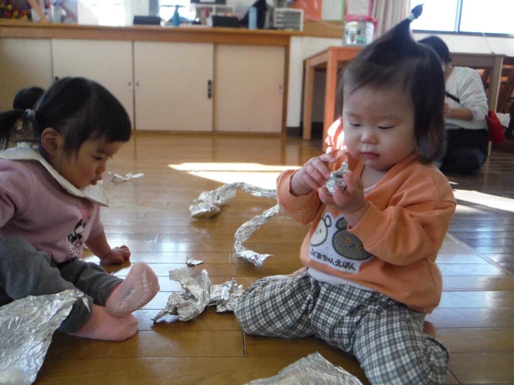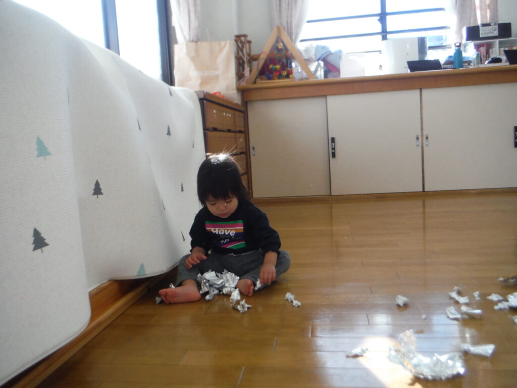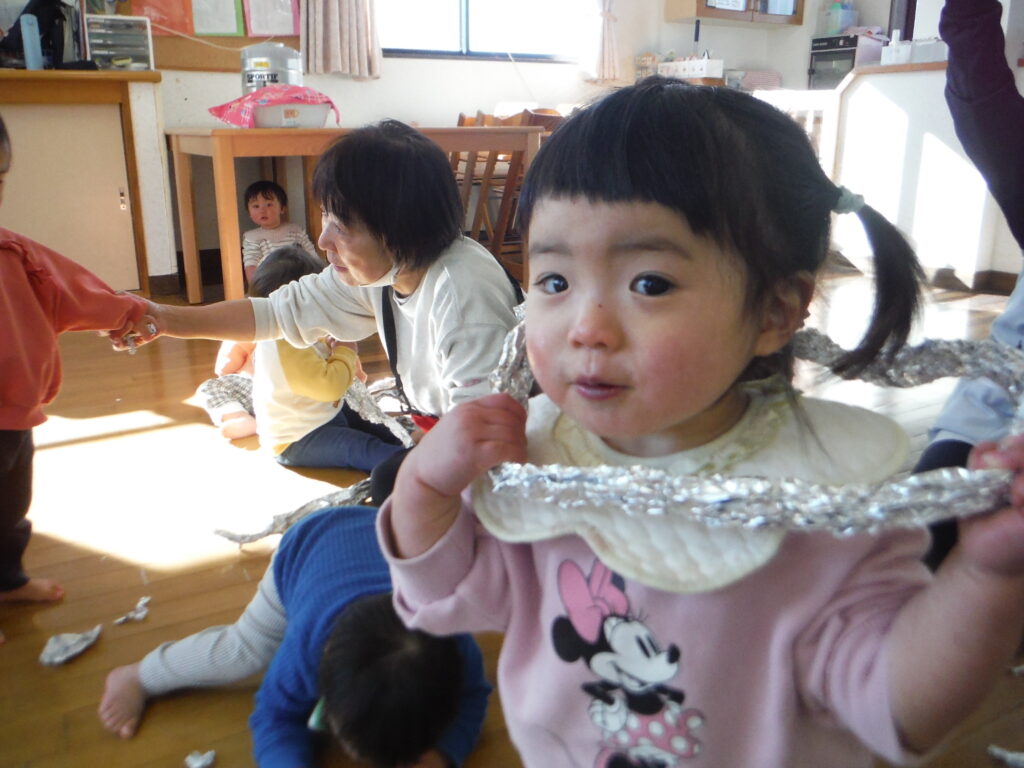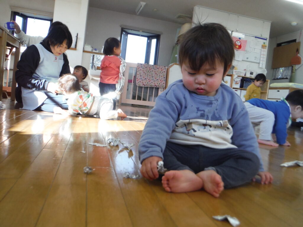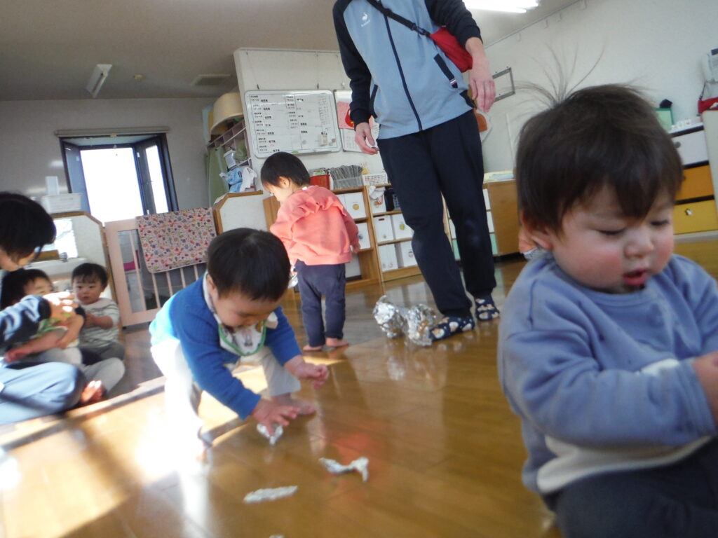 引っ張りだしたり、丸めたり、ちぎったり、被ってみたり。楽しみました♪