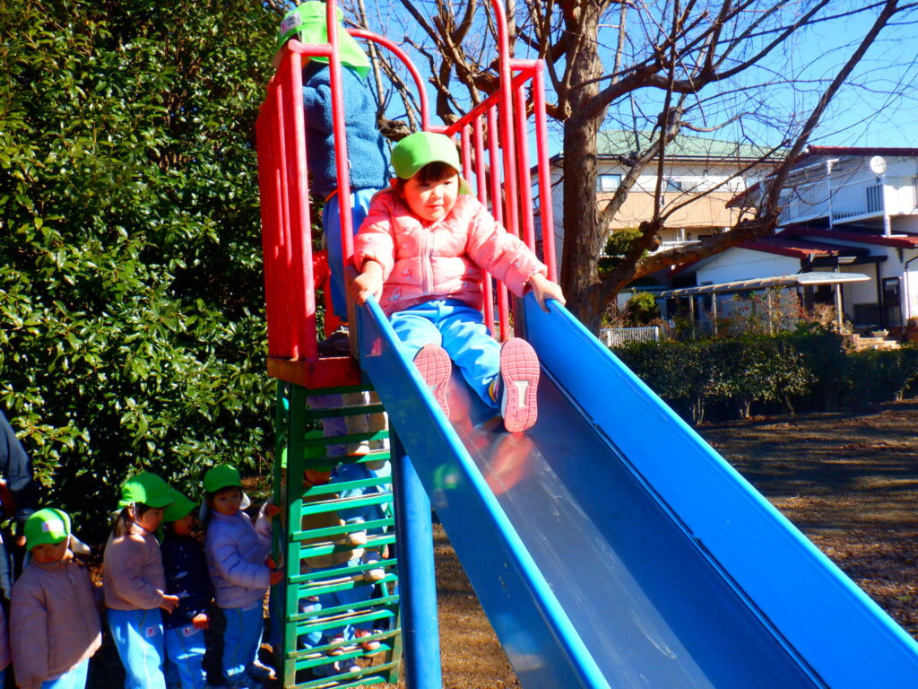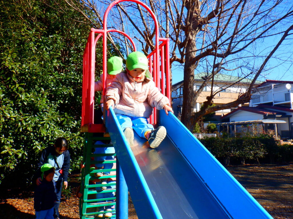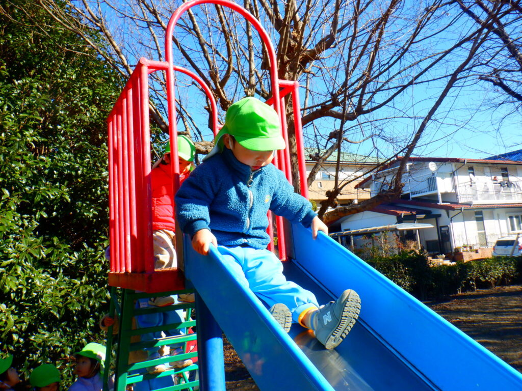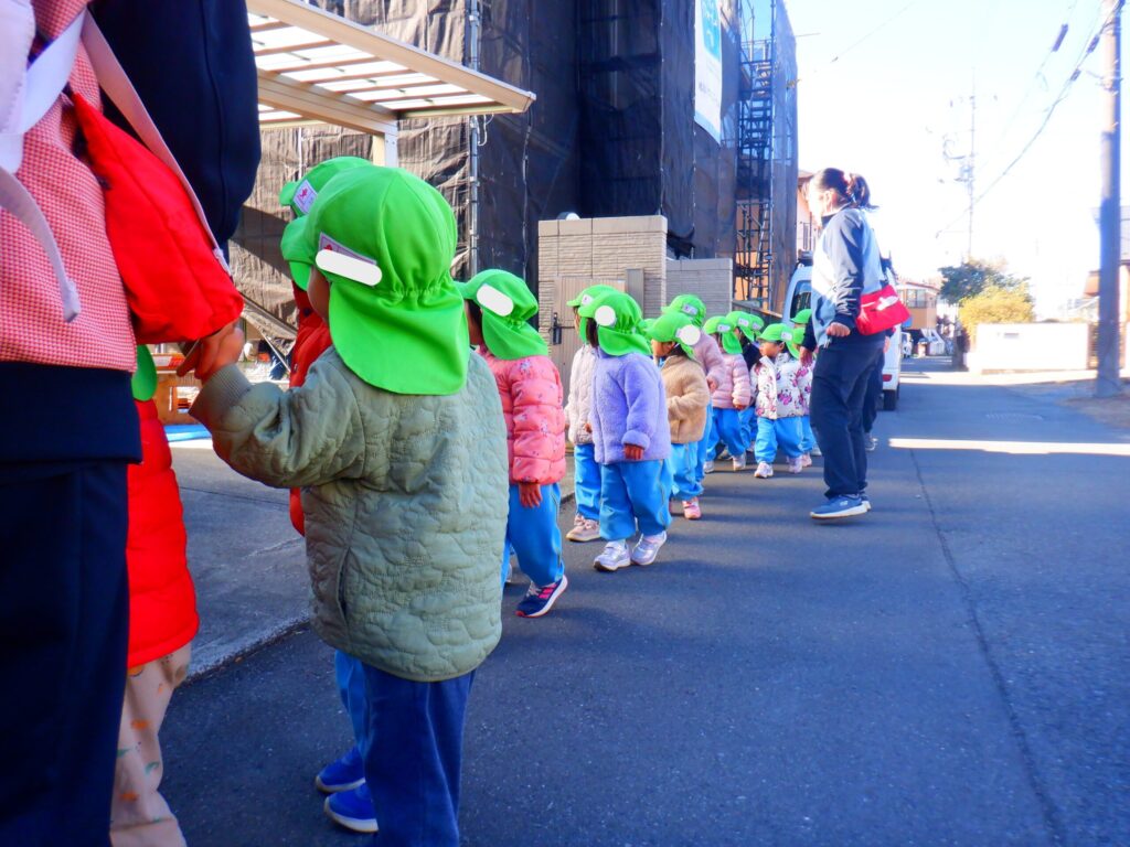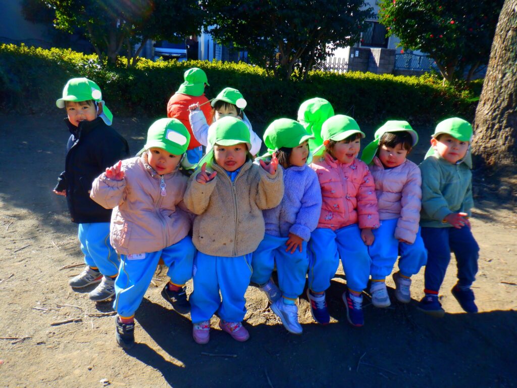 見福公園までお散歩に行きました!冬休み明けで久々のお散歩でしたが二人組でぎゅっと手を繋いで歩くことができました!高い滑り台を滑ったり、落ち葉を「ばー!」と投げてみたり公園内で楽しく過ごしました✨集まれー!の声を聞いて勢いよく走ったひまわり組さんでした😊