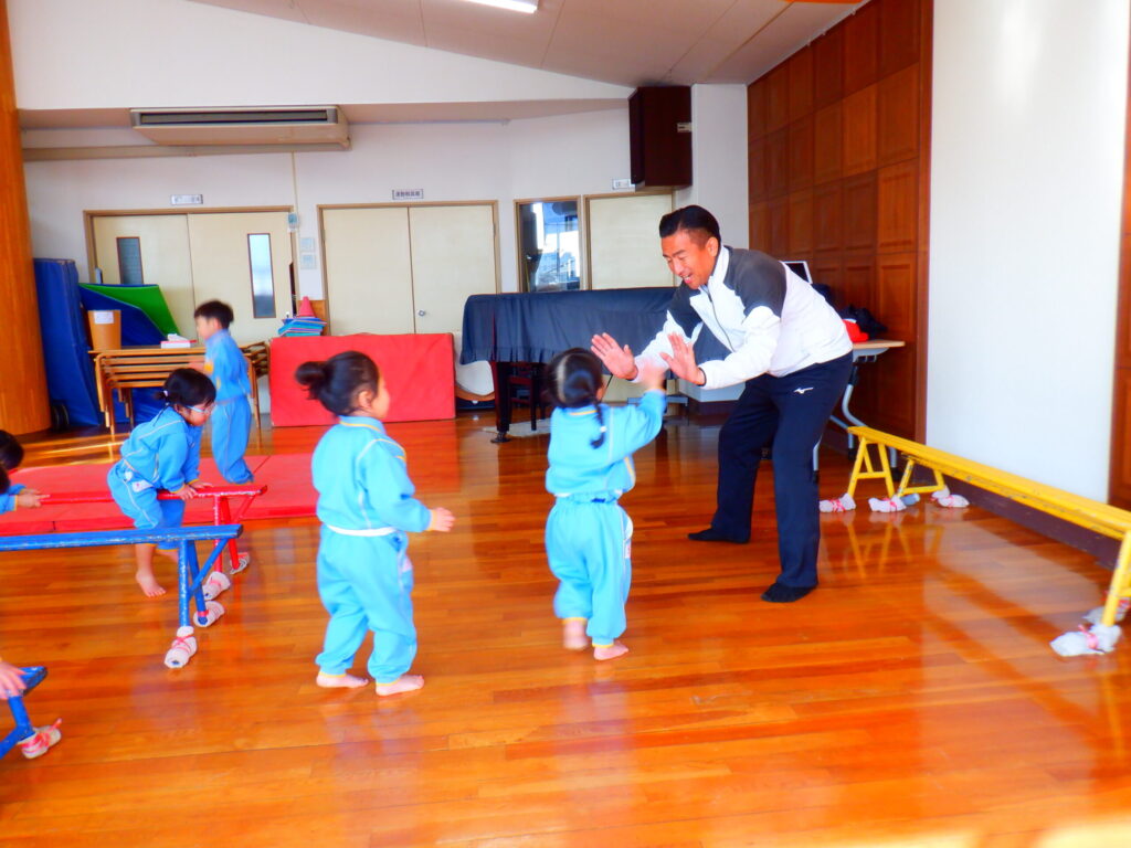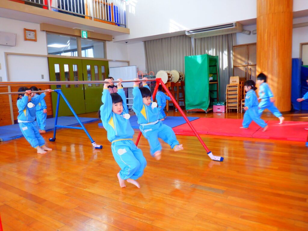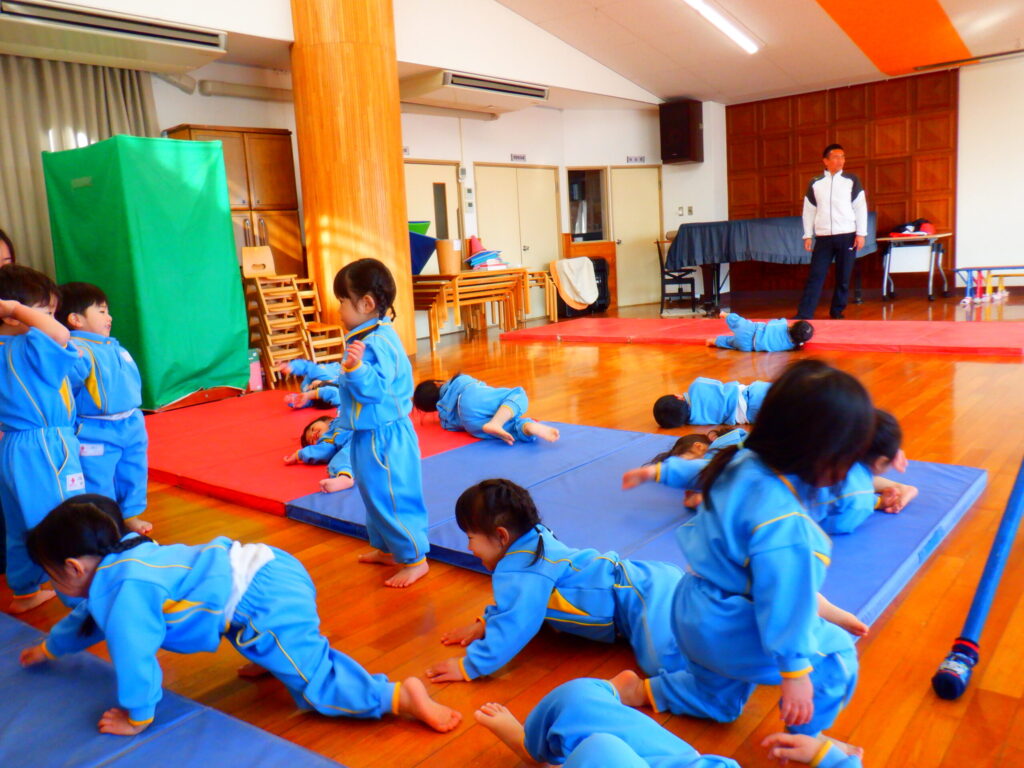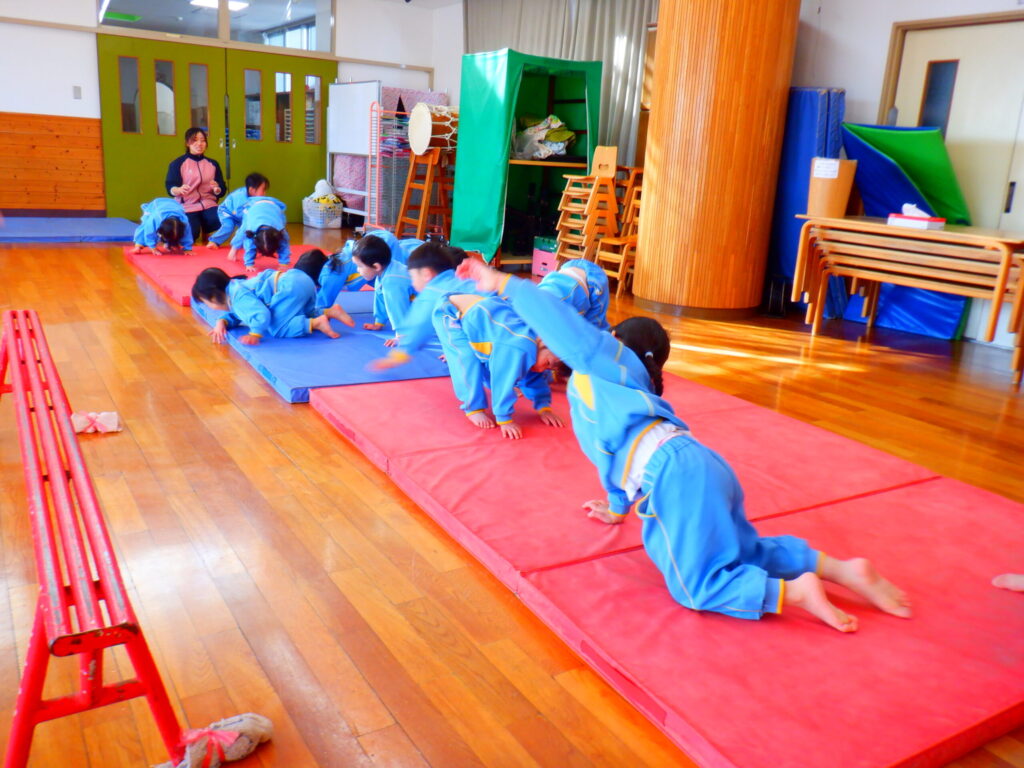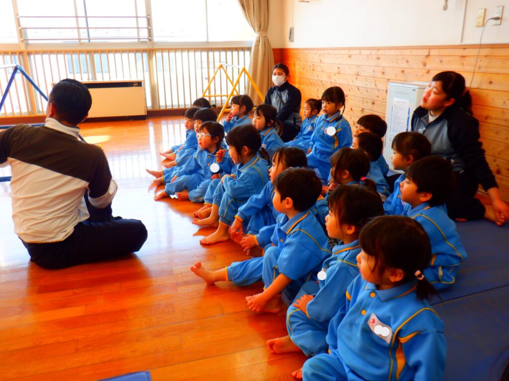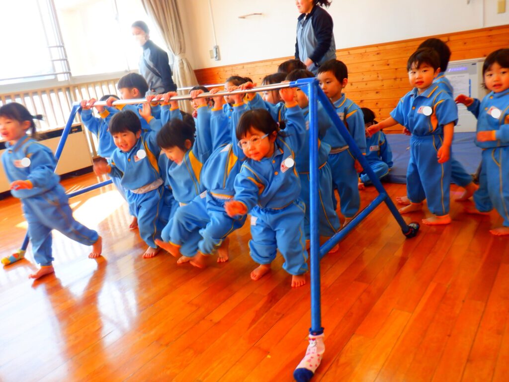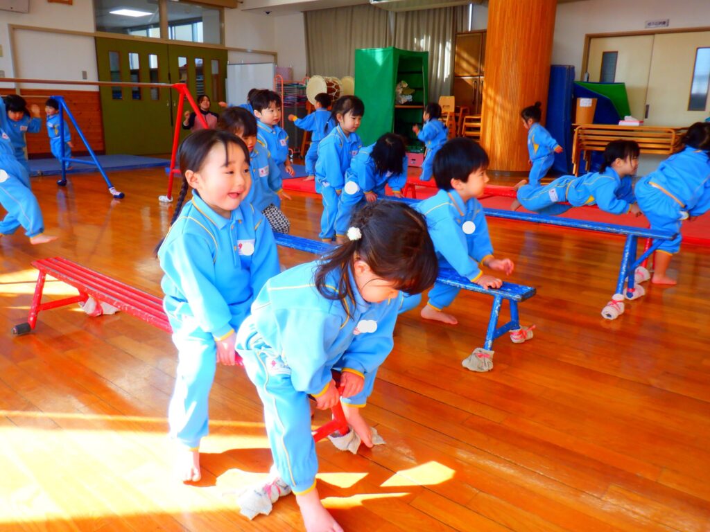 げんき先生の体育指導がありました。「青いマットに集まれ!」の声が聞こえるとさっと集まって何が始まるかな?とワクワクした表情でした✨鉄棒ではたくさんお尻をふったり、マットの上は前くまさん・横くまさん・後ろくまさんで進んだり、マットの間をコロコロ転がって進んだりサーキットでたくさん身体を動かしたひまわり組さんでした🌻