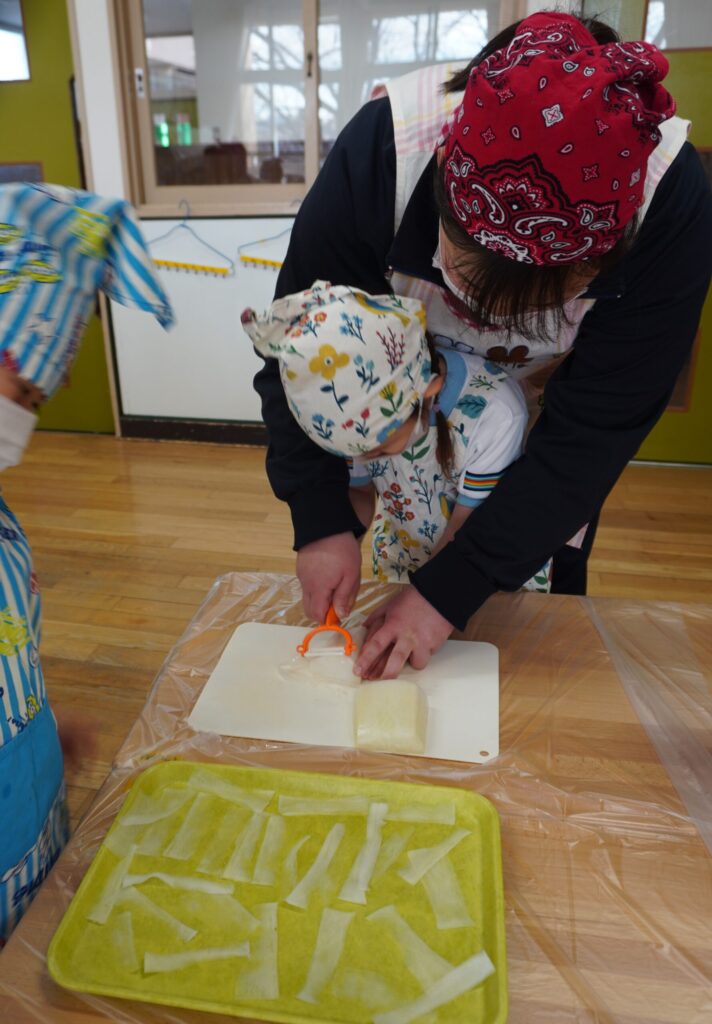 すみれ組では、つばめ組が収穫してくれた大根を使って切干大根を作りました😊