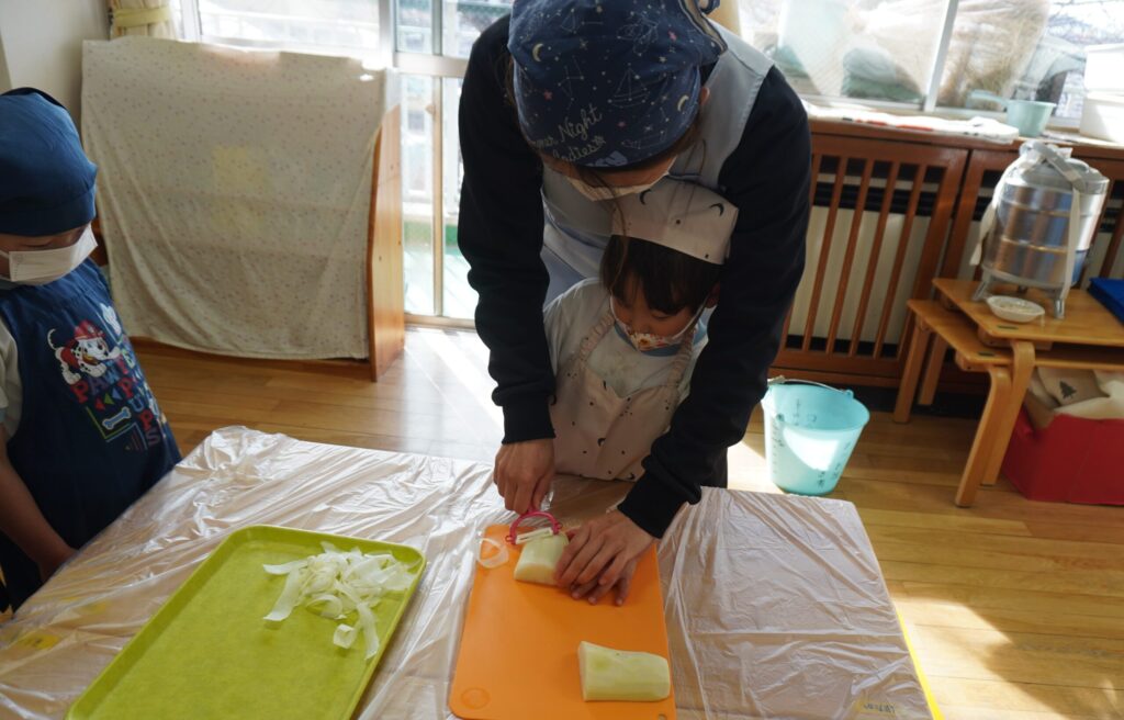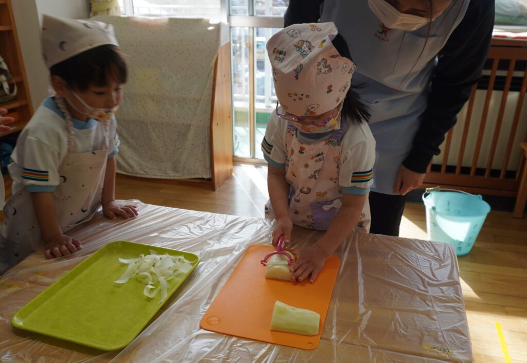 給食の先生が大根の皮を剥いてくれたので、すみれ組のお友達はピーラーを使ってスルスル剥いてくれました👩🍳