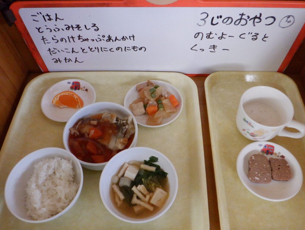 ・ごはん ・とうふみそ汁 ・タラのケチャップあんかけ ・大根と鶏肉の煮物 ・みかん