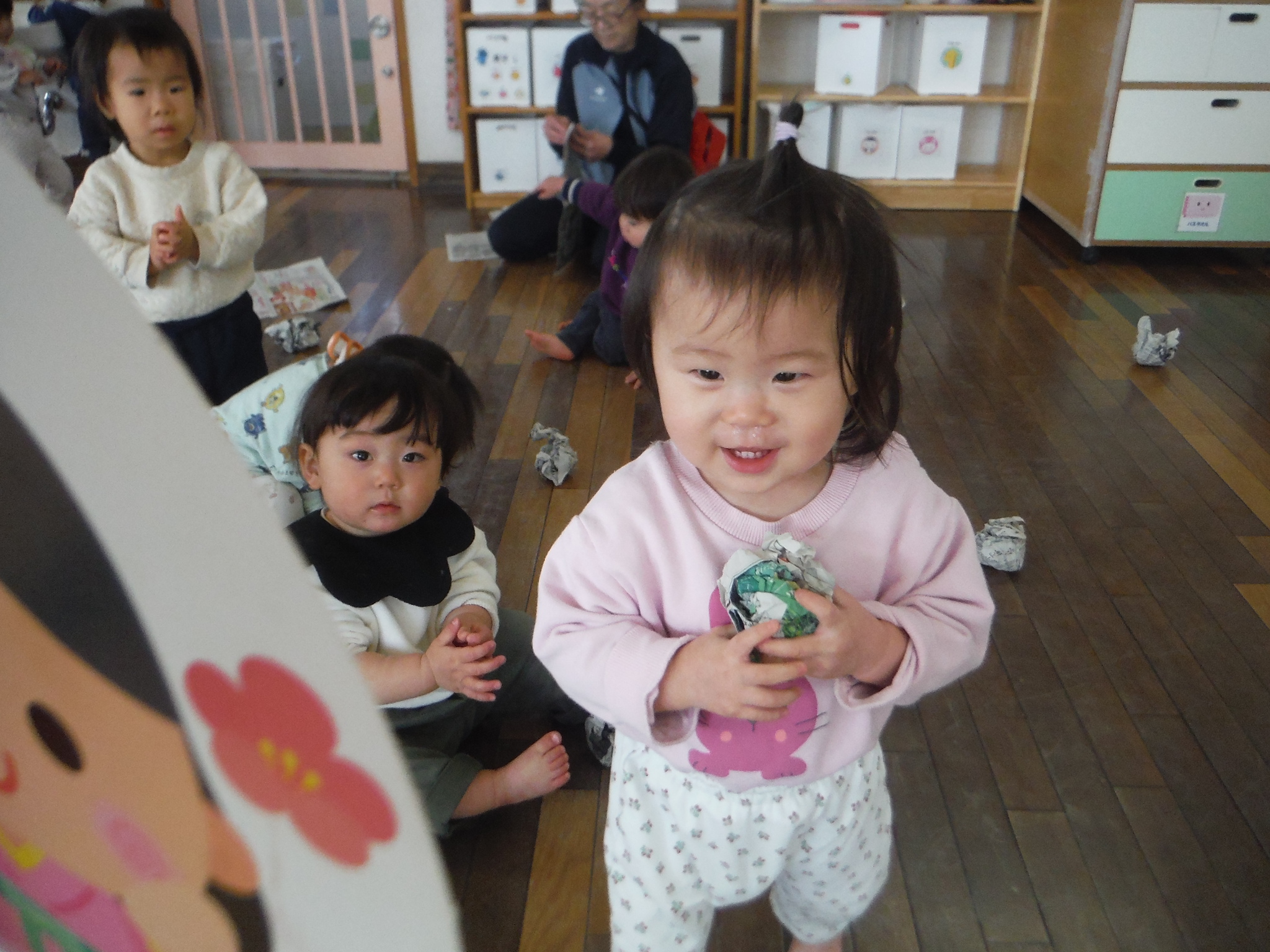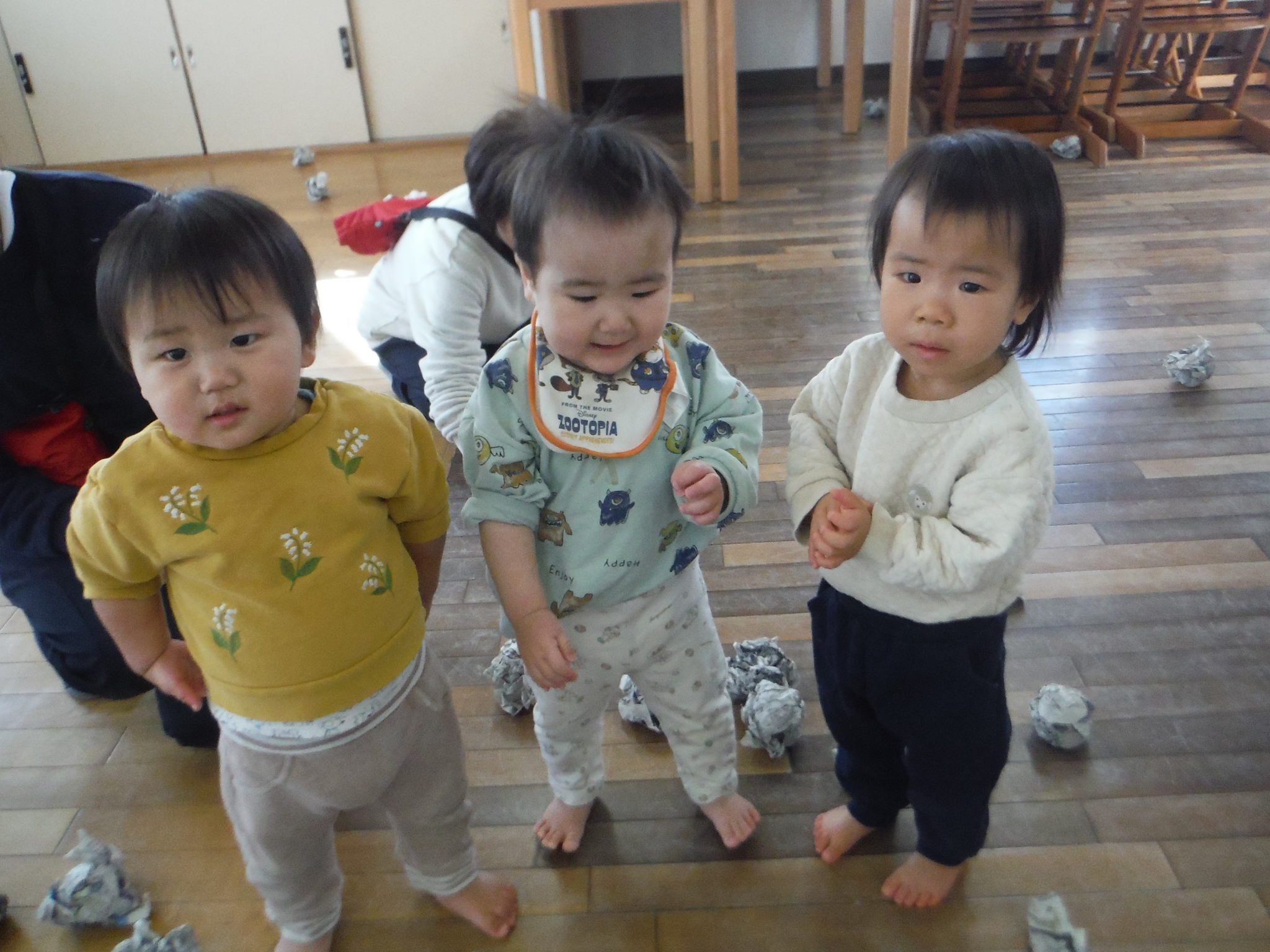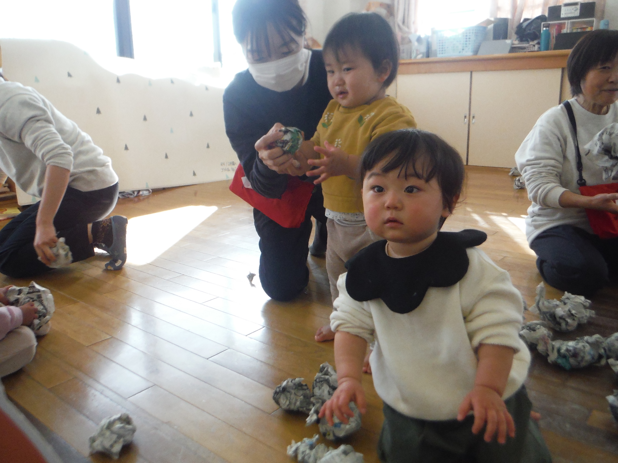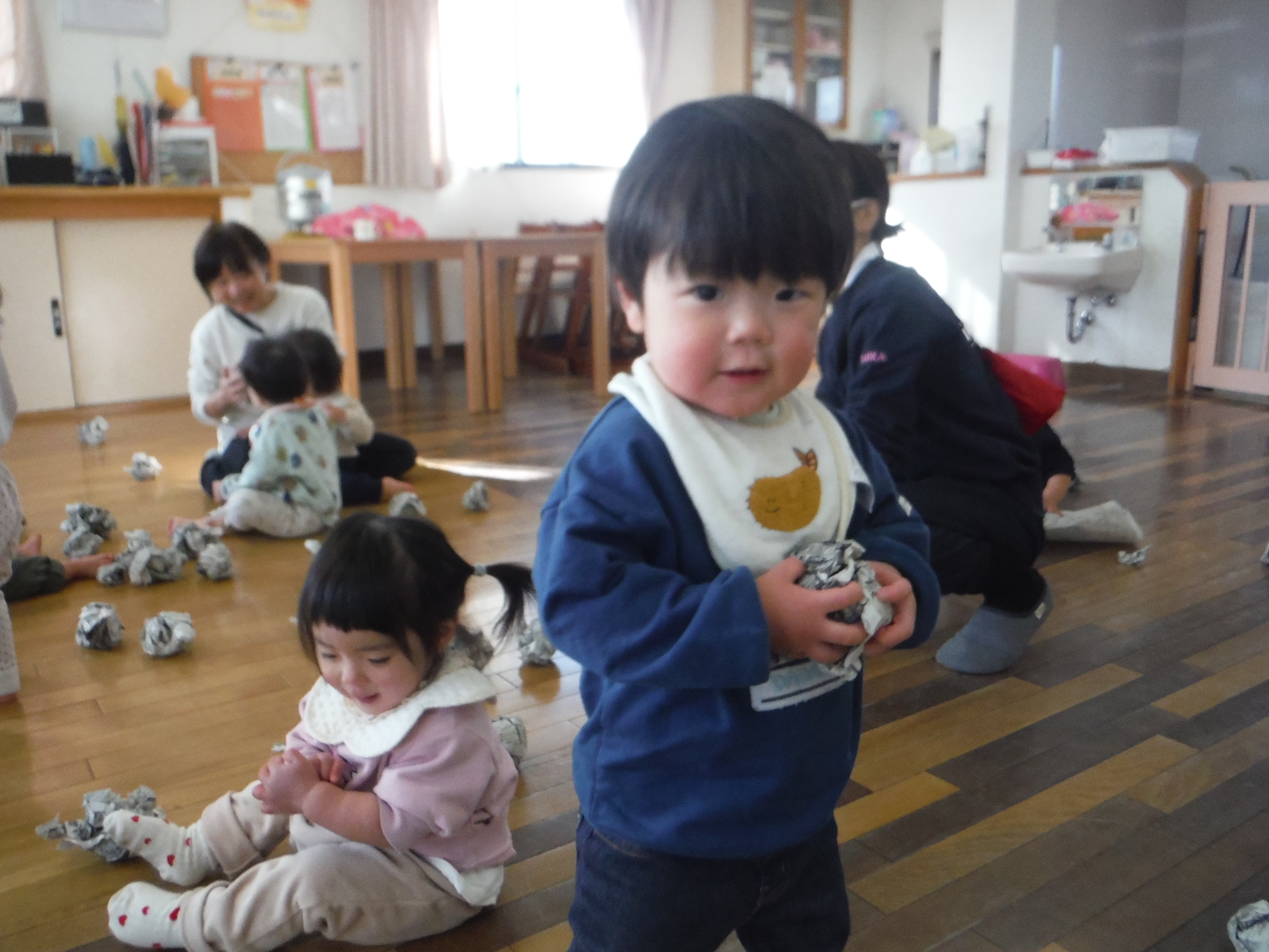 みんなで新聞紙を丸めて、ぽーい!鬼のカードに向かって投げたり、お外に向かって投げたり、可愛い姿が見られました!