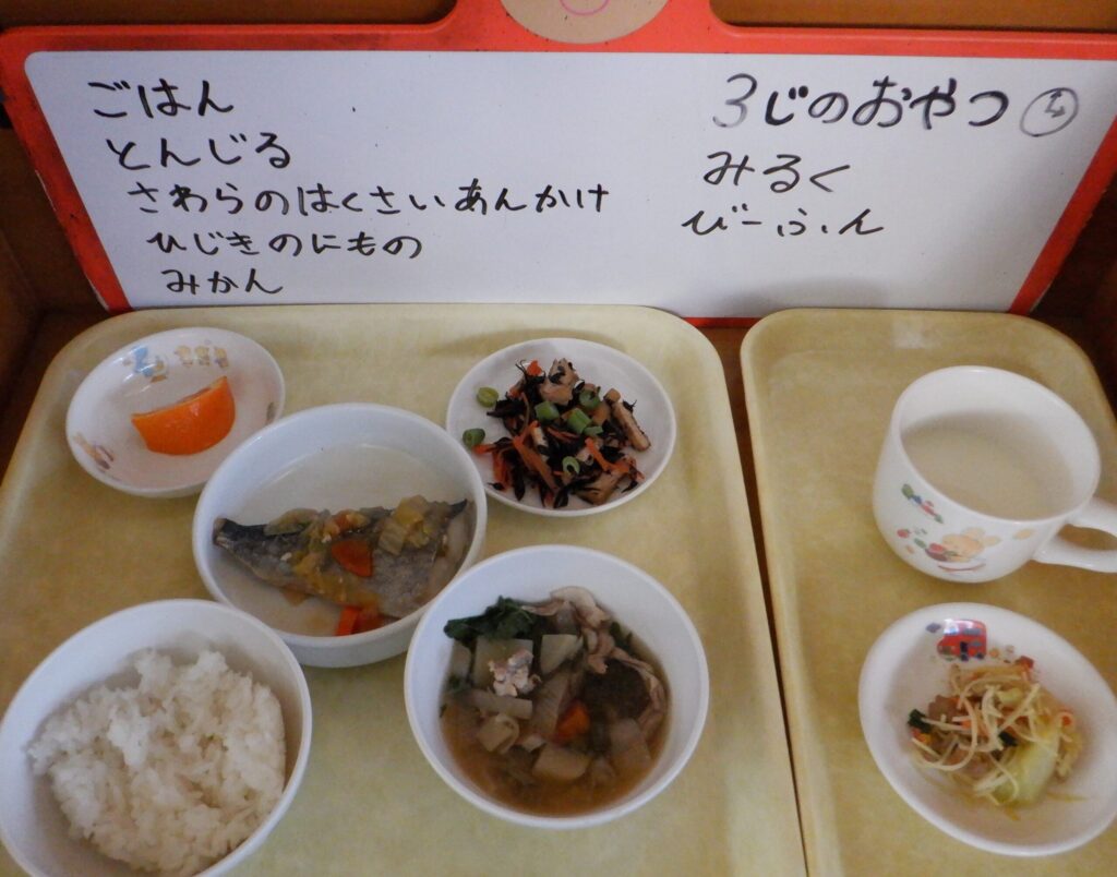 ・ごはん ・豚汁 ・さわらの白菜あんかけ ・ひじきの煮物 ・みかん