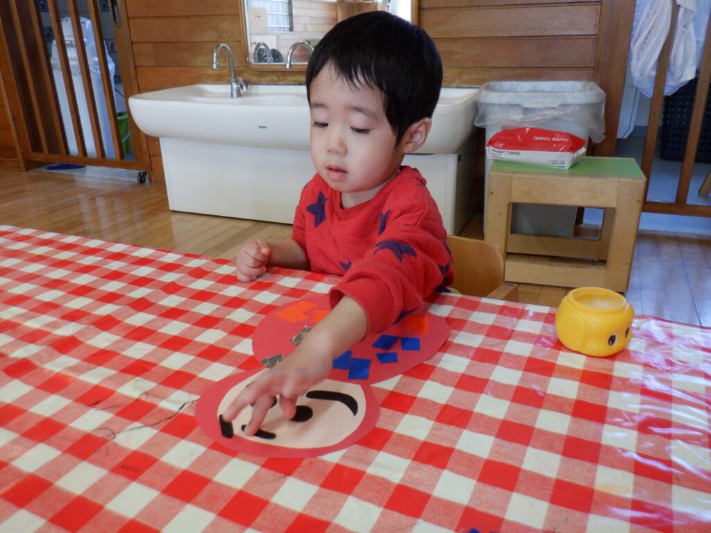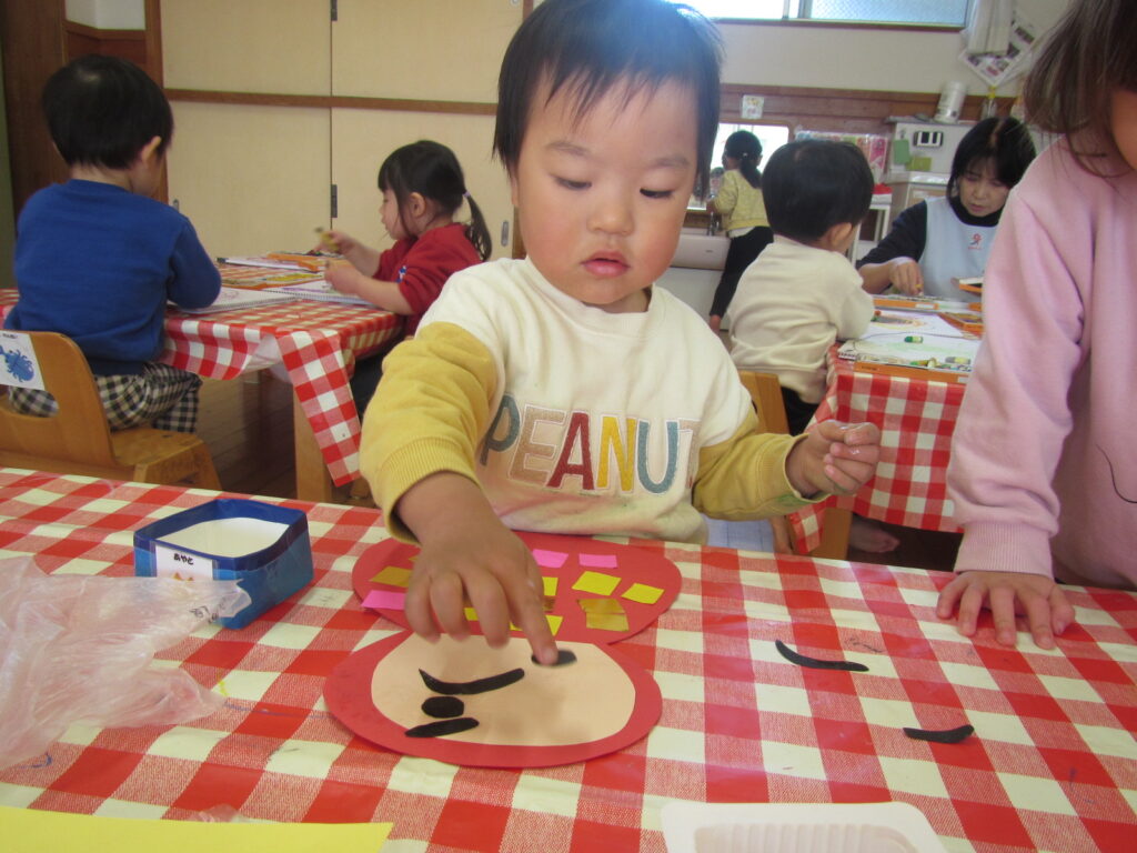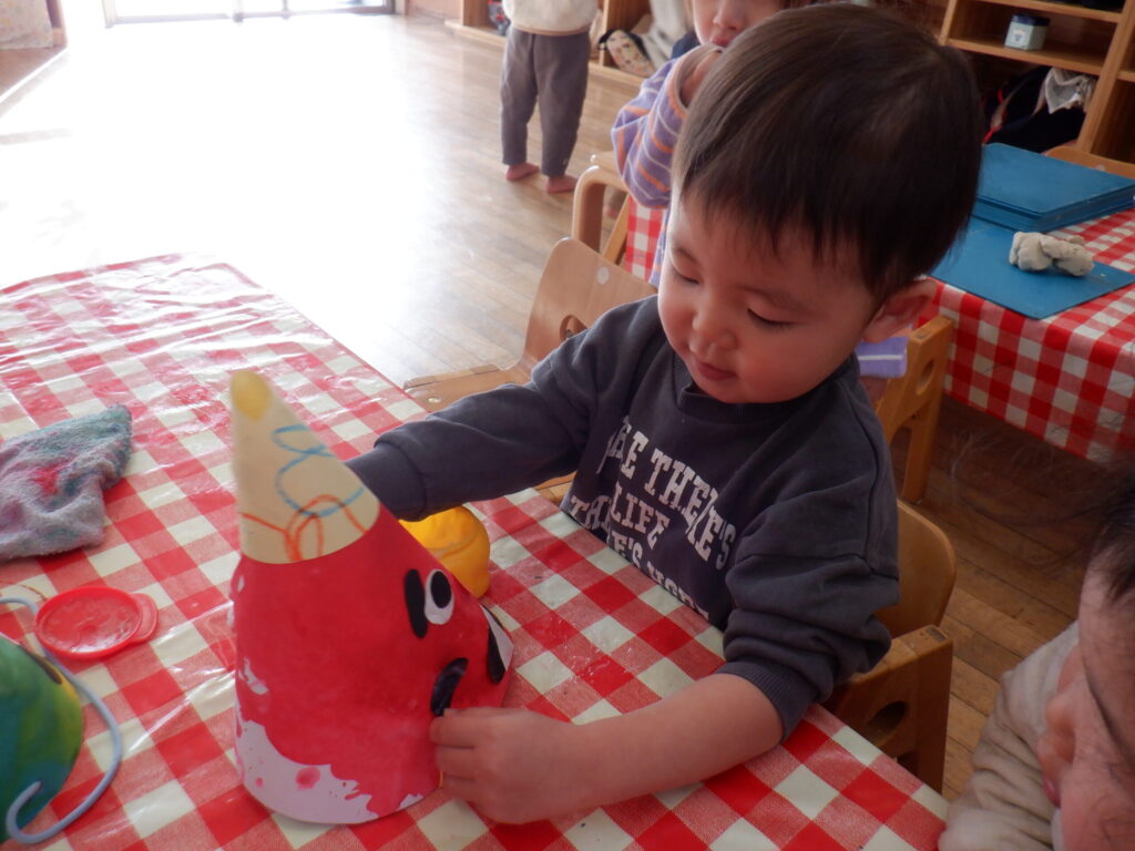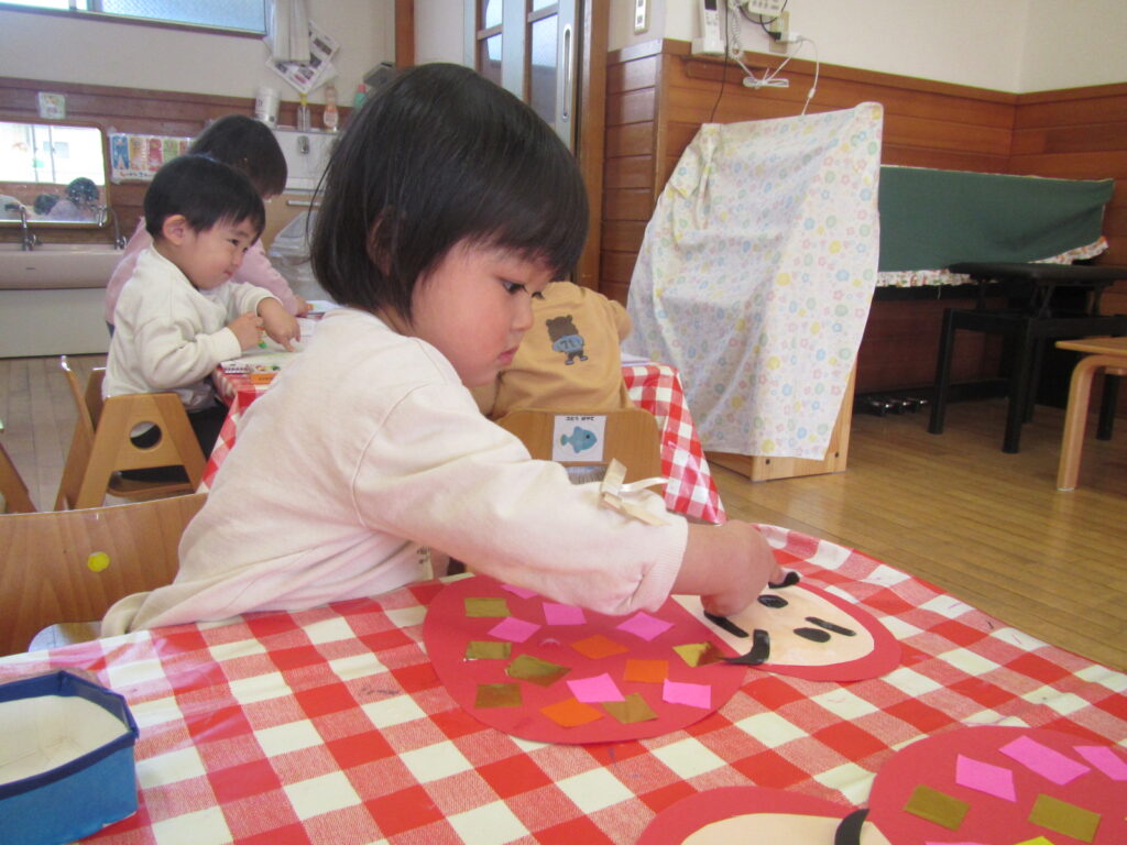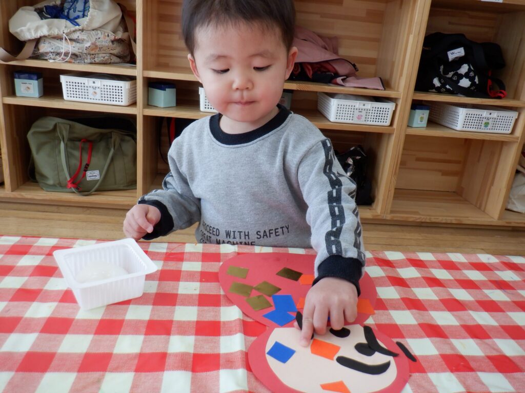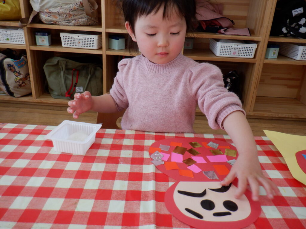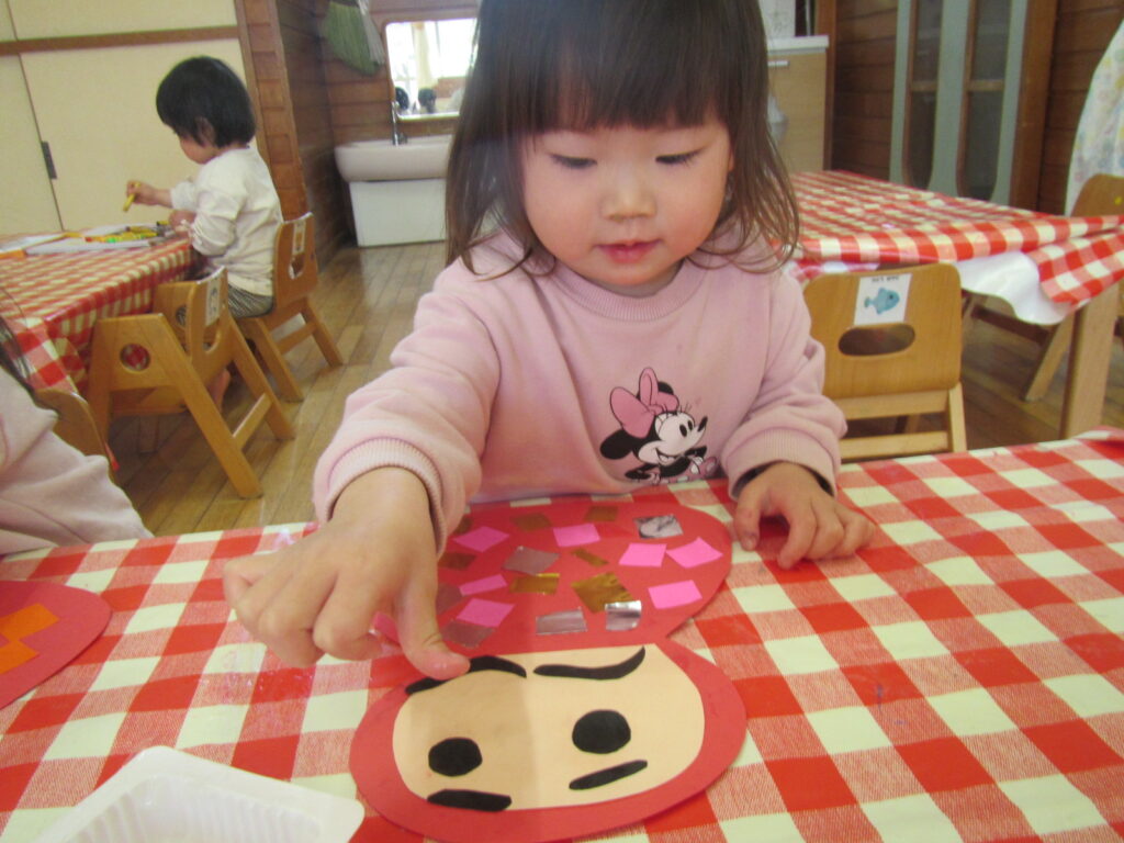 1月の製作の仕上げと、鬼のお面を作りました🎵みんな集中して顔を付けています☺